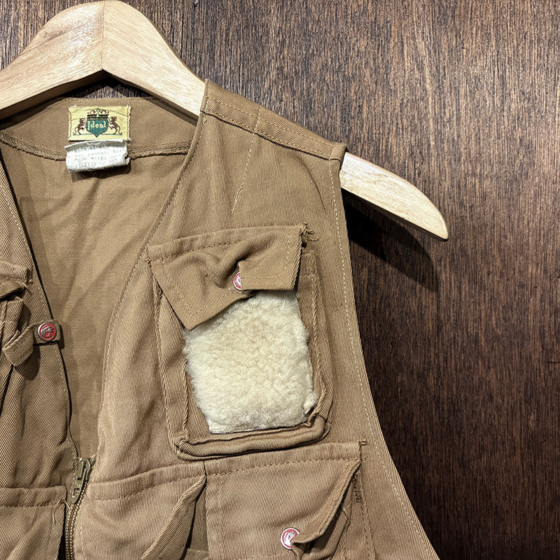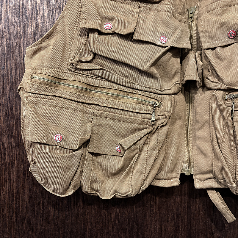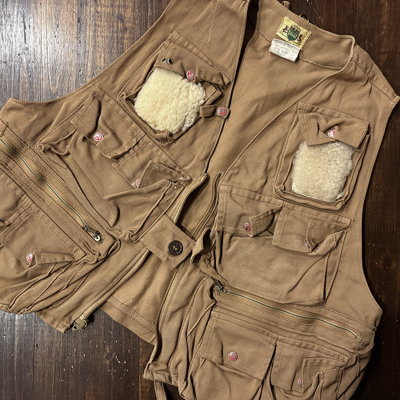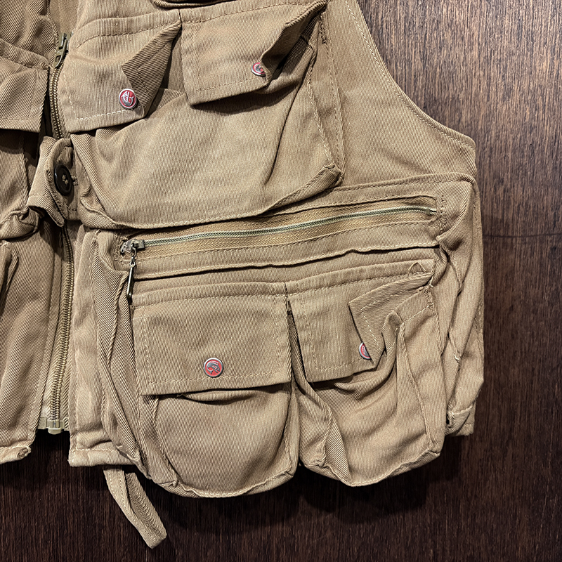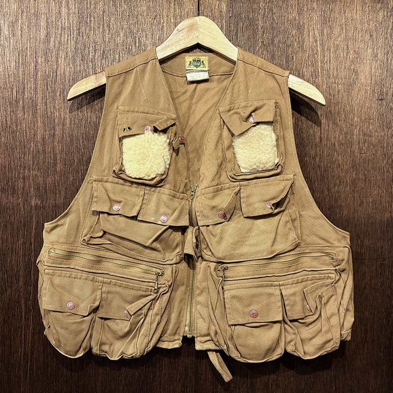 本品のフィッシングベストは、当時らしい堅牢な織りによる丈夫なコットン100%ツイル生地をベースにフィッシングに必要な大小の収納ポケットを大変多く配しジッパーはティアドロップタロンや剣先Talonジップとなっており、胸元ポケットにはフライドライヤームートンパッチやロッドホルダーループ、背面には大きなジッパー開閉のストックポケット、ホックで伸縮可能なネットリリーサーDリングなどなど、細部にわたる当時らしいディテールが雰囲気の良いビンテージベストです。