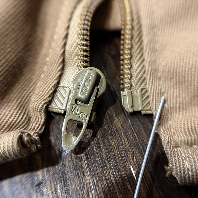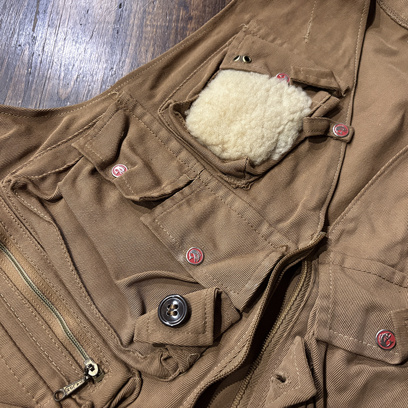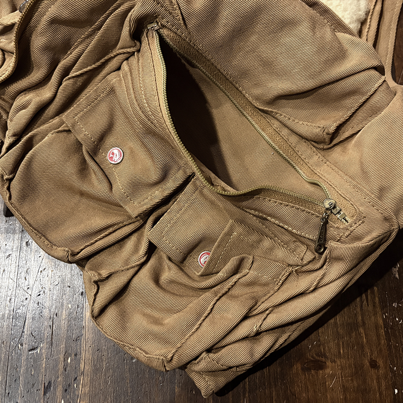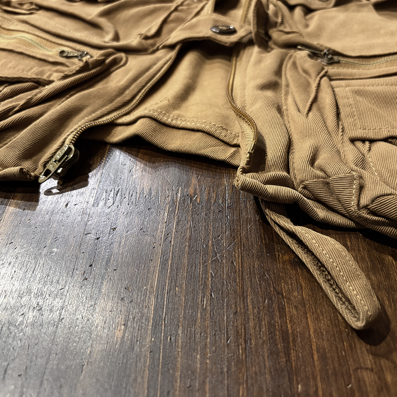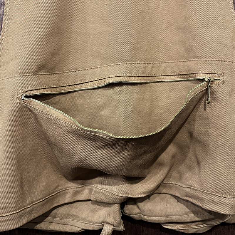 本品のフィッシングベストは、当時らしい堅牢な織りによる丈夫なコットン100%ツイル生地をベースにフィッシングに必要な大小の収納ポケットを大変多く配しジッパーはティアドロップタロンや剣先Talonジップとなっており、胸元ポケットにはフライドライヤームートンパッチやロッドホルダーループ、背面には大きなジッパー開閉のストックポケット、ホックで伸縮可能なネットリリーサーDリングなどなど、細部にわたる当時らしいディテールが雰囲気の良いビンテージベストです。