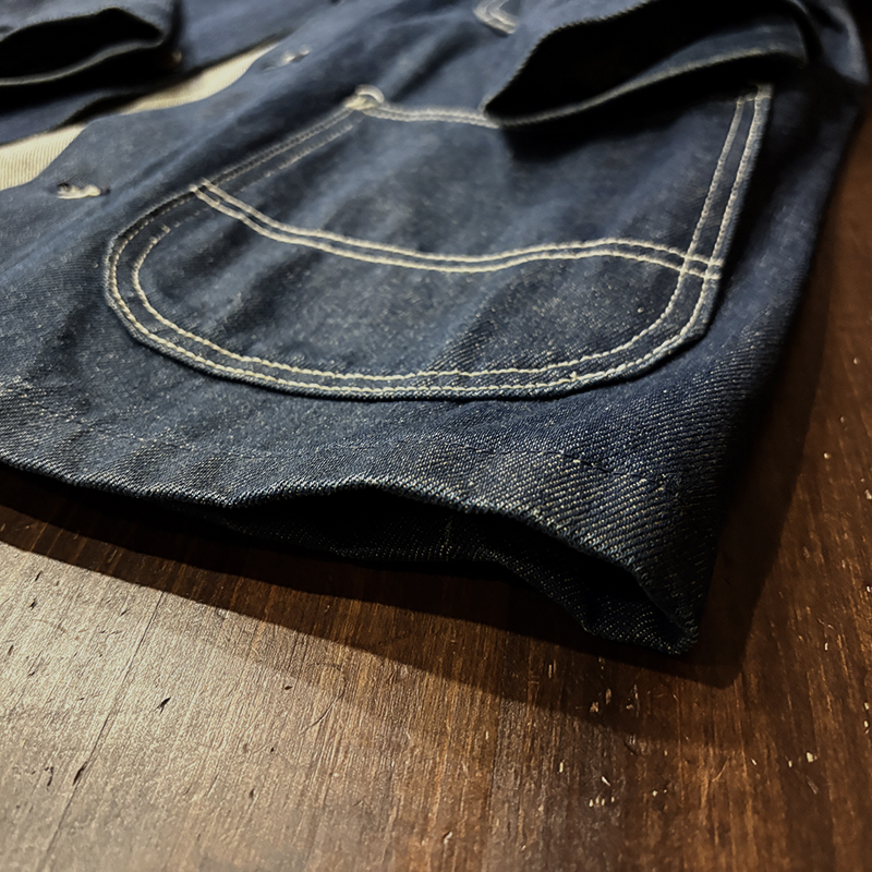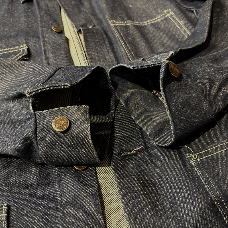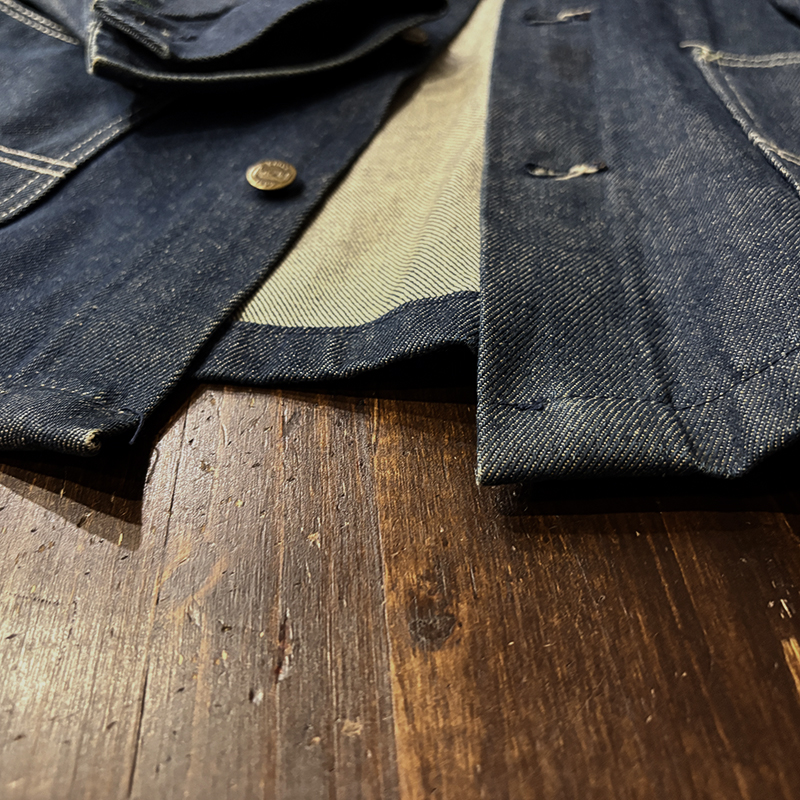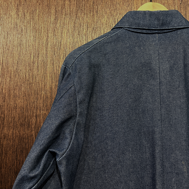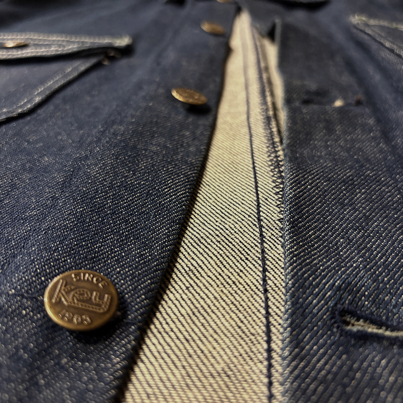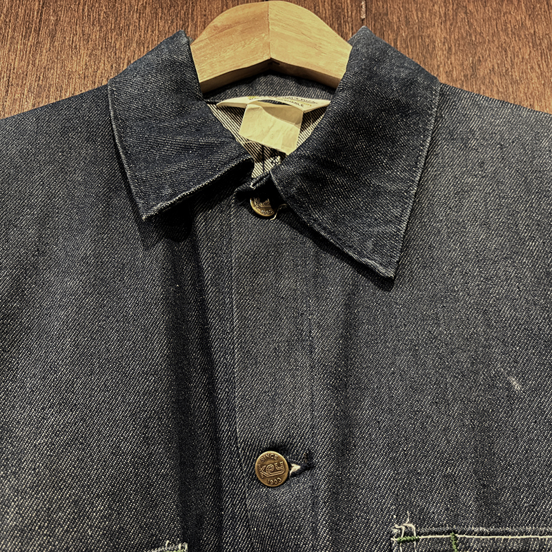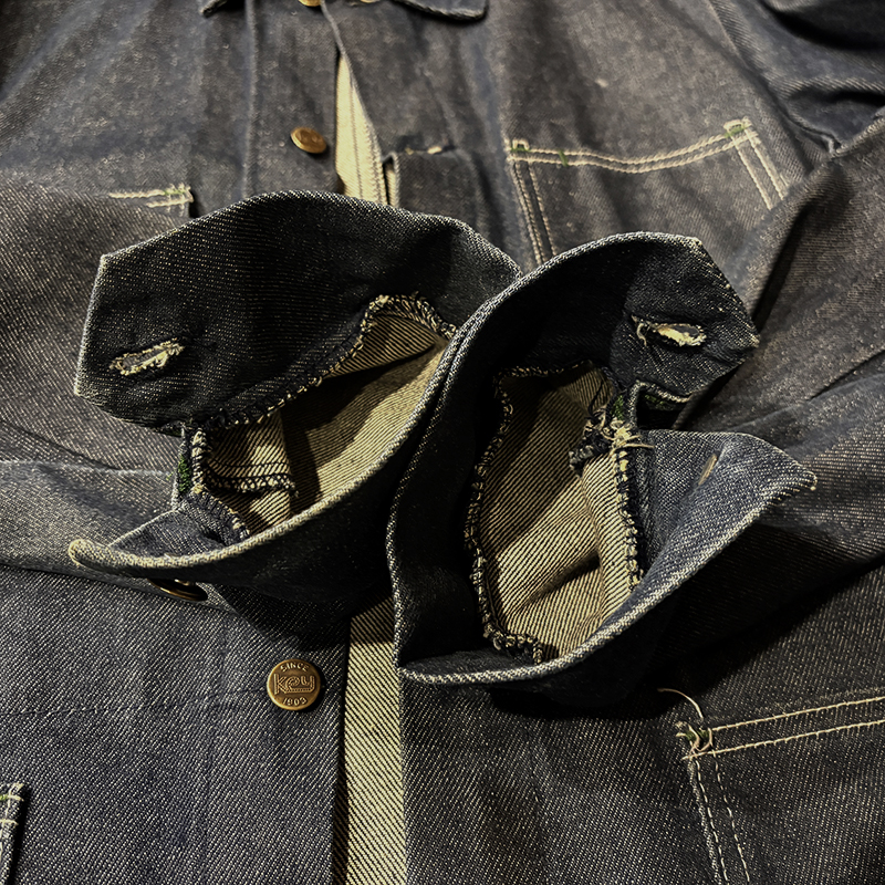 デニムはまだリジッド状態故、ツイルの畝感に粒立ちのあるざらっとした質感と共に大変濃いインディゴの色味がのこっており、襟元もデニムで統一された希少なディテールにフロントおよびアームのKey刻印のブラス掛けボタンも良いアクセントとなっており、当時らしい風格も感じることができる一着となっています。