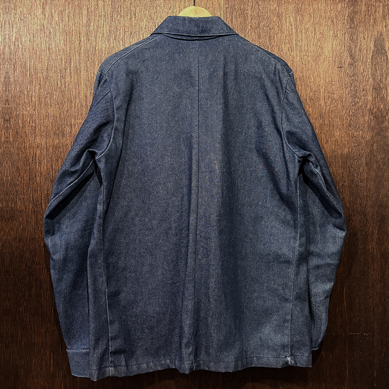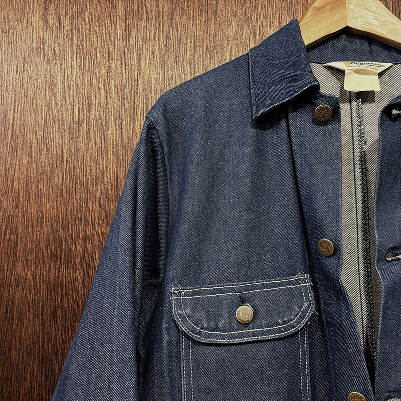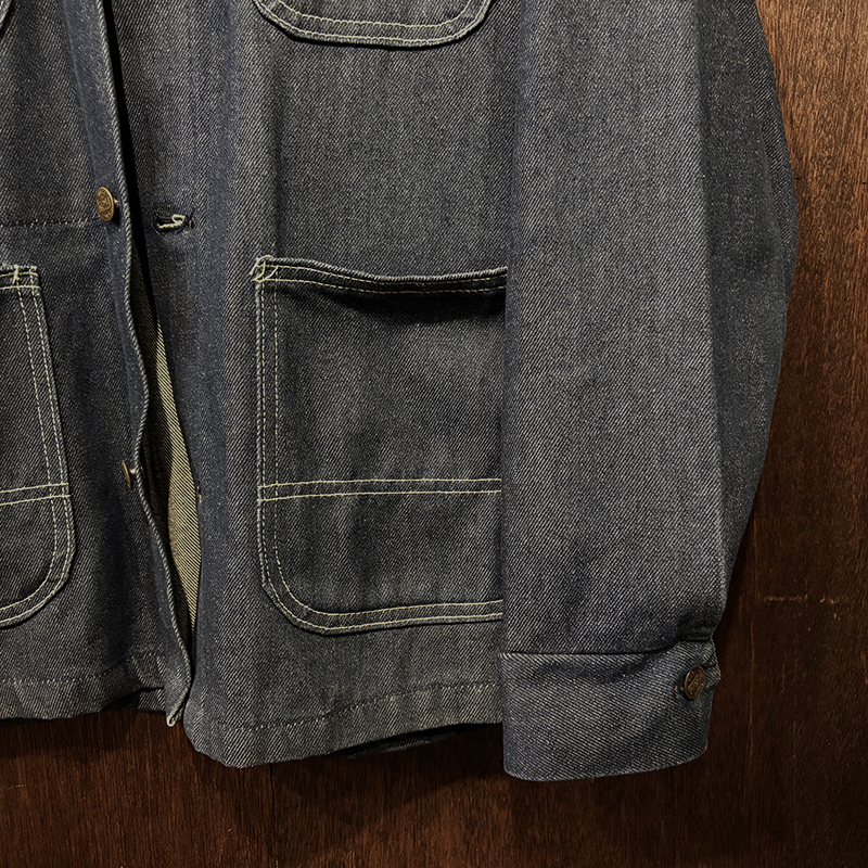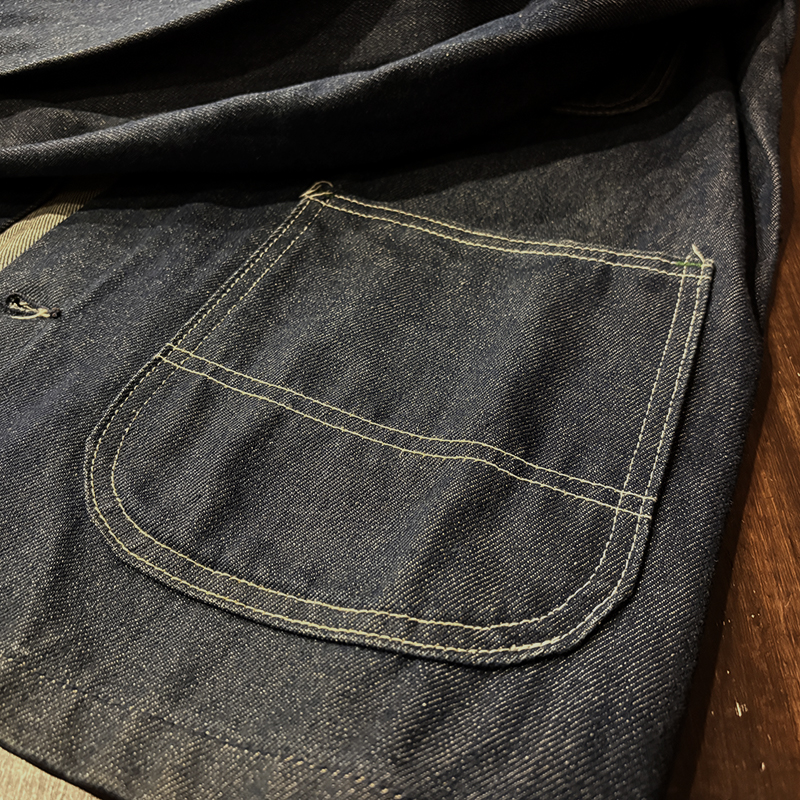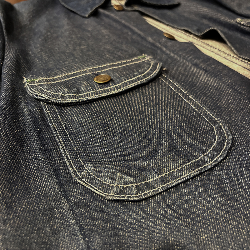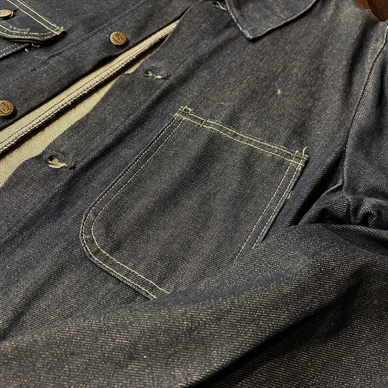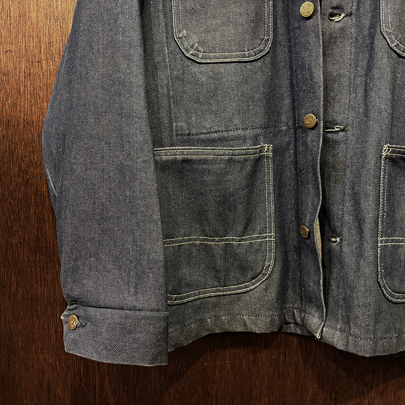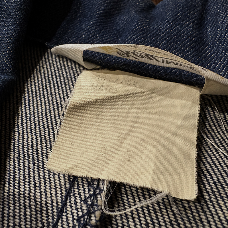 デニムはまだリジッド状態故、ツイルの畝感に粒立ちのあるざらっとした質感と共に大変濃いインディゴの色味がのこっており、襟元もデニムで統一された希少なディテールにフロントおよびアームのKey刻印のブラス掛けボタンも良いアクセントとなっており、当時らしい風格も感じることができる一着となっています。