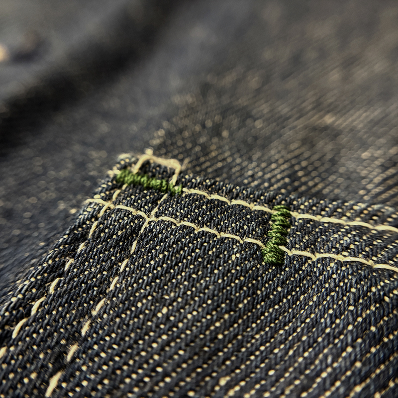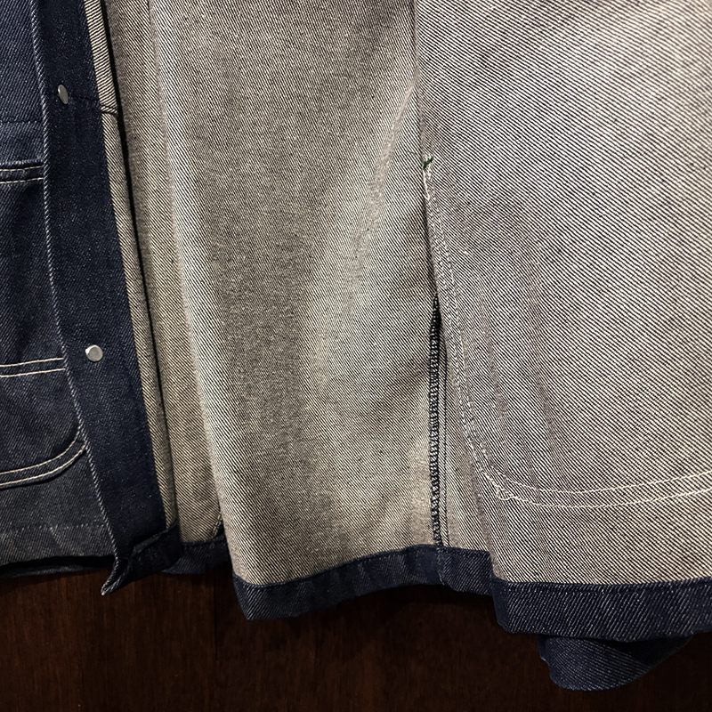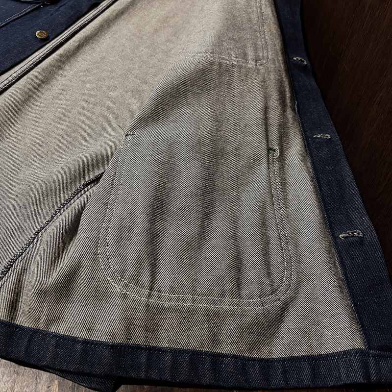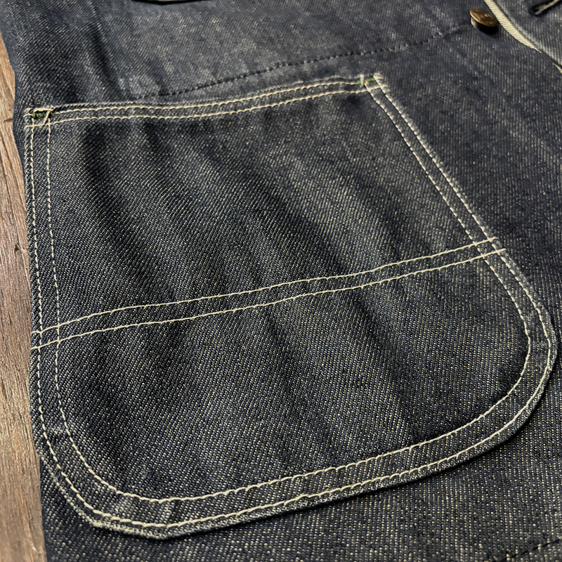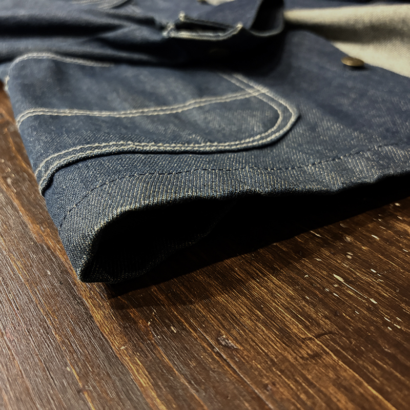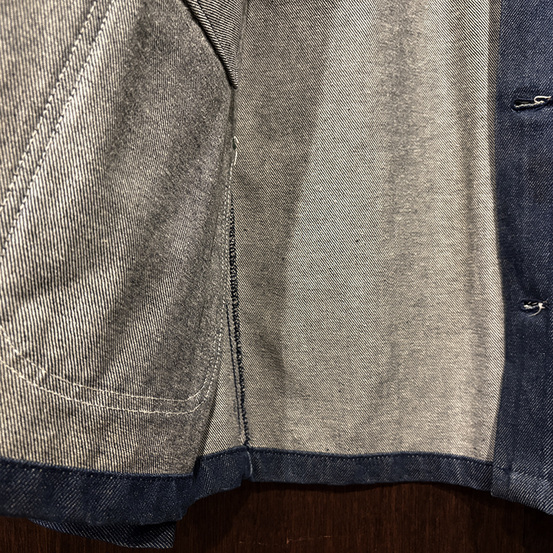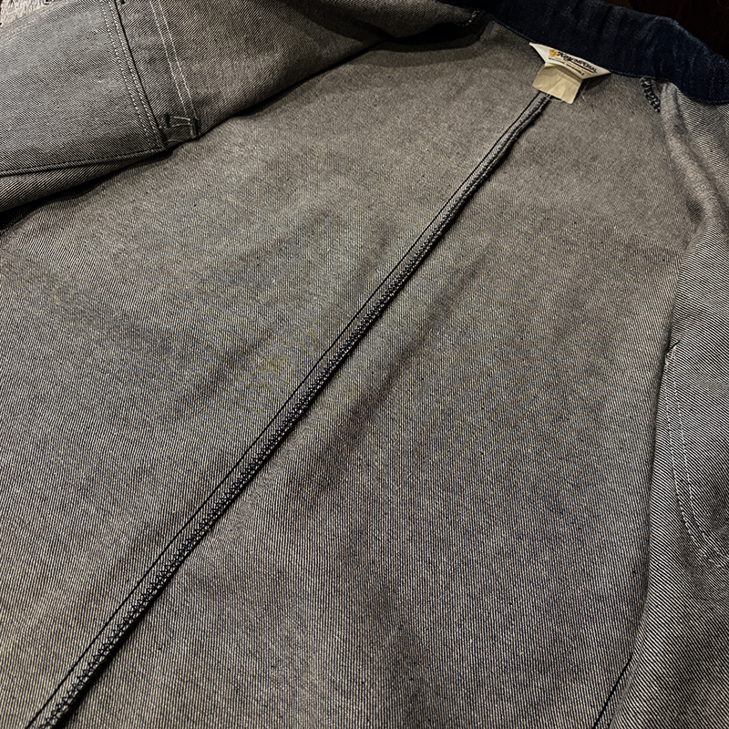 デニムはまだリジッド状態故、ツイルの畝感に粒立ちのあるざらっとした質感と共に大変濃いインディゴの色味がのこっており、襟元もデニムで統一された希少なディテールにフロントおよびアームのKey刻印のブラス掛けボタンも良いアクセントとなっており、当時らしい風格も感じることができる一着となっています。