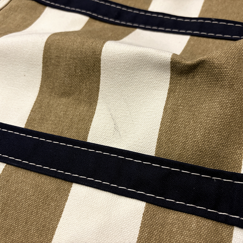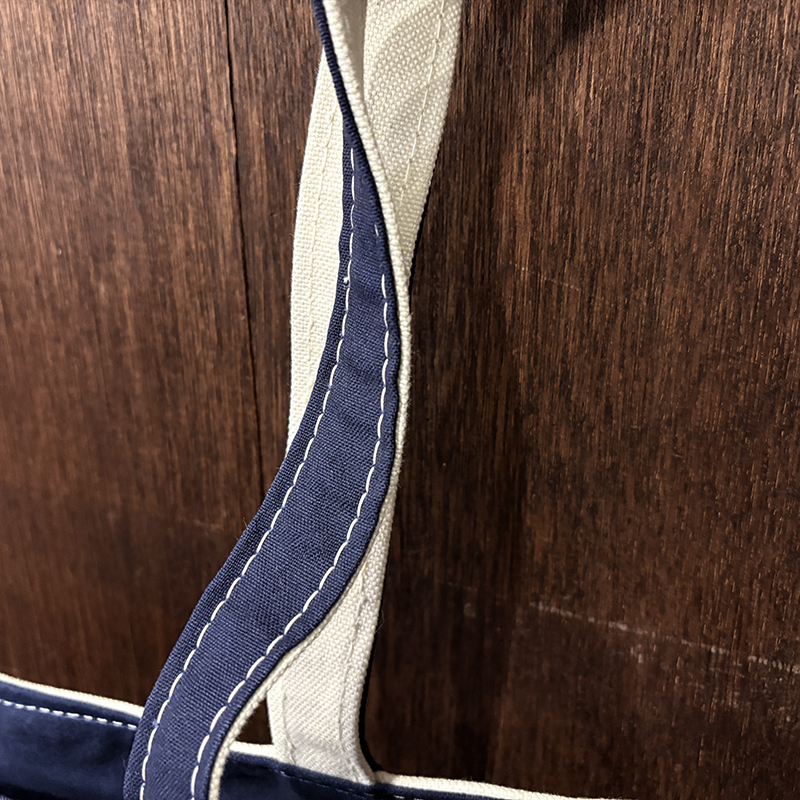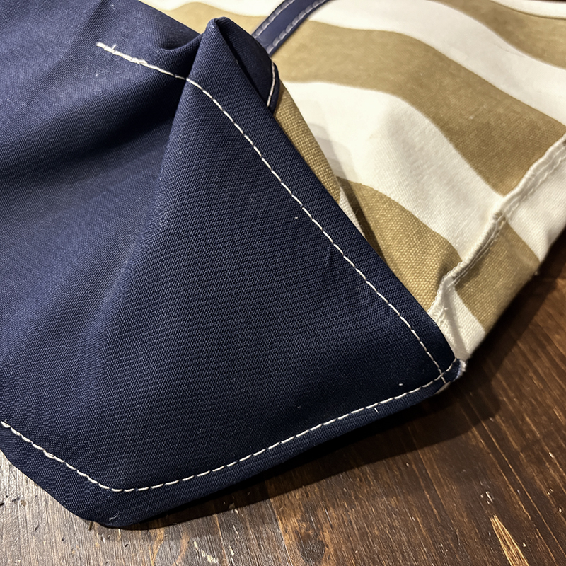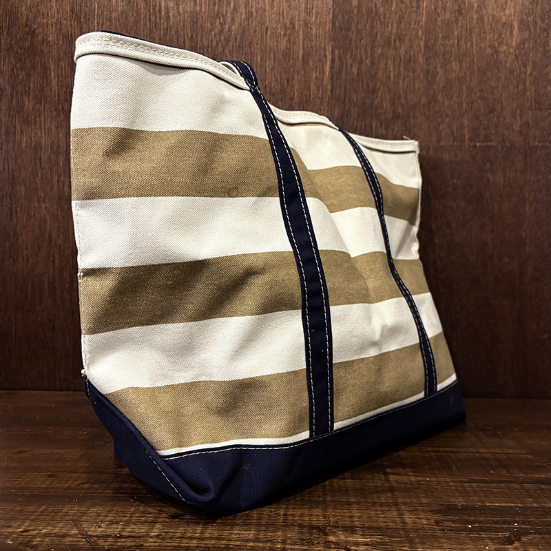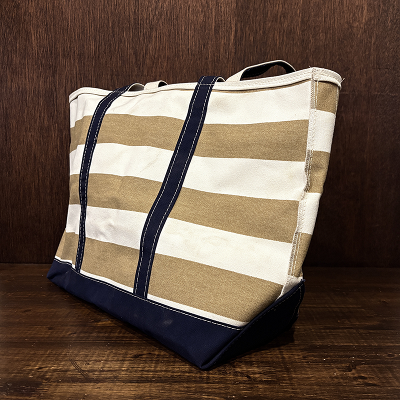 本品はエルエルビーンのボート アンド トートシリーズの中でもボディがミドルトーンのコヨーテブラウンとアイボリーのボーダー仕様の希少な組み合わせのカラートート、素材には定番の堅牢な厚手のキャンバスとネイビートリムおよびボトムによるバイカラーの配色が印象的なボートアンドトートです。