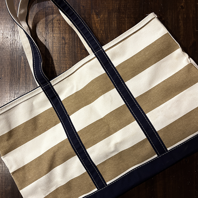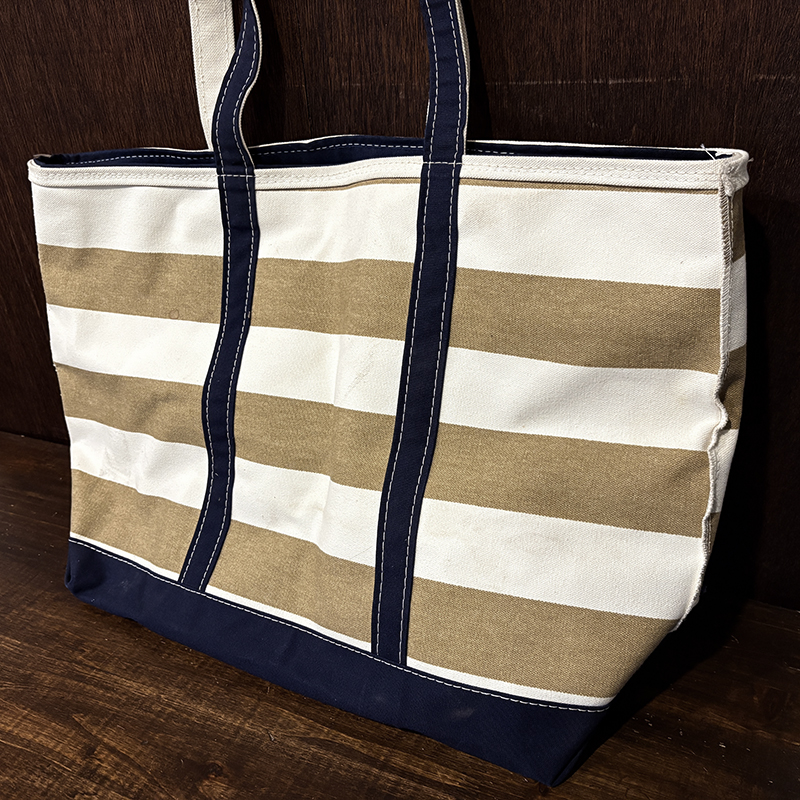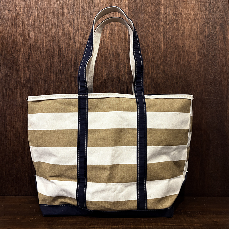 L.L. Bean Boat and Tote Coyote Brown Ivory Border / Navy Tote Bag Zip Top Size L Made in USA Mint エルエルビーン ボート アンド トート コヨーテブラウン アイボリー ボーダー カラートートバッグ オールド ジップトップ仕様 米国製 ミントコンディション のご紹介です。