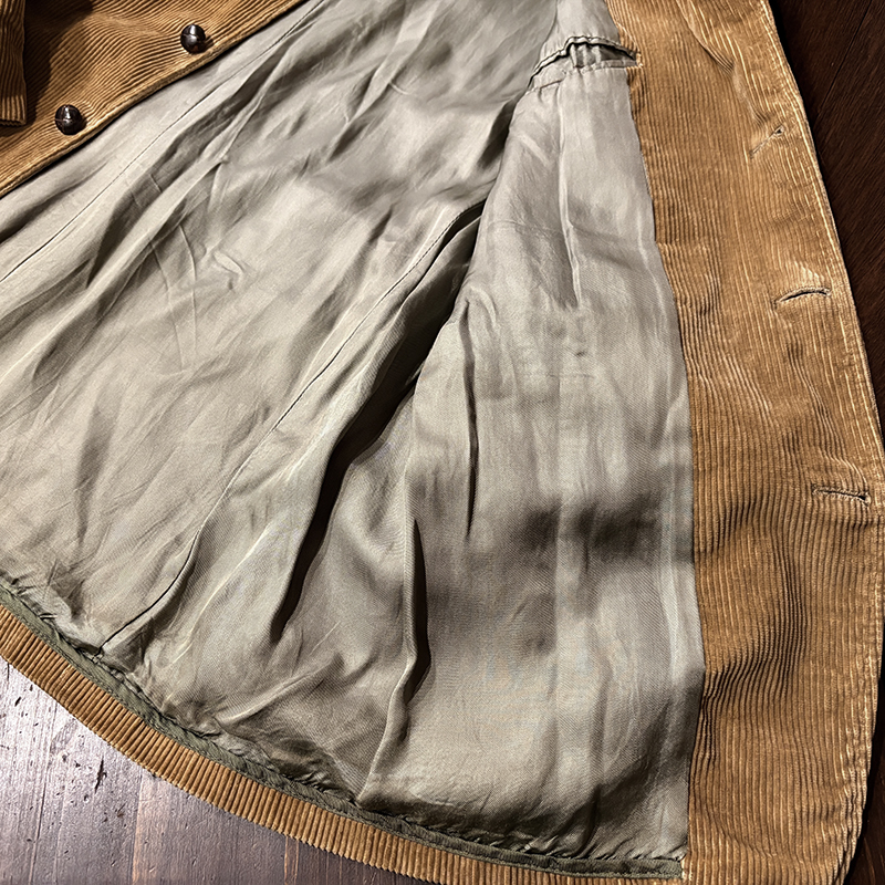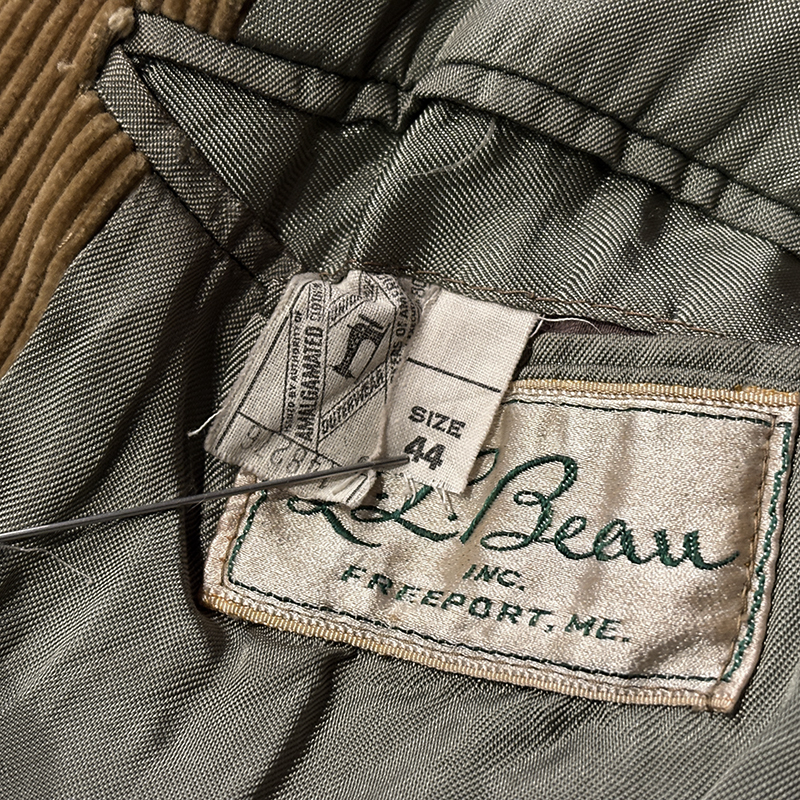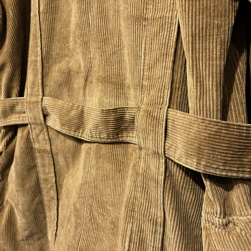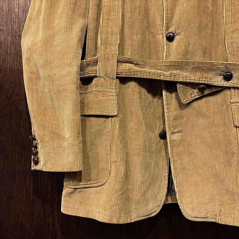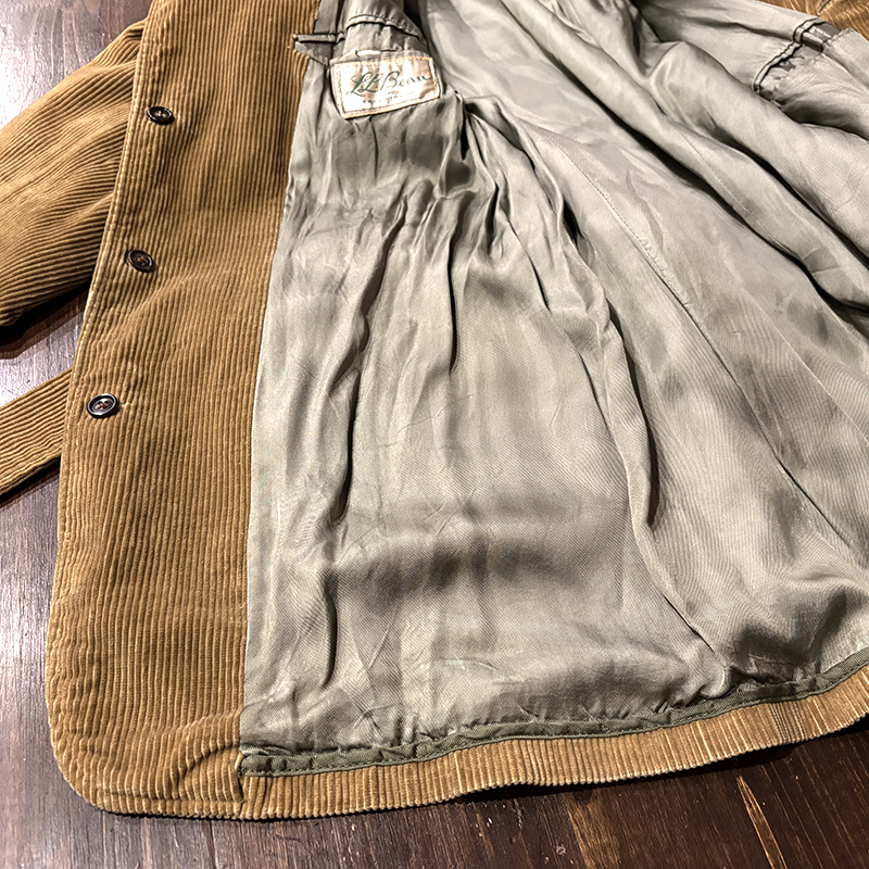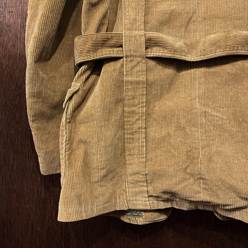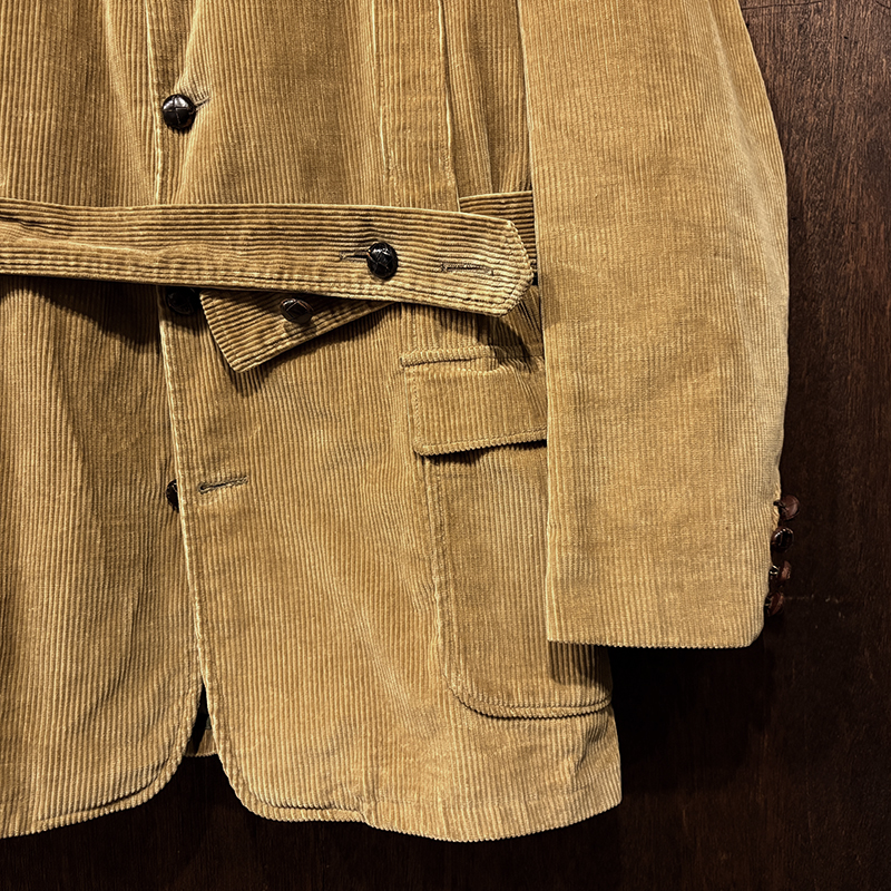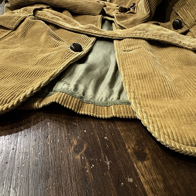 本個体はビーンのアウトドアジャケットでも大変古いビンテージモデルでタグは通称で筆記体タグと呼ばれている60年代当時の貴重な一着、メイン生地は肉厚で太畝のキャメルブラウンのヘビーコーデュロイ仕様でノーフォーク特有の身頃にあるフロントバーチカルバンドにウェストベルトを通し腰位置に固定することで、ハンティングなどの際のポケット内の重量物の安定したホールドやジャケットの身体へのフィットをより実現するなど、ノーフォークらしいデザインが効いたデザインとなっています。