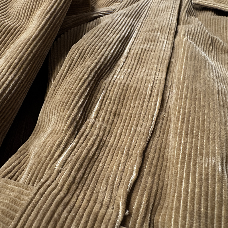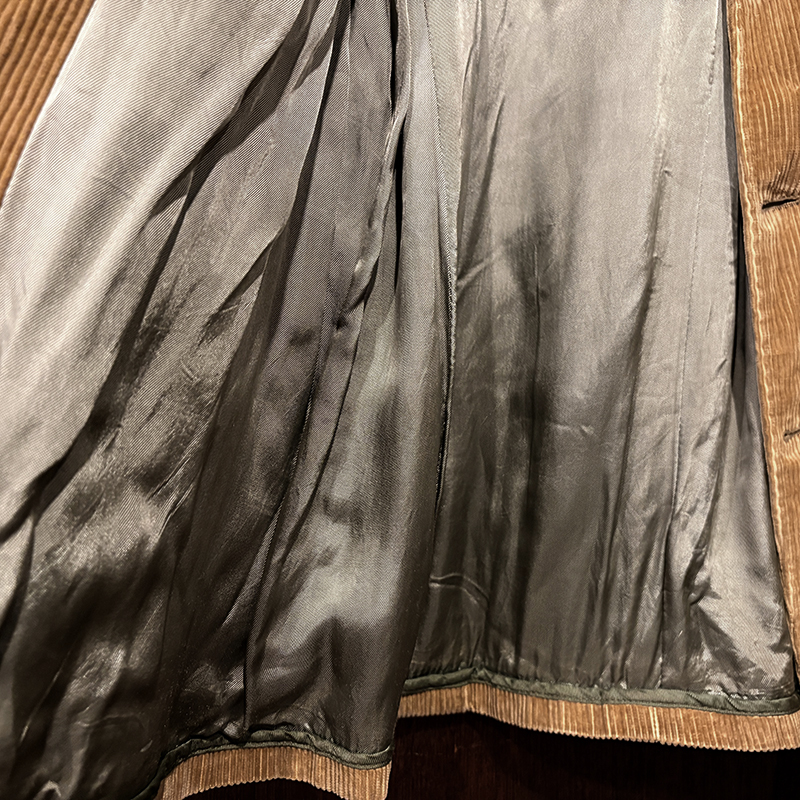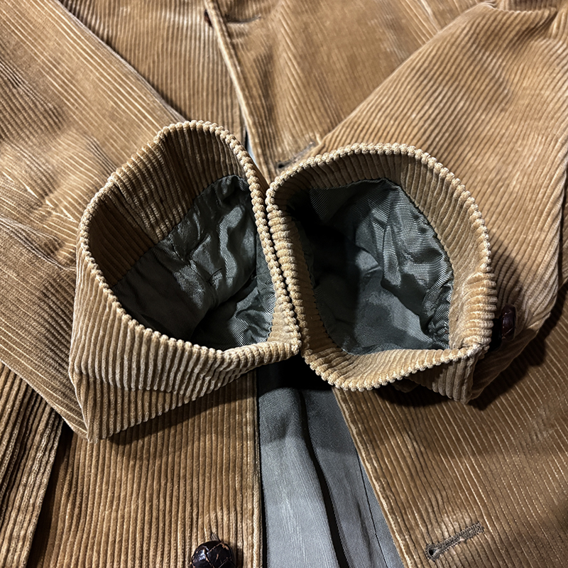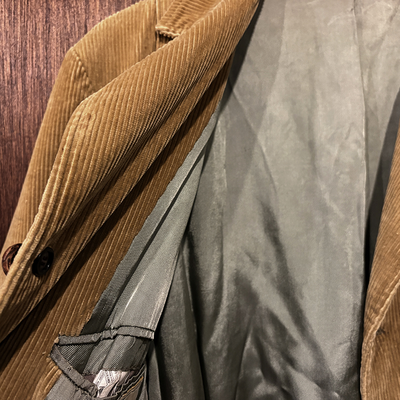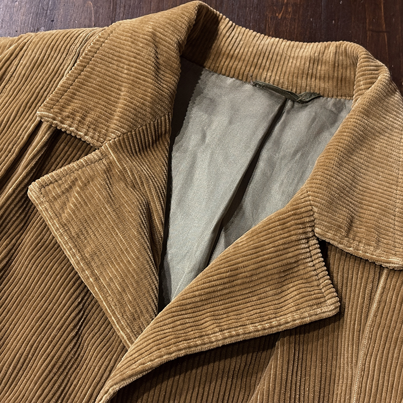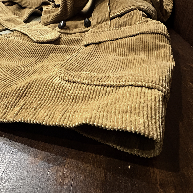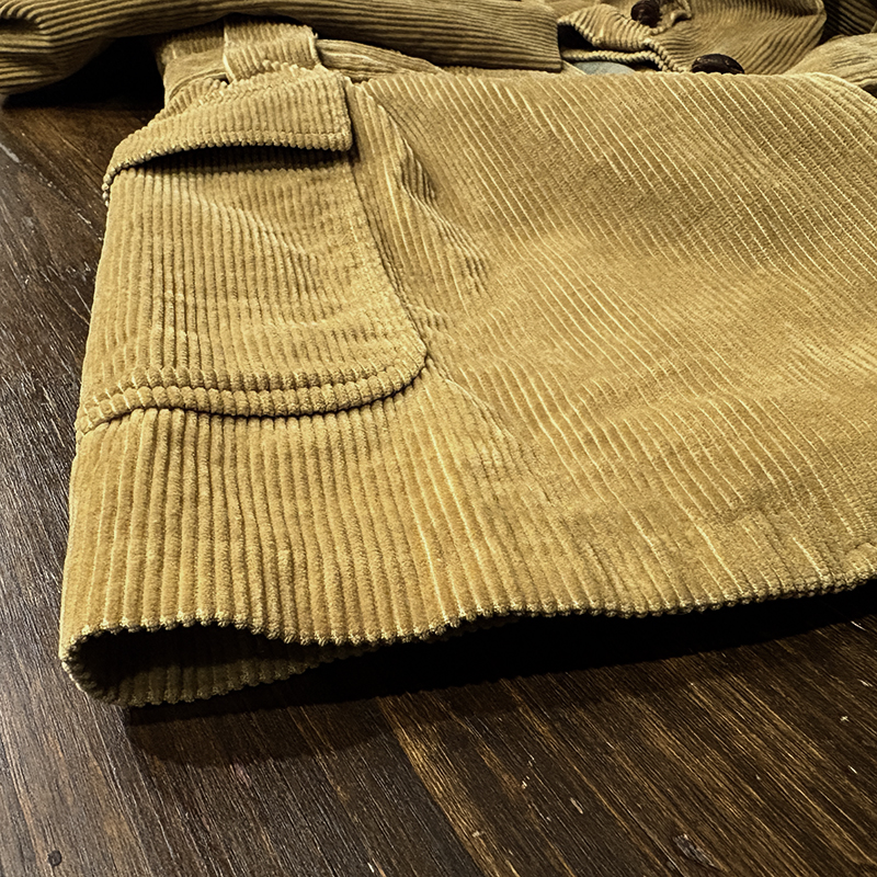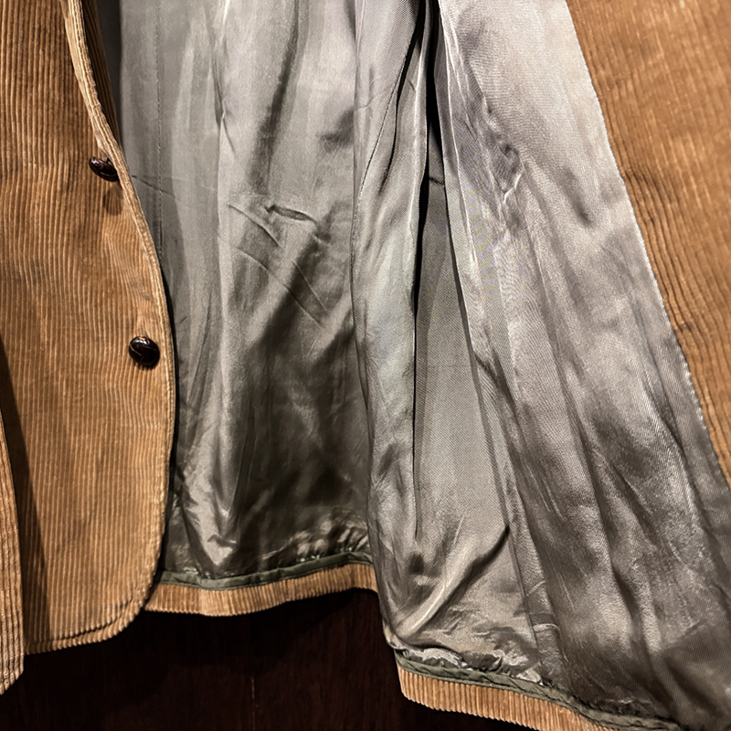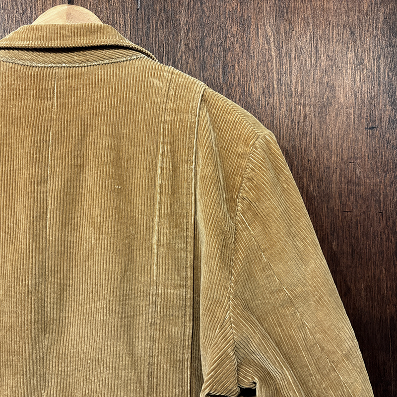 本個体はビーンのアウトドアジャケットでも大変古いビンテージモデルでタグは通称で筆記体タグと呼ばれている60年代当時の貴重な一着、メイン生地は肉厚で太畝のキャメルブラウンのヘビーコーデュロイ仕様でノーフォーク特有の身頃にあるフロントバーチカルバンドにウェストベルトを通し腰位置に固定することで、ハンティングなどの際のポケット内の重量物の安定したホールドやジャケットの身体へのフィットをより実現するなど、ノーフォークらしいデザインが効いたデザインとなっています。