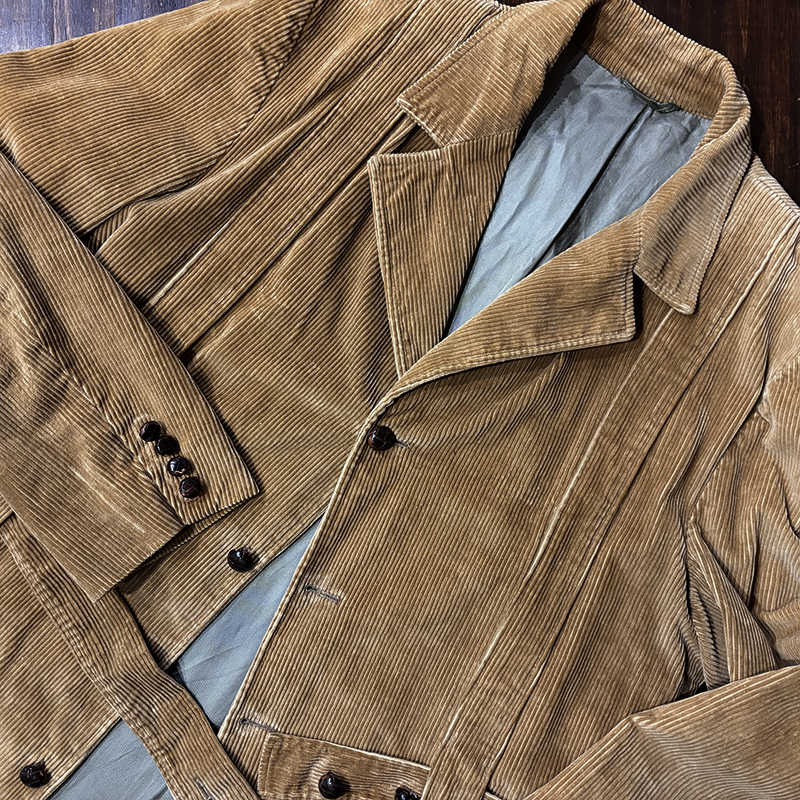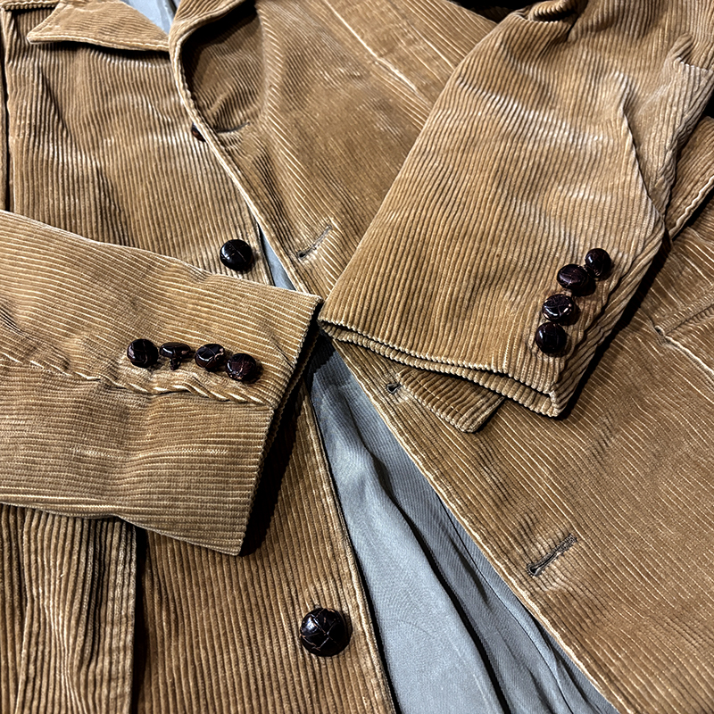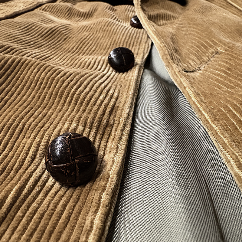 襟周りは当時のノーフォークジャケットでしばしば採用されていたラペルタイプでフロントボタンはクラシカルなレザーのくるみボタンで袖ボタンも同じ仕様となっています。