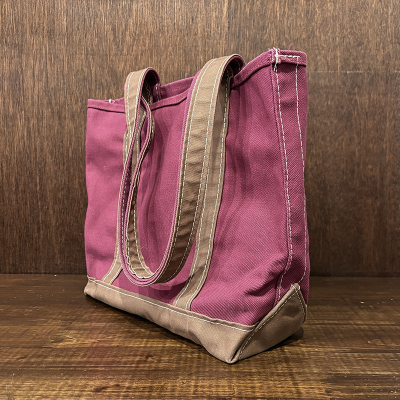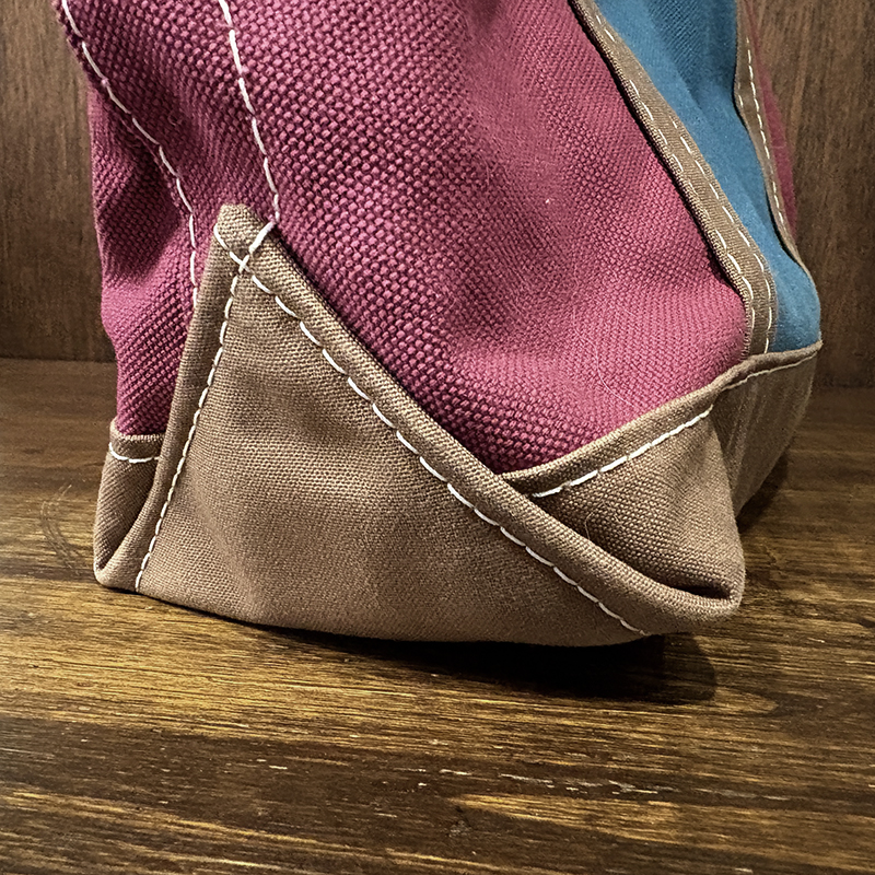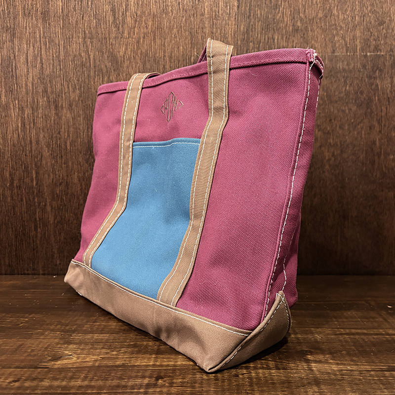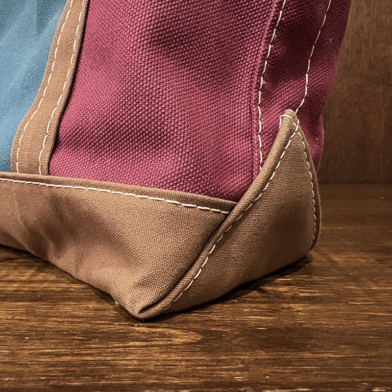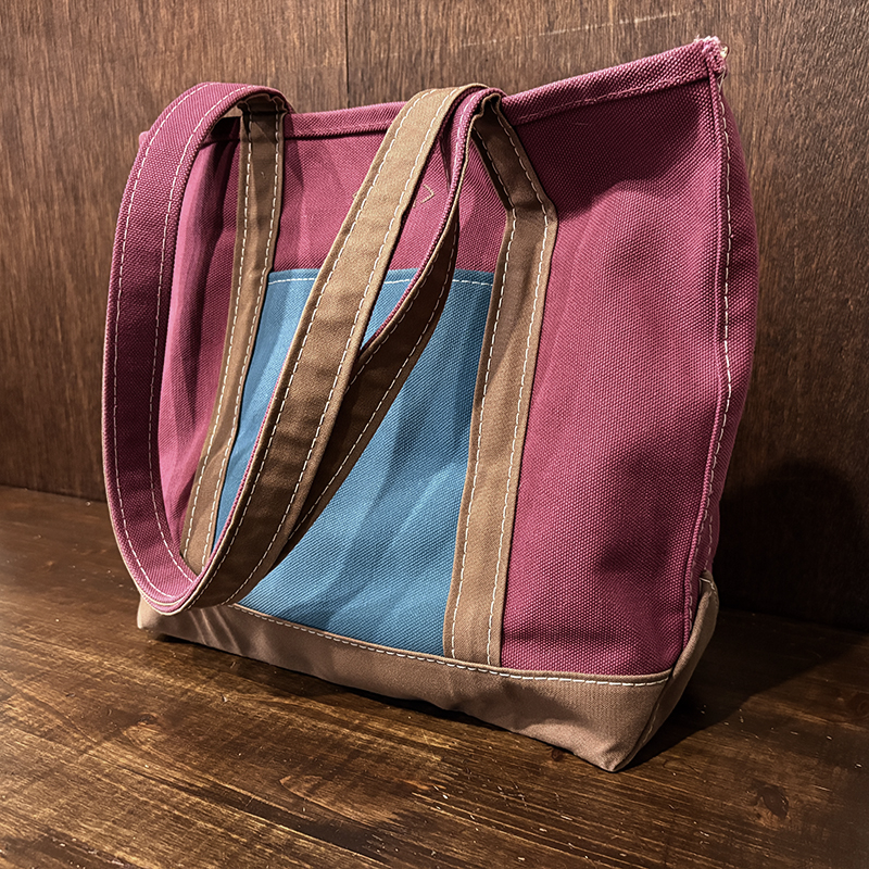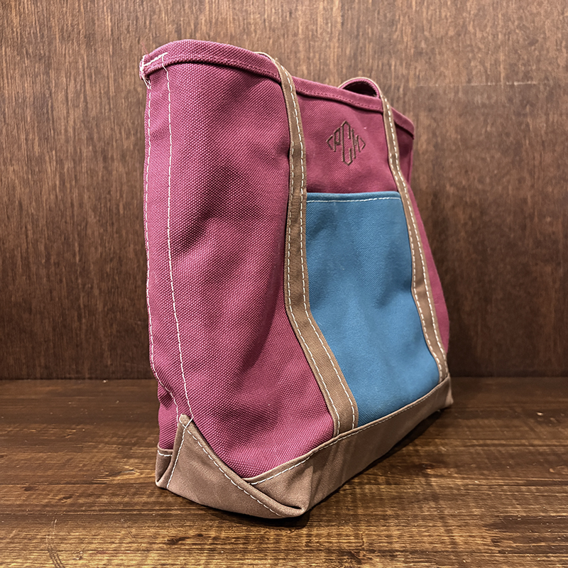 ヘビーキャンバスのボディカラーはちょうどパープル寄りのワインカラーとなっており、ハンドルやボトム部分はモカブラウン、サイドポケットはターコイズカラーと通常のラインでは設定されていない3トーンコンビカラーのトートとなっています。