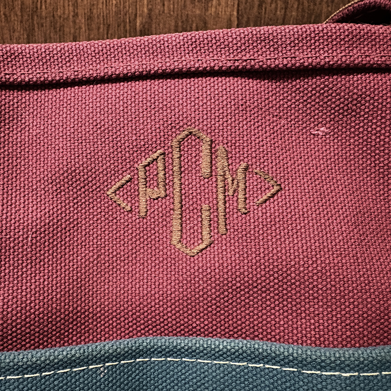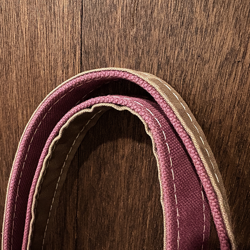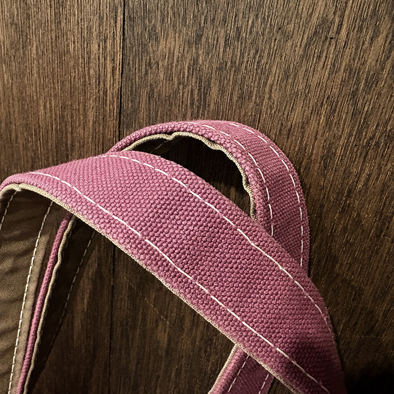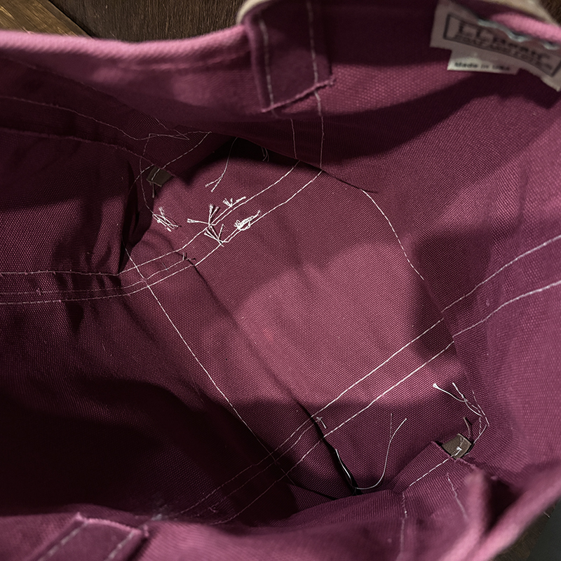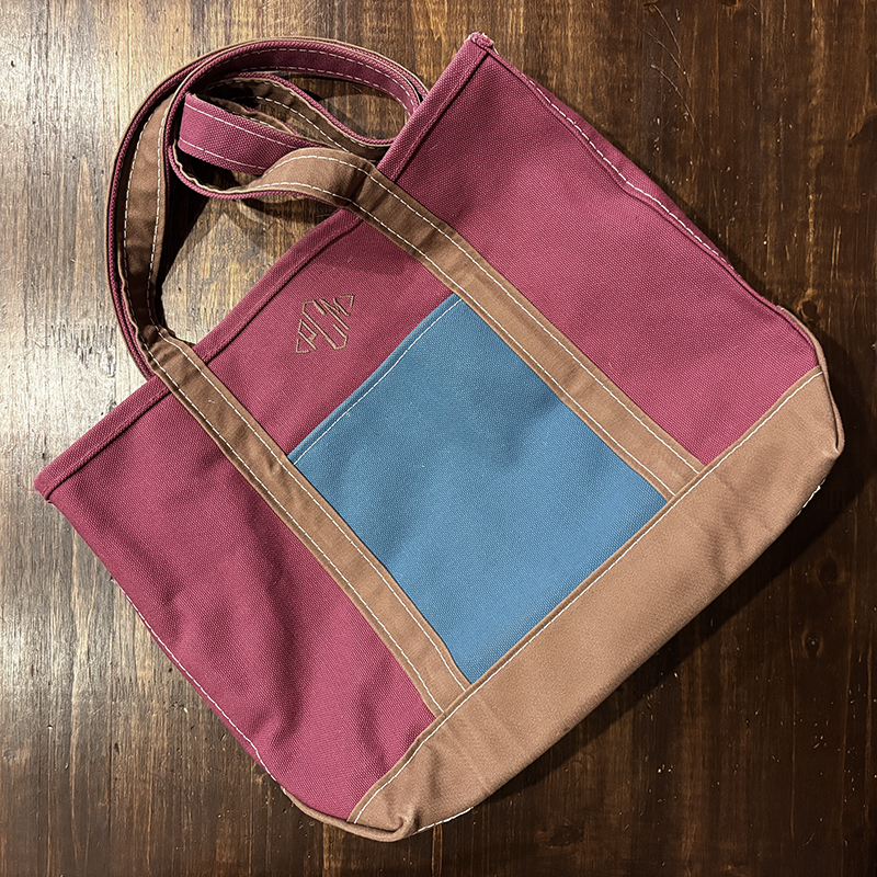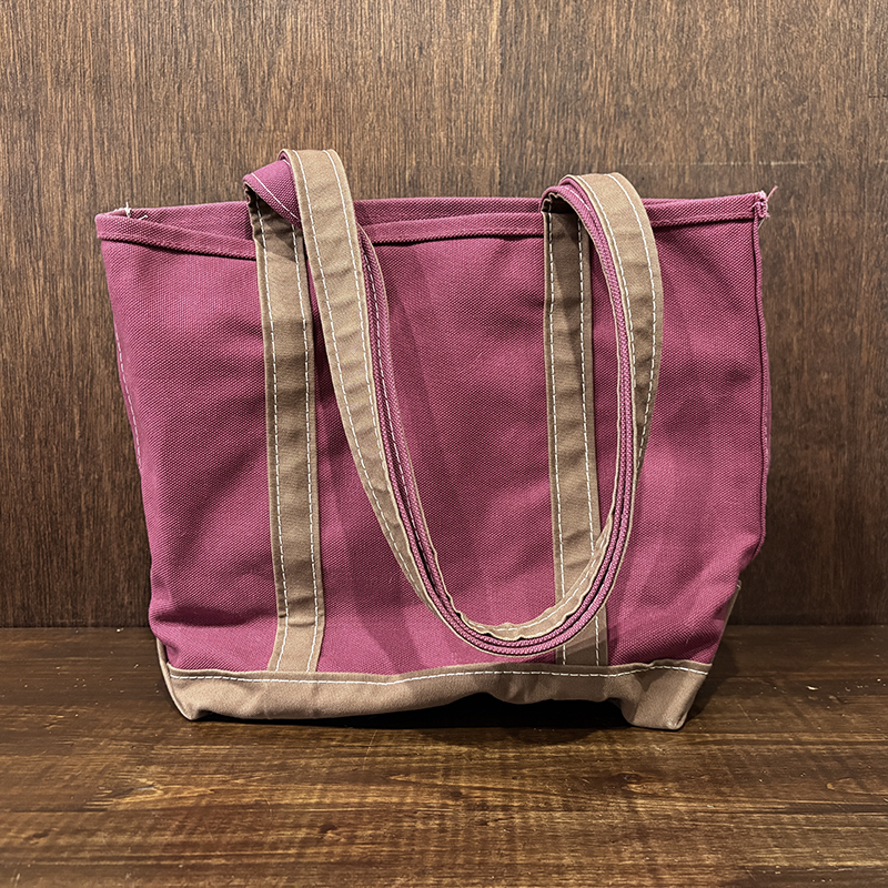 ヘビーキャンバスのボディカラーはちょうどパープル寄りのワインカラーとなっており、ハンドルやボトム部分はモカブラウン、サイドポケットはターコイズカラーと通常のラインでは設定されていない3トーンコンビカラーのトートとなっています。