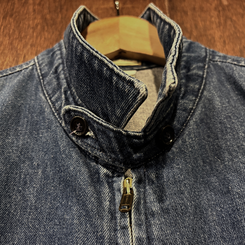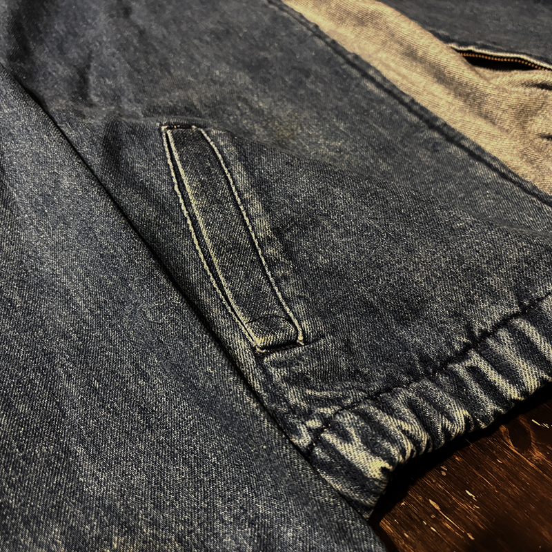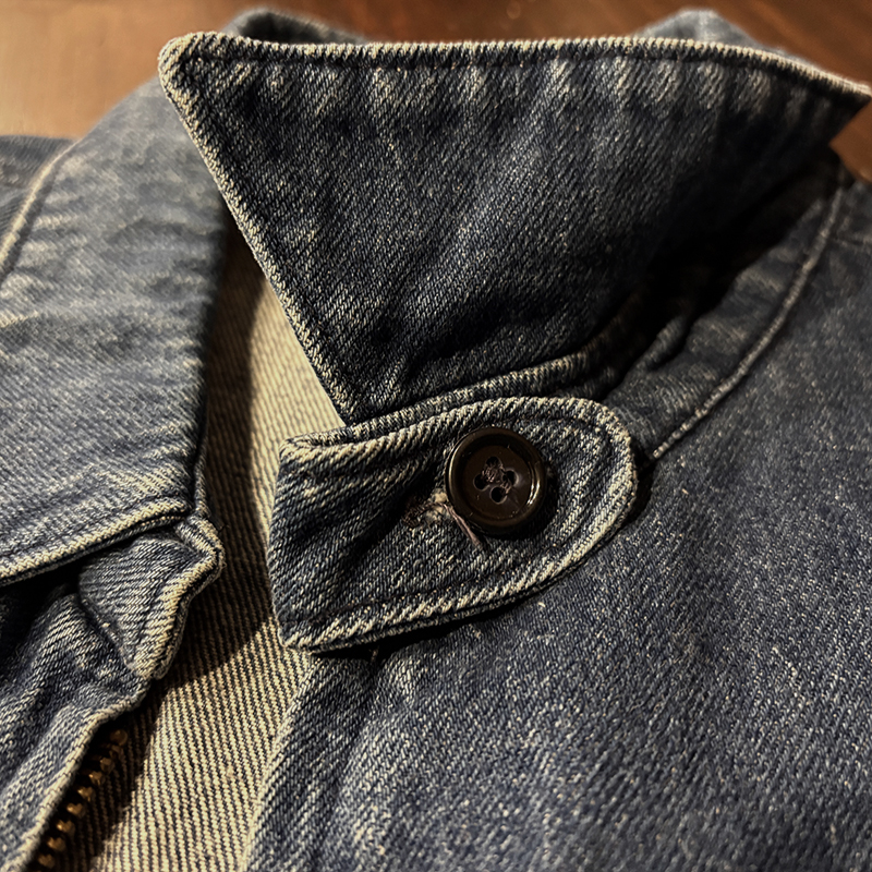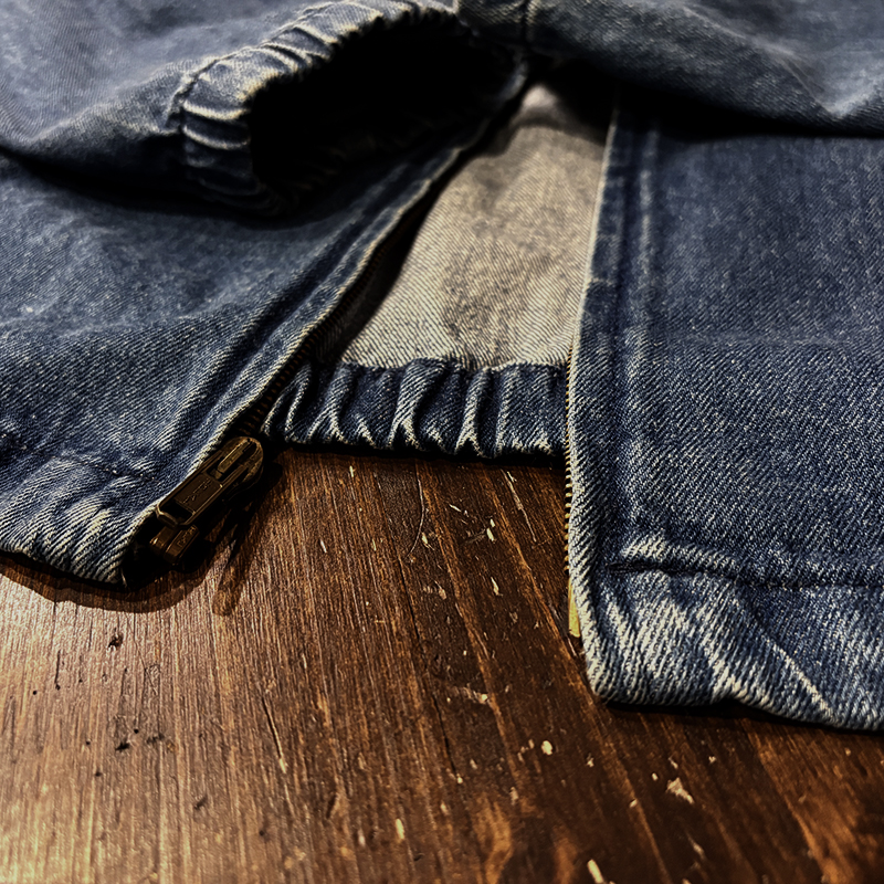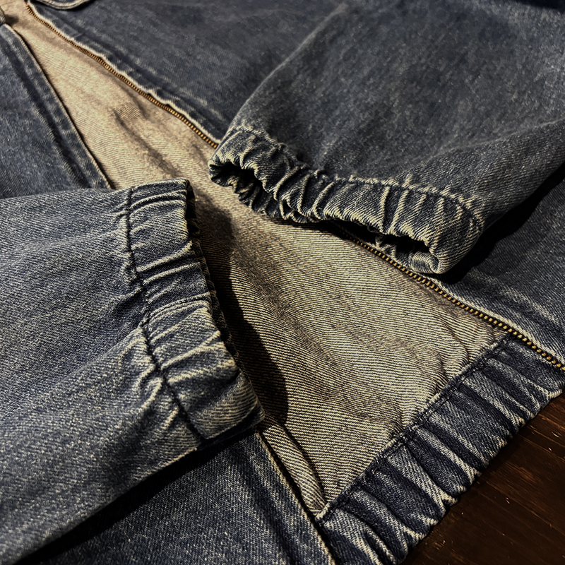 本品は厚手のデニム素材によるショートレングスのドリズラーブルゾンジャケット、首元にはチンストが付き、フロントは当時のIDEALブラスジッパー、ポケットはシンプルに左右のスリットハンドウォーマー、袖周りや裾周りはギャザーリングが施されており、動きやすさにも配慮されたクラシカルなドリズラースタイルのデニムブルゾンとなっています。