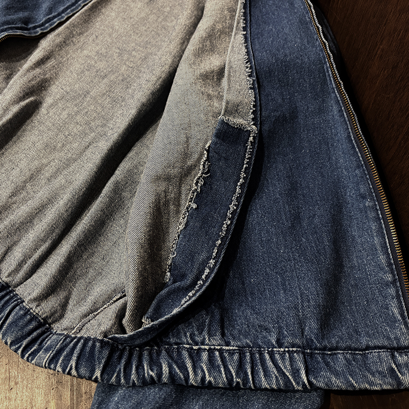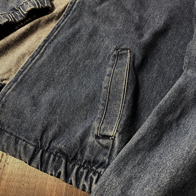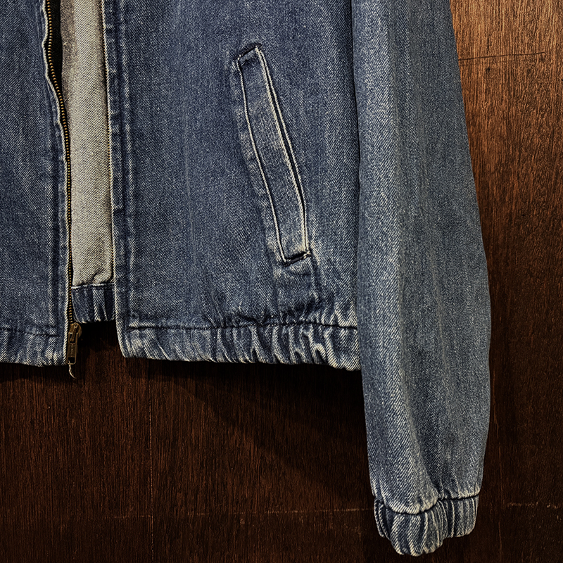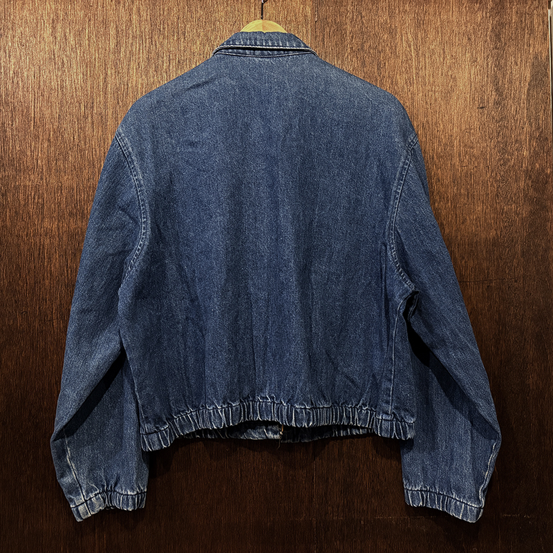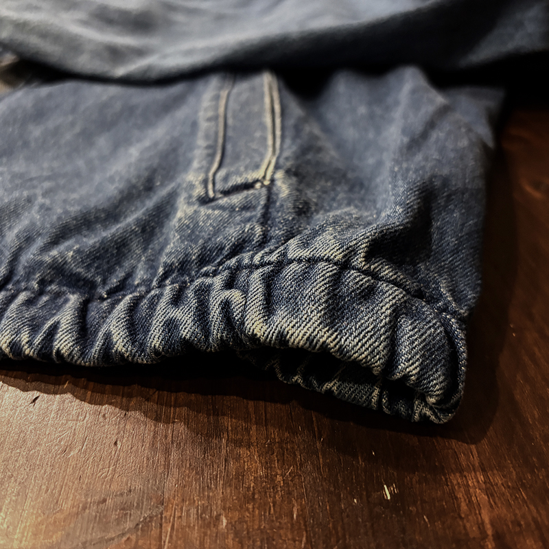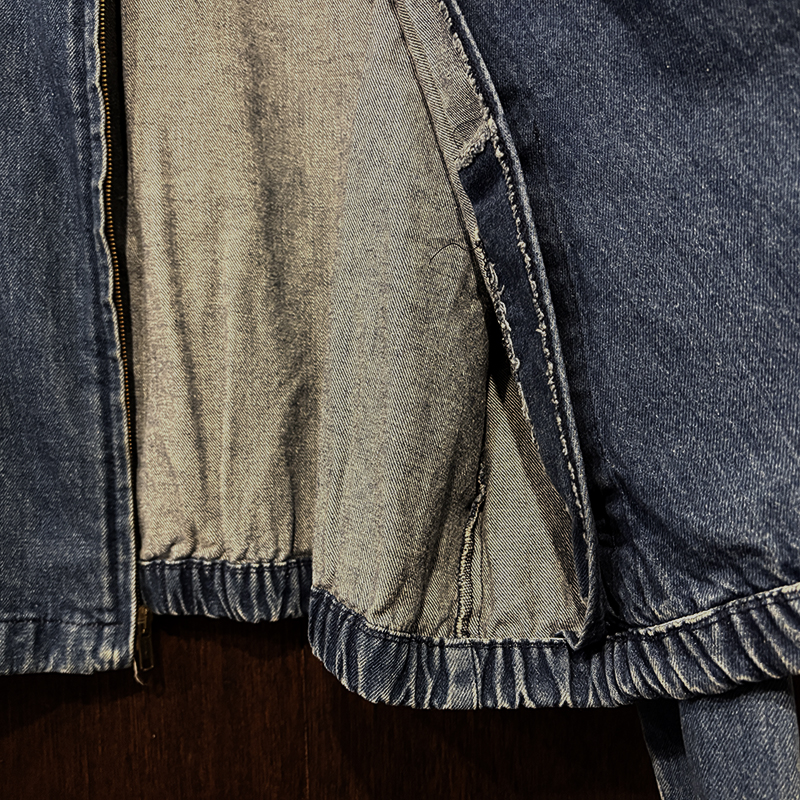 本品は厚手のデニム素材によるショートレングスのドリズラーブルゾンジャケット、首元にはチンストが付き、フロントは当時のIDEALブラスジッパー、ポケットはシンプルに左右のスリットハンドウォーマー、袖周りや裾周りはギャザーリングが施されており、動きやすさにも配慮されたクラシカルなドリズラースタイルのデニムブルゾンとなっています。