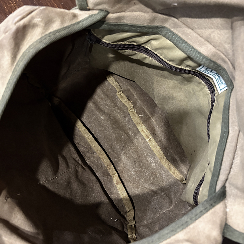 状態は経年の軽度な使用と主には保管によるワックスキャンバス生地特有の元からムラ感や保管などによるエッジのスレ、クスミ、ベルト箇所のブラスパーツによる軽い色移りこそ見られますが、トータルでもメインのキャンバス生地は非常に腰があり肉厚でしっかりとした硬さが残るほどの堅牢な質感を維持しており、ショルダーベルトのフックやブラスパーツなども非常に良好で、傷みやすいレザーストラップなども使用感が感じられないほどのクリーンな状態を維持した、まだまだこれから末長く使い込んでいただけるミントコンディション相当の個体となっています。