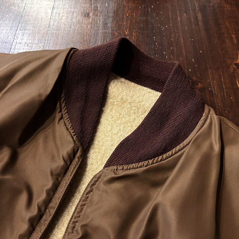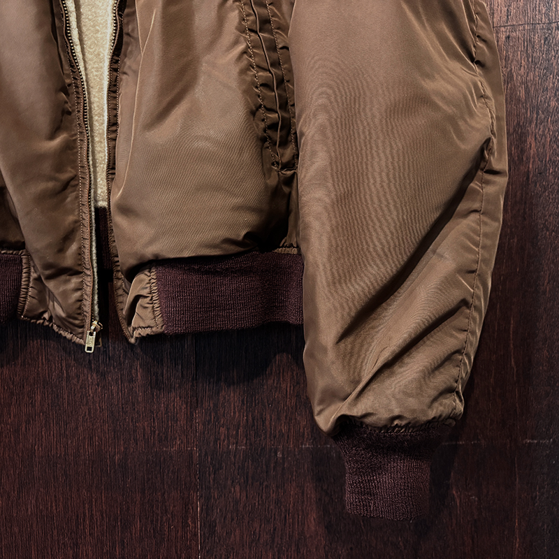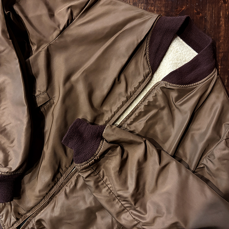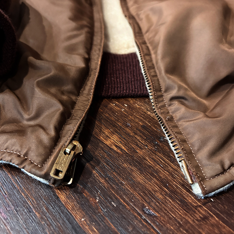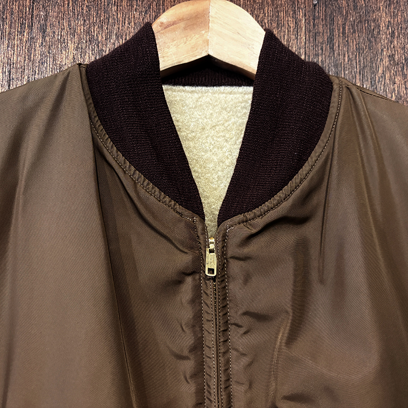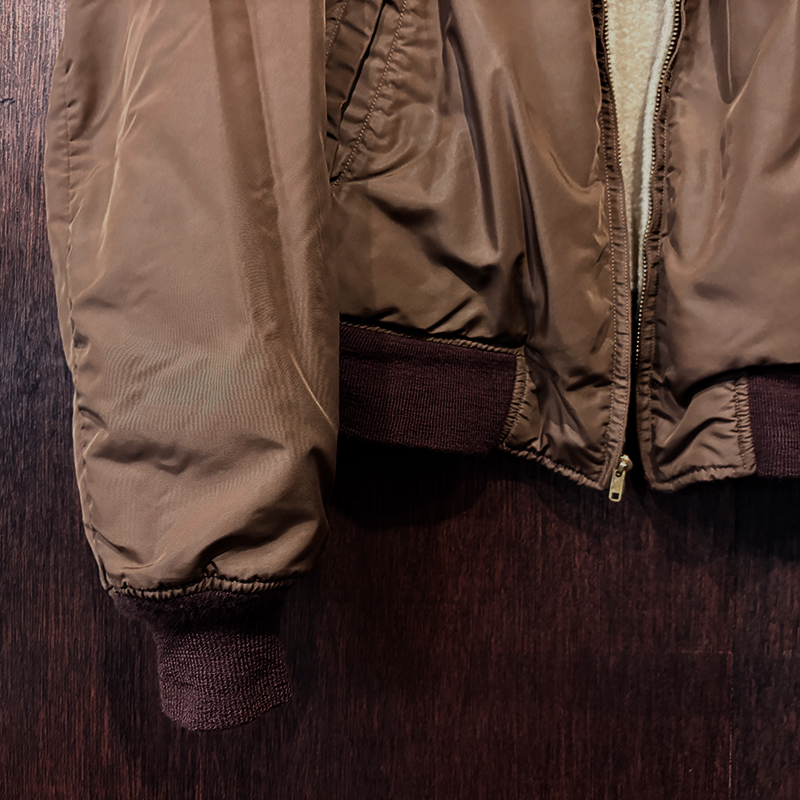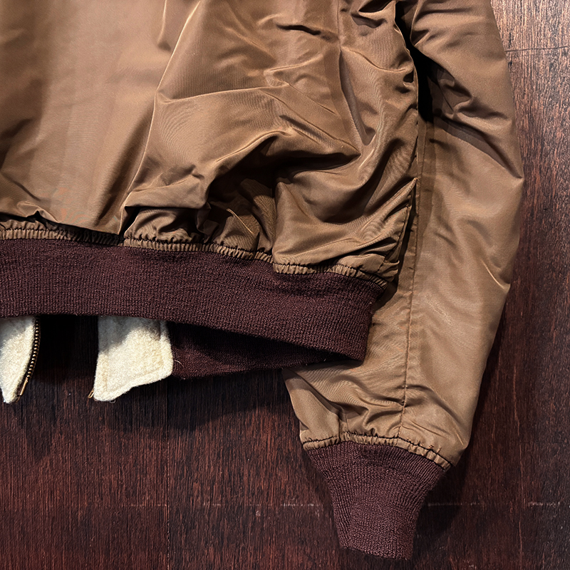 ナイロンツイルシェルは当時のフライトジャケットなどにも採用された堅牢で光沢感のある質感でカラーは希少なブラウンナイロンツイル、一方裏側は同社のアンチフリーズに使用されていた肉厚なアイボリーボアフリースとなっており、フロントジッパーはバタフライタイプのブラスTALONジッパー、スタイルはシンプルなダークブラウンリブ使いのナイロンフライトに近い短丈のスポーツタイプとなっており、非常にアクティブで使い勝手の良いジャケットとなっています。