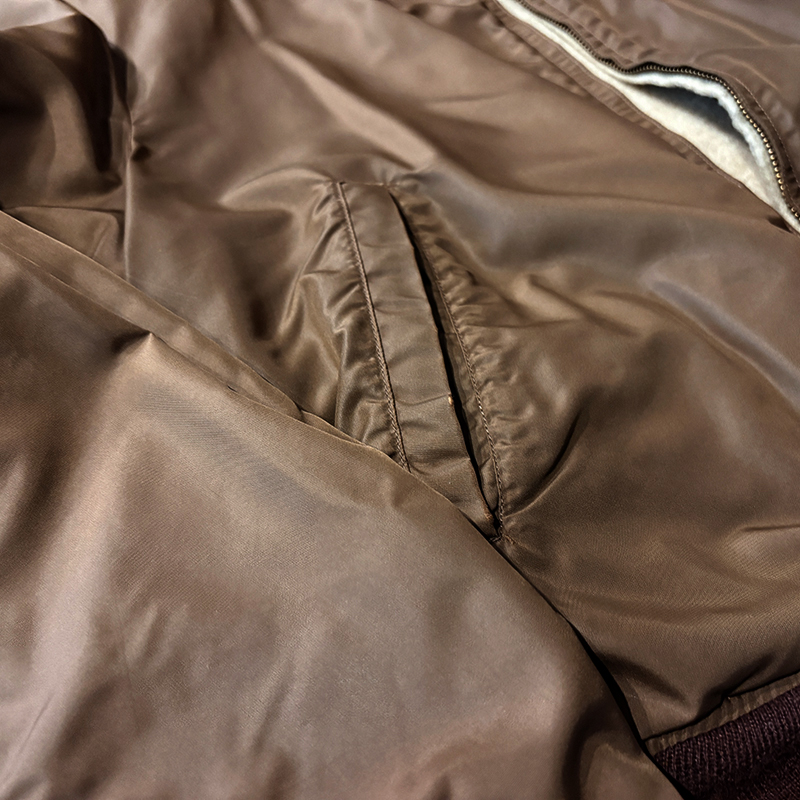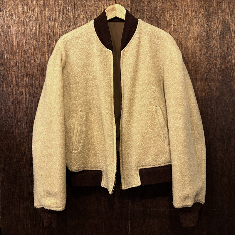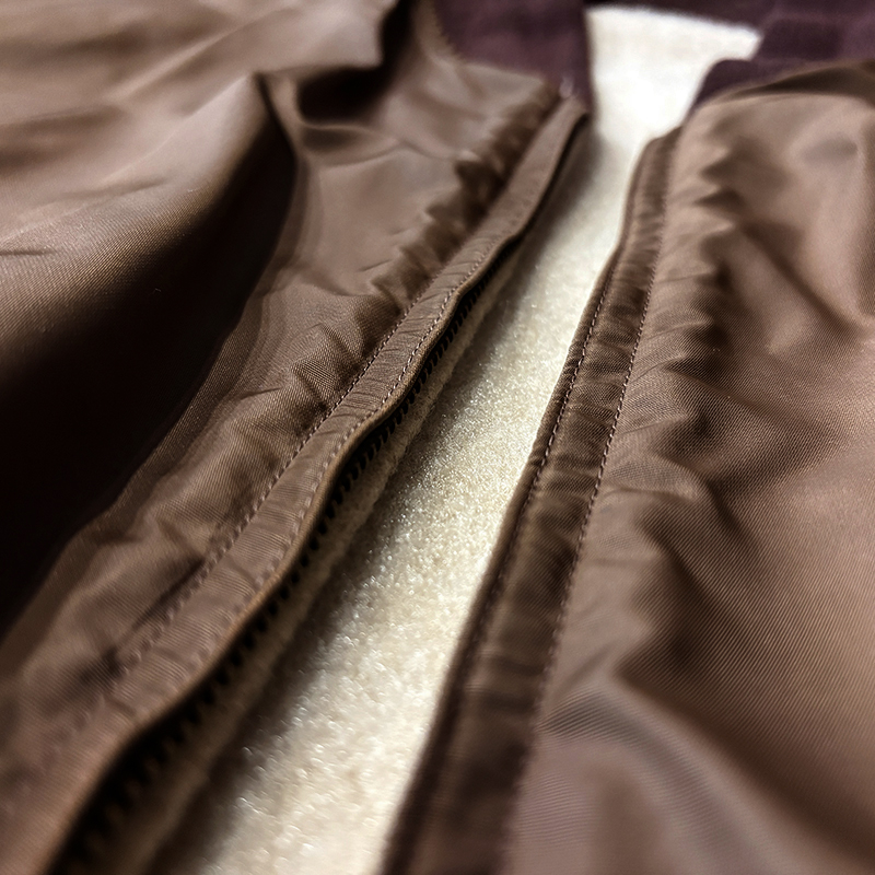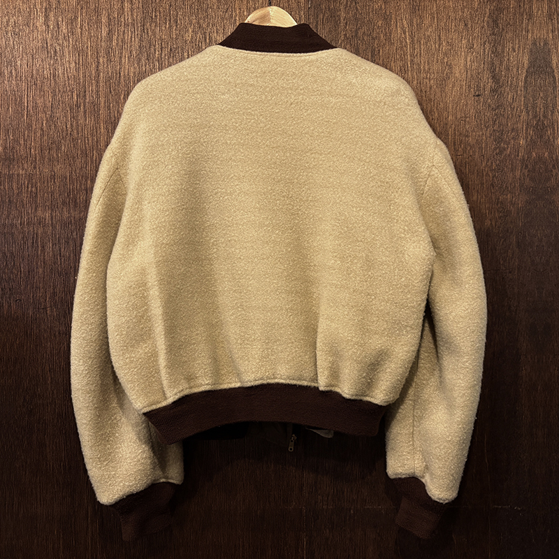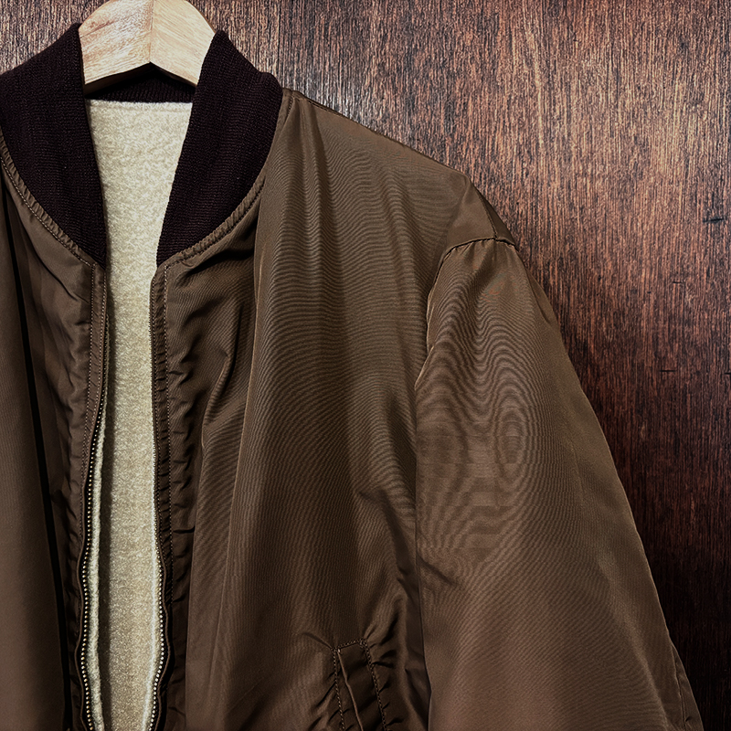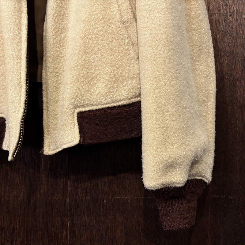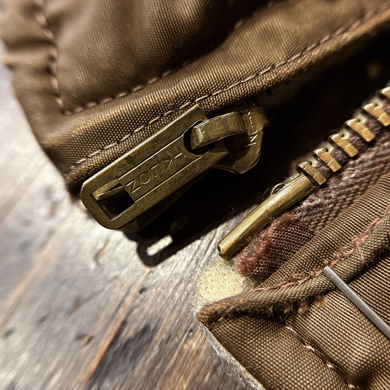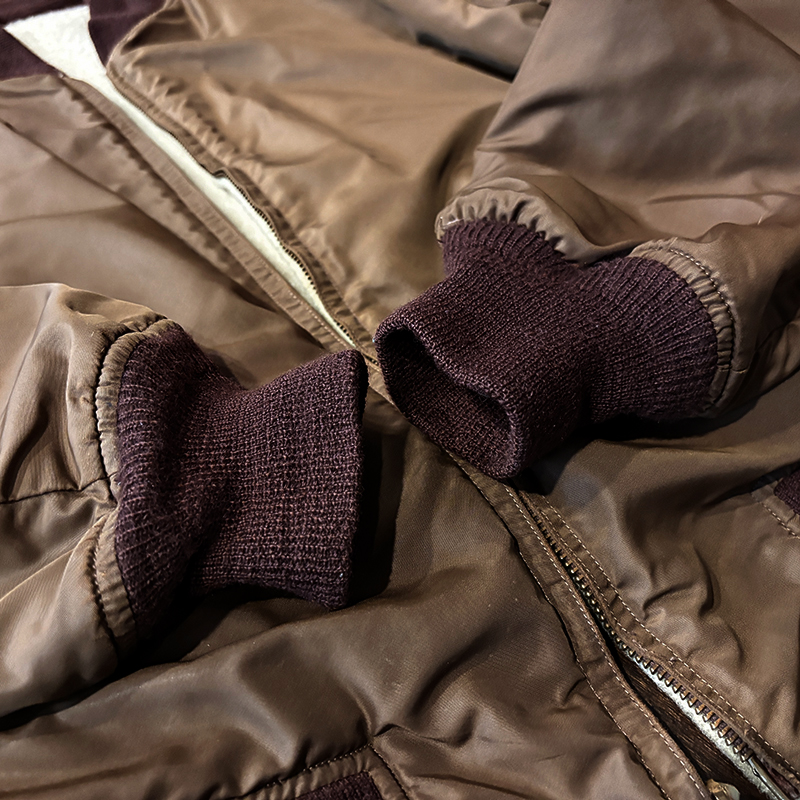 ナイロンツイルシェルは当時のフライトジャケットなどにも採用された堅牢で光沢感のある質感でカラーは希少なブラウンナイロンツイル、一方裏側は同社のアンチフリーズに使用されていた肉厚なアイボリーボアフリースとなっており、フロントジッパーはバタフライタイプのブラスTALONジッパー、スタイルはシンプルなダークブラウンリブ使いのナイロンフライトに近い短丈のスポーツタイプとなっており、非常にアクティブで使い勝手の良いジャケットとなっています。