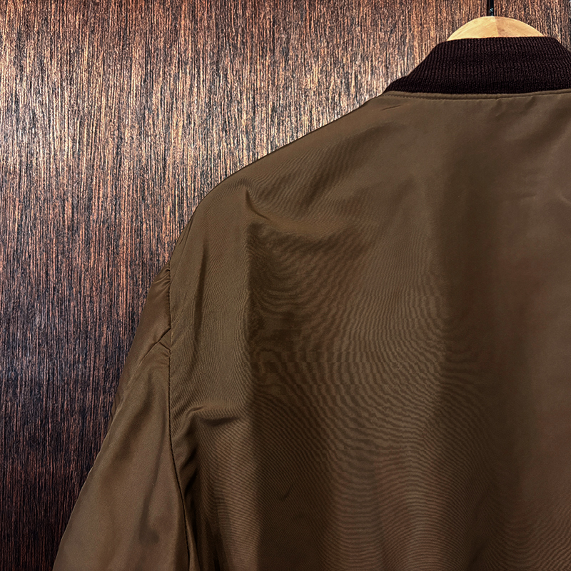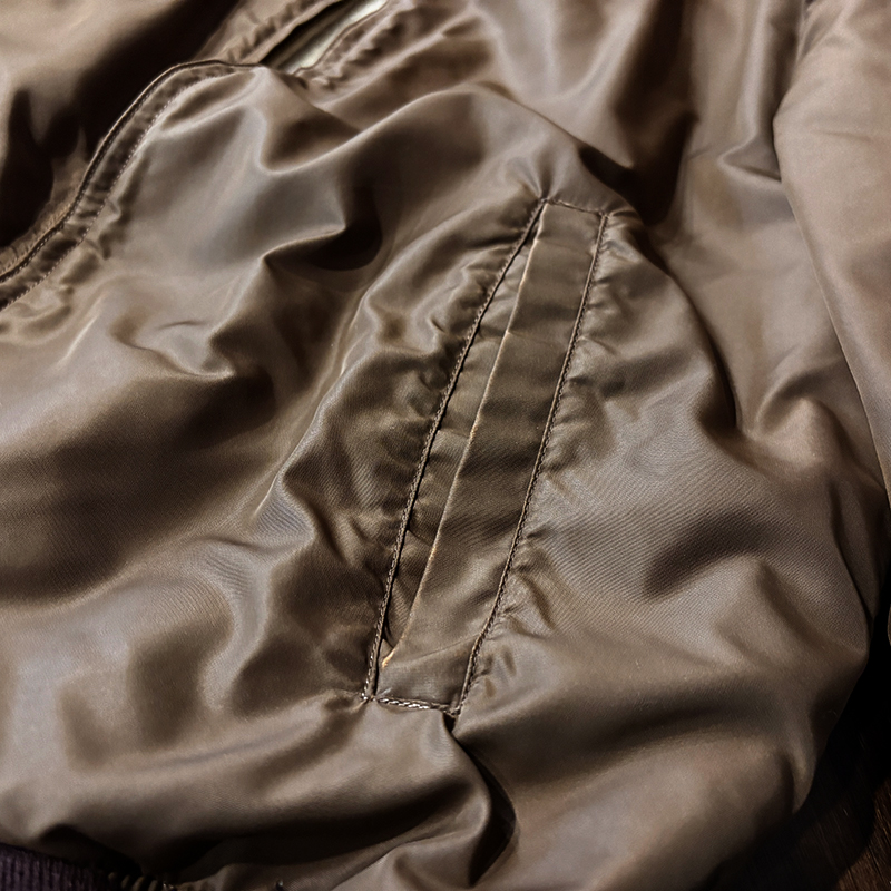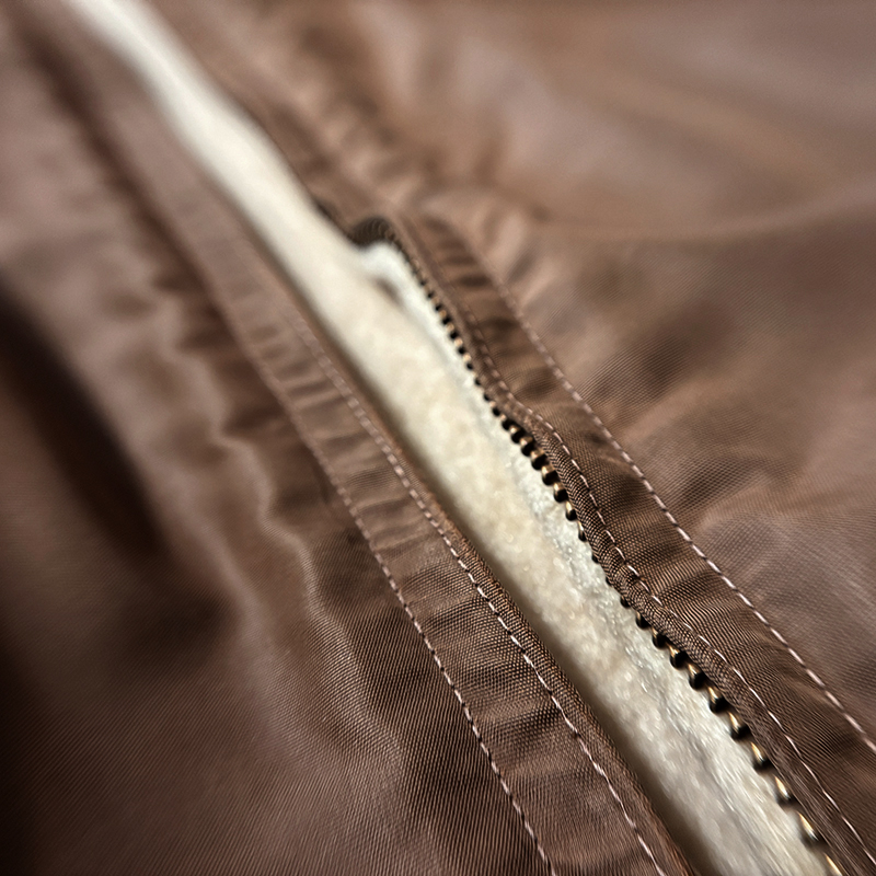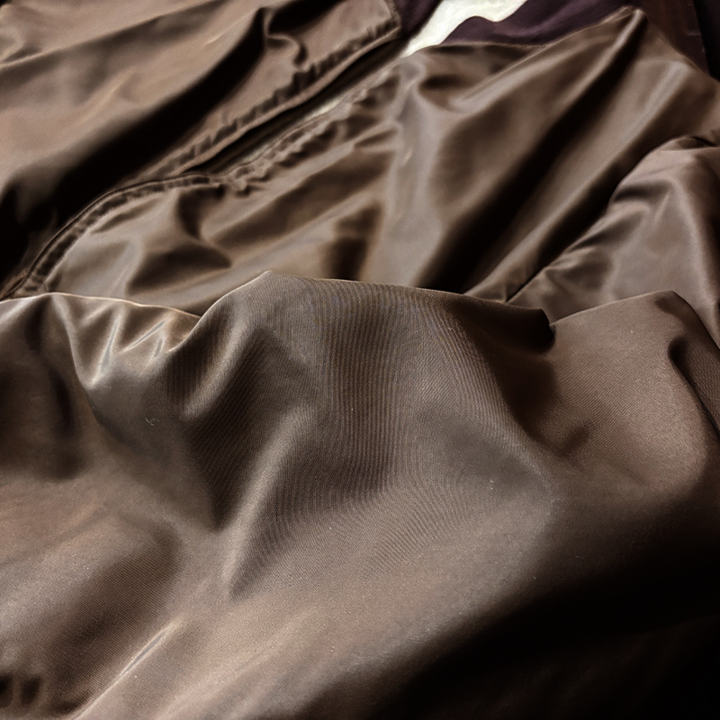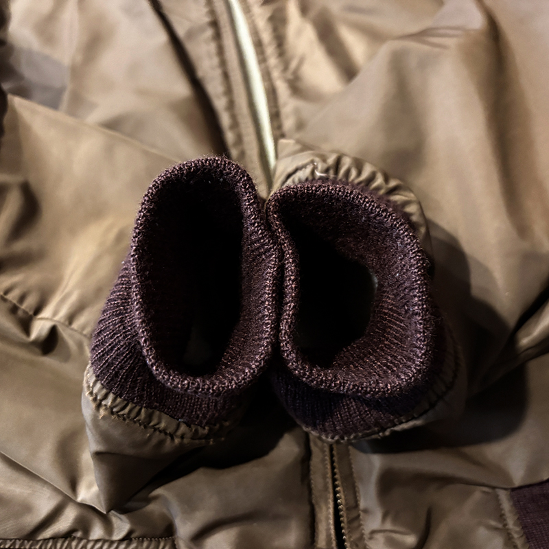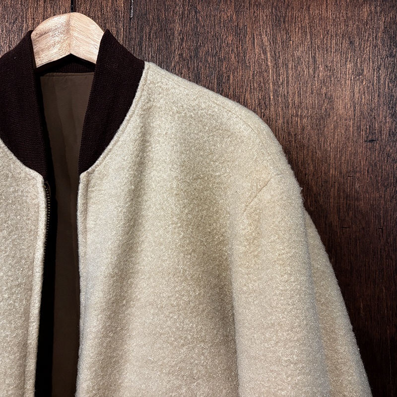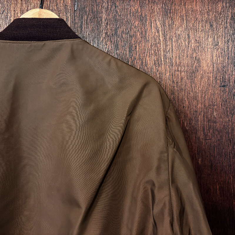 ナイロンツイルシェルは当時のフライトジャケットなどにも採用された堅牢で光沢感のある質感でカラーは希少なブラウンナイロンツイル、一方裏側は同社のアンチフリーズに使用されていた肉厚なアイボリーボアフリースとなっており、フロントジッパーはバタフライタイプのブラスTALONジッパー、スタイルはシンプルなダークブラウンリブ使いのナイロンフライトに近い短丈のスポーツタイプとなっており、非常にアクティブで使い勝手の良いジャケットとなっています。