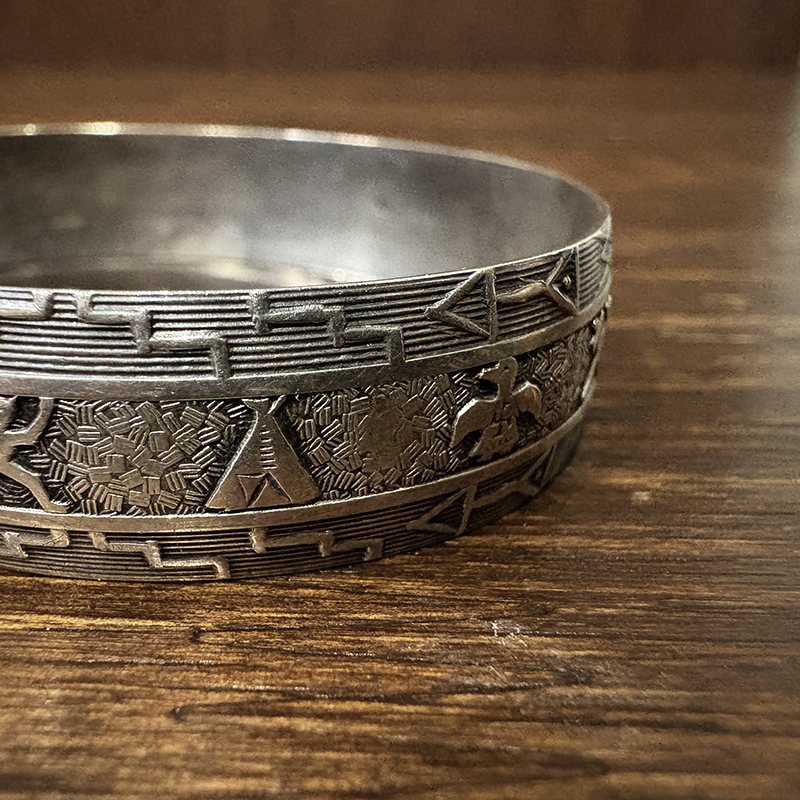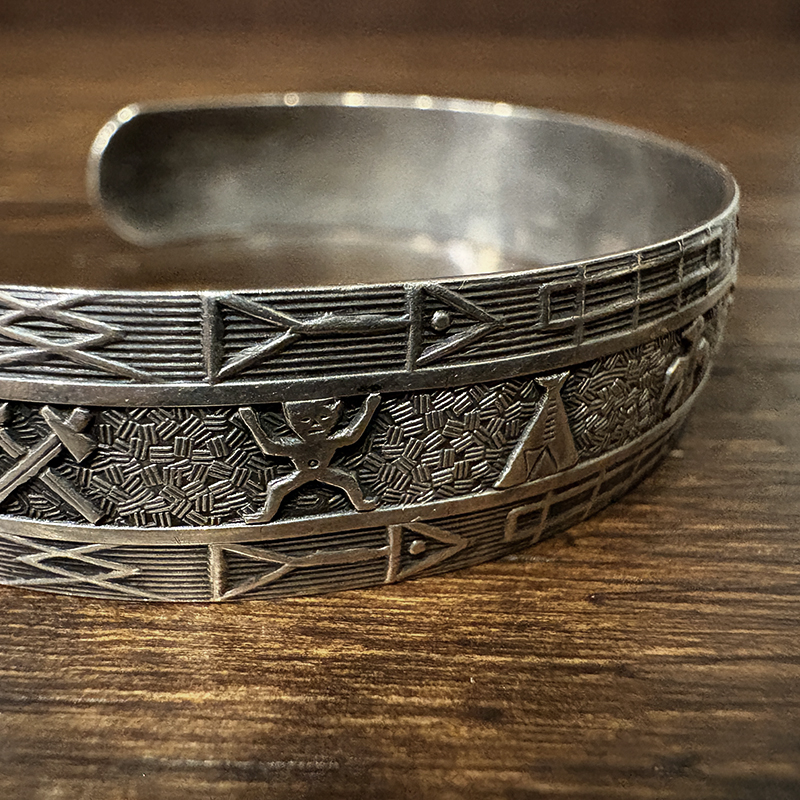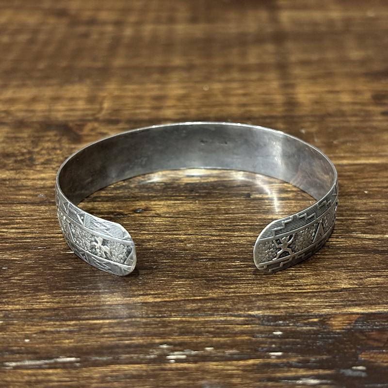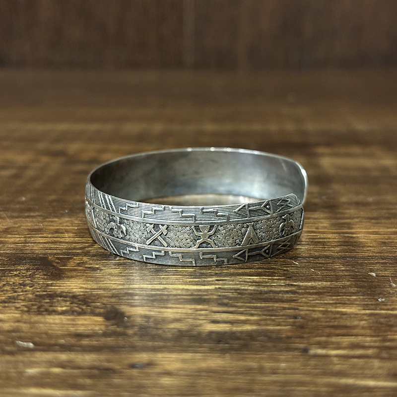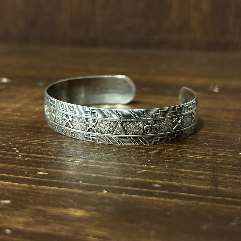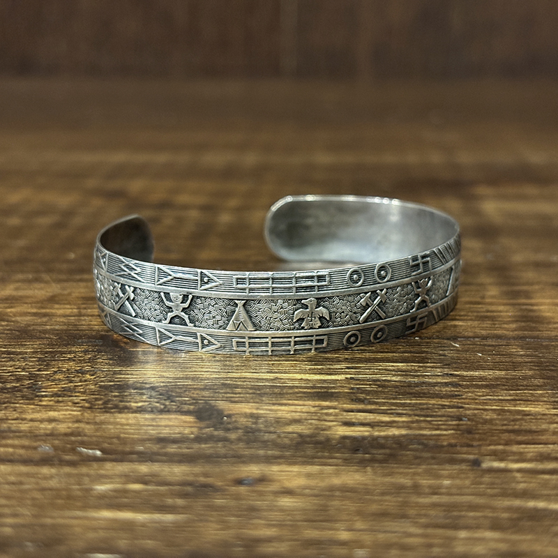 本品は米国西部開拓時代を背景としてスーベニアジュエリーとしてのネイティブアメリカンのモチーフが全面に細かくプ装飾されたスターリングシルバーカフブレスレット。