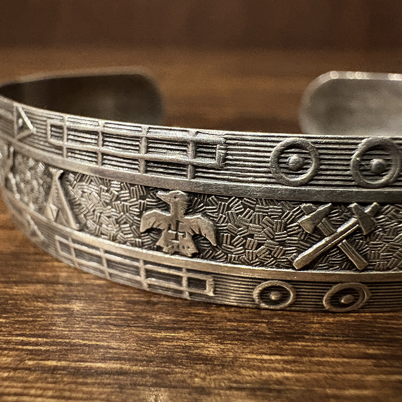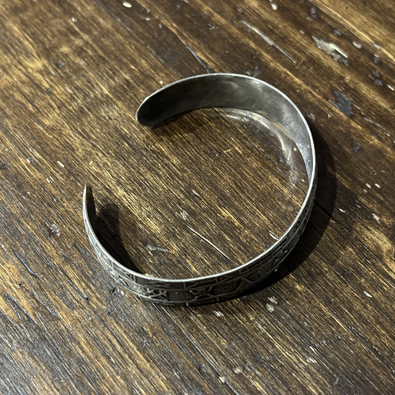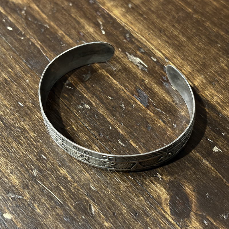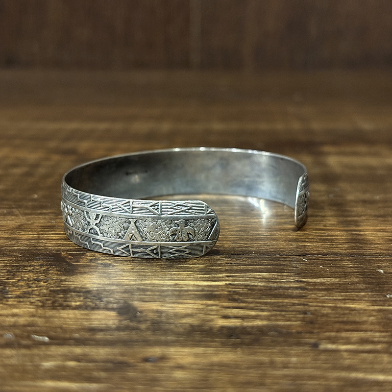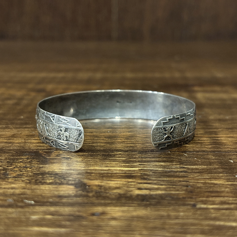紋様は幸福を運ぶ怪鳥であるサンダーバードはじめナバホの象徴的シンボルとされていたスワスティカの4つのLの頭文字からデザインされた卍(LIFE、LOVE、 LUCK、 LIGHT)や、そのほかにはアローやアックス、住居であるティピー、生き物などのモチーフが印象的に並べられデザインされた密度のある良い雰囲気を纏ったバングルとなっています。