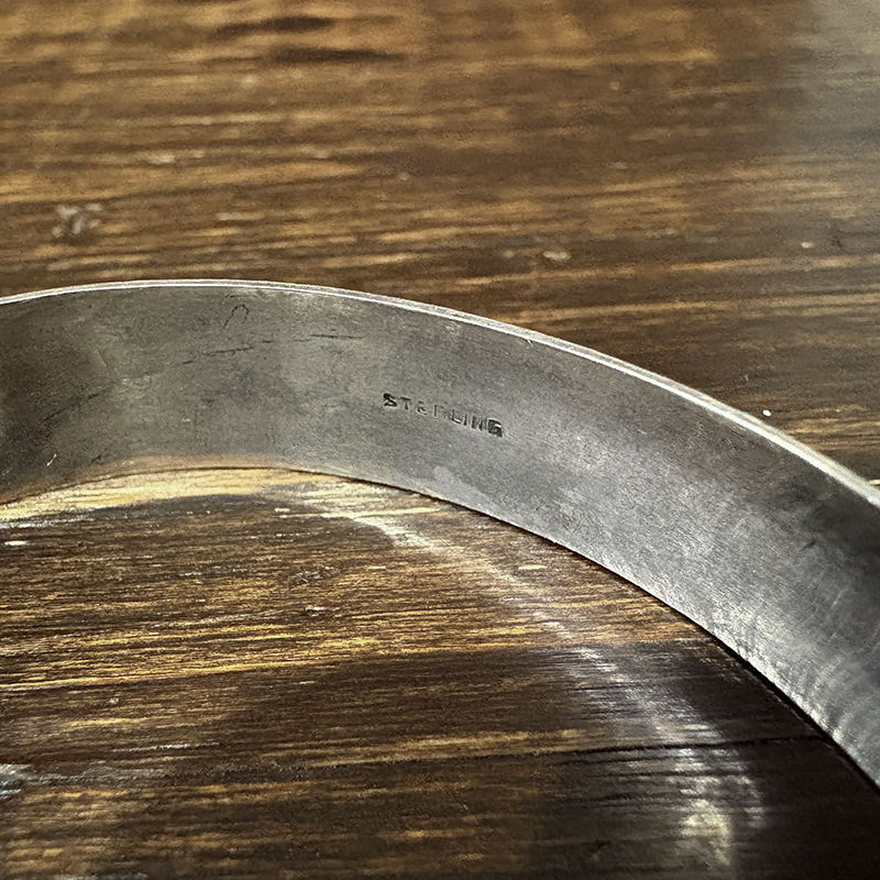 地金は内側にSTERLINGの刻印があることから純度925のスタリーンシルバーとなっており、地金は年月を経たビンテージシルバーらしい、くすんだ色味と部分的な輝きのコントラストが強く、さらに使い込むことでシルバーの表情が変化していくのも楽しみのひとつとなっています。