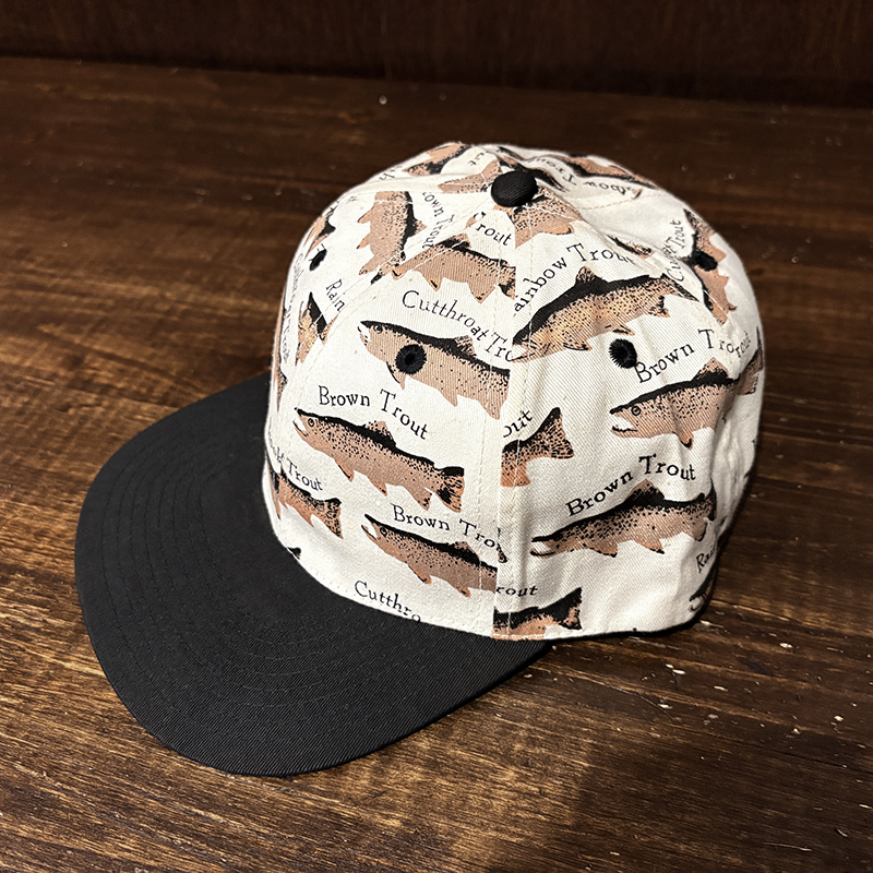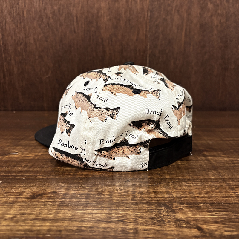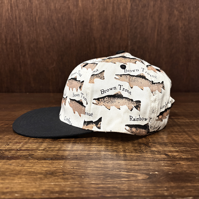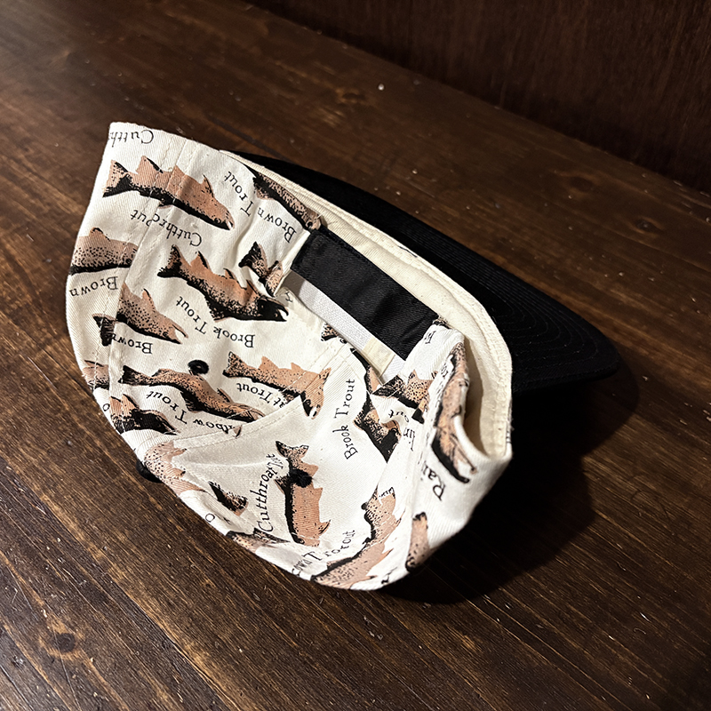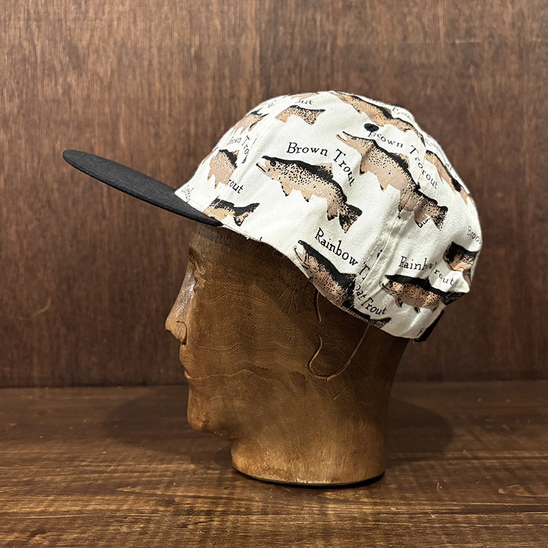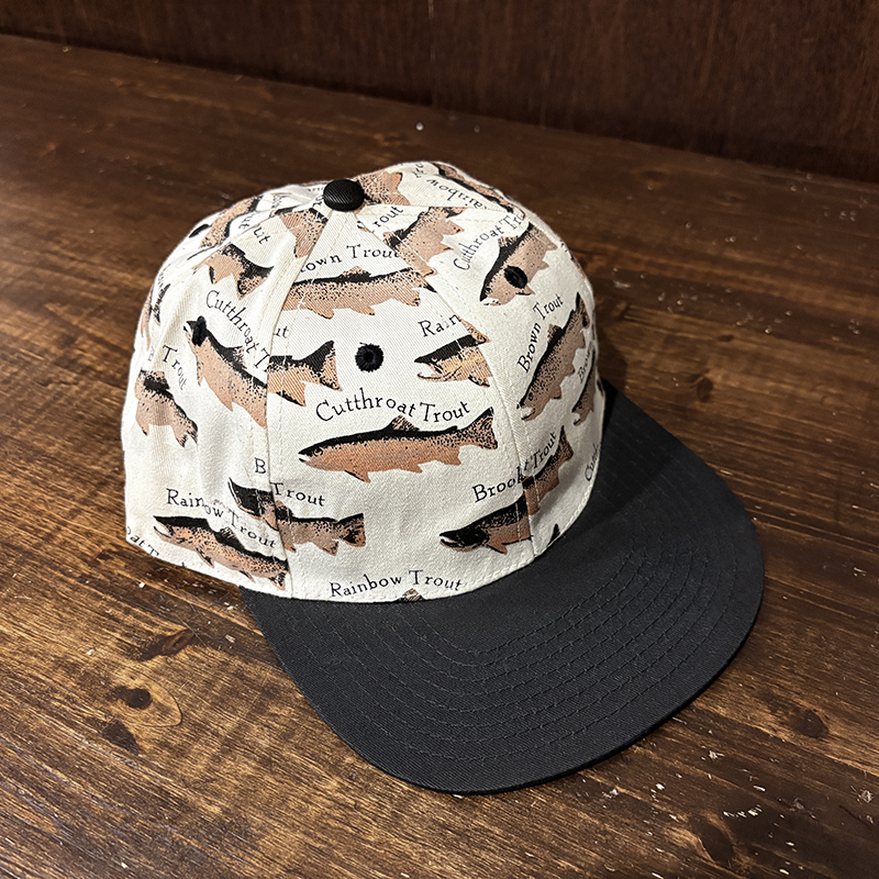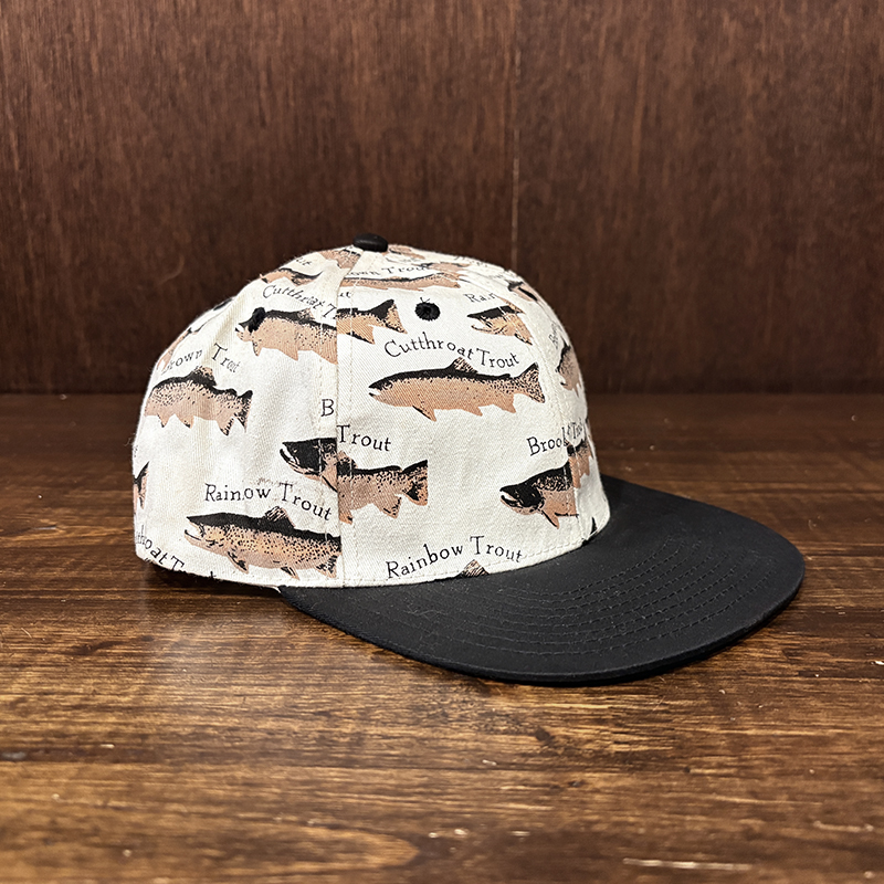 本品はオールドのトラウト達がランダムにレイアウトされた厚手のコットンツイルで構成されたスポーツフィッシングキャップ。