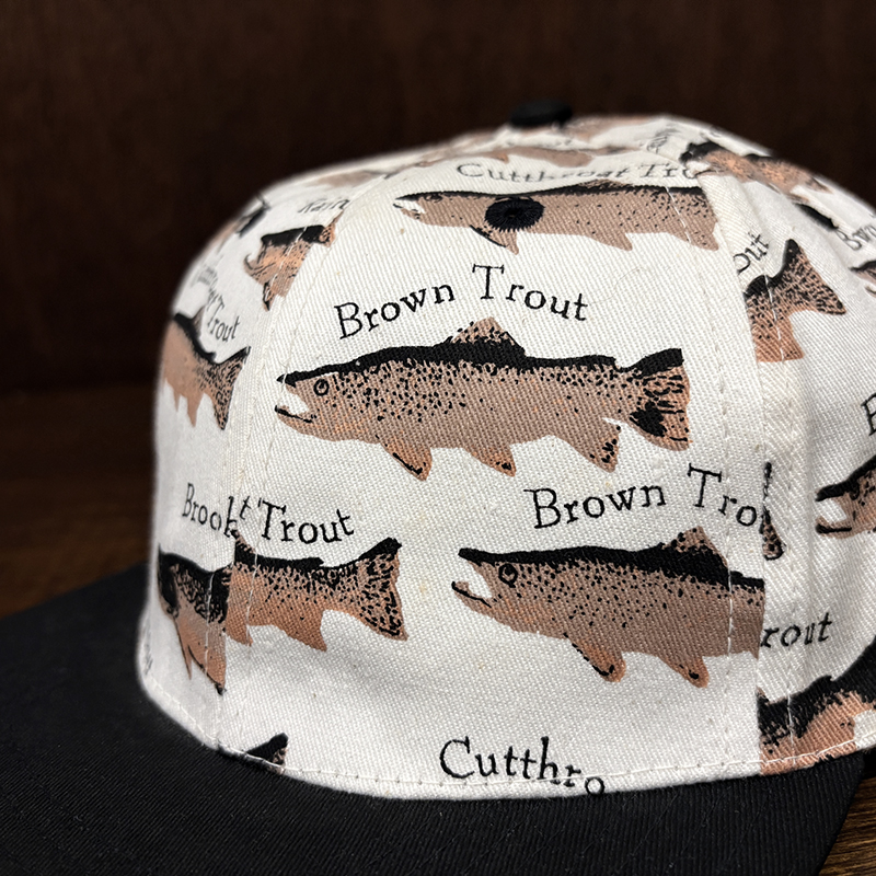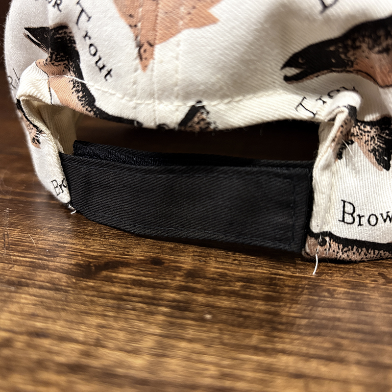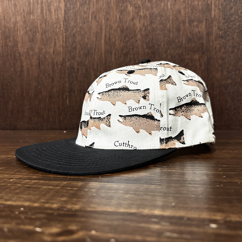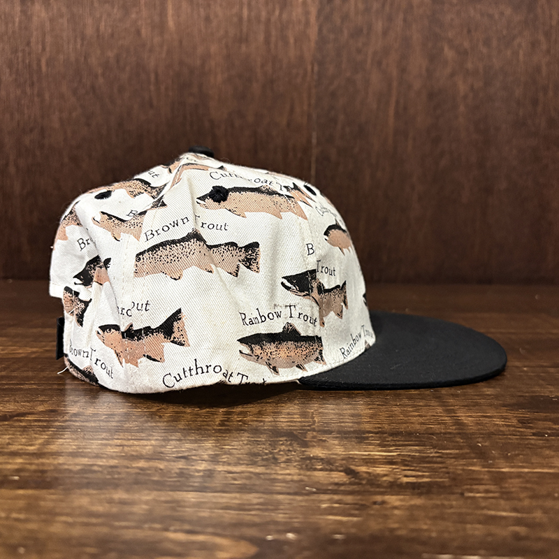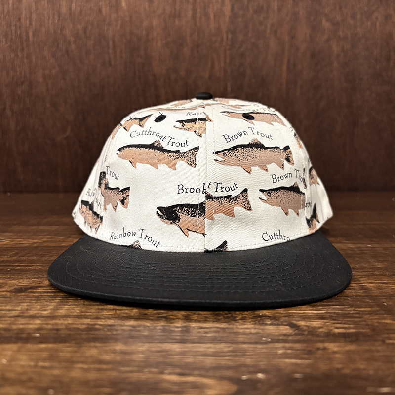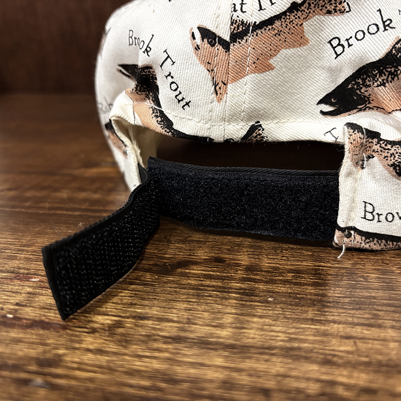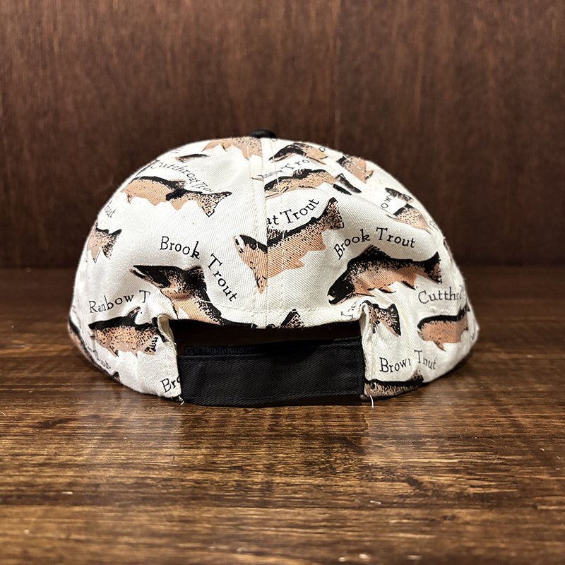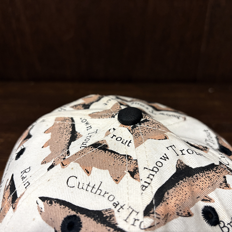 本品はオールドのトラウト達がランダムにレイアウトされた厚手のコットンツイルで構成されたスポーツフィッシングキャップ。