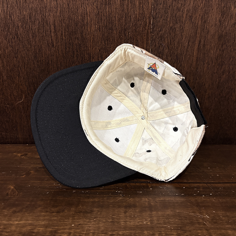 キャップのスタイルは一般的な6パネル構成の当時のスポーツタイプらしいパネルパターンがとられたデザイン、ツバはしっかりと芯入っておりブラックの切り返しとなっており、バックはマジックテープによるバンドによりあらゆるサイズにフィットするフリーサイズとなっています。