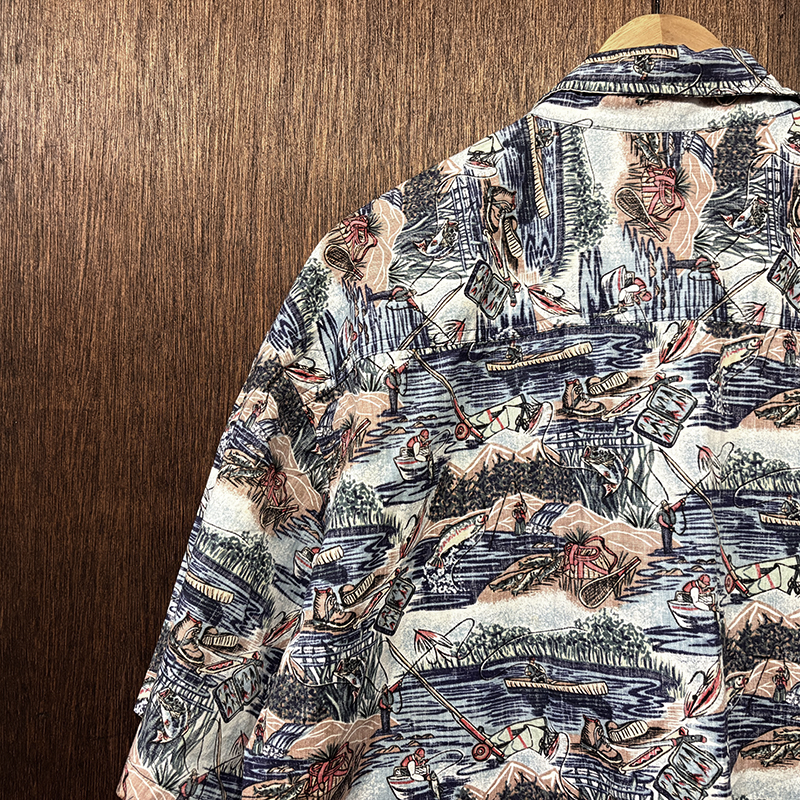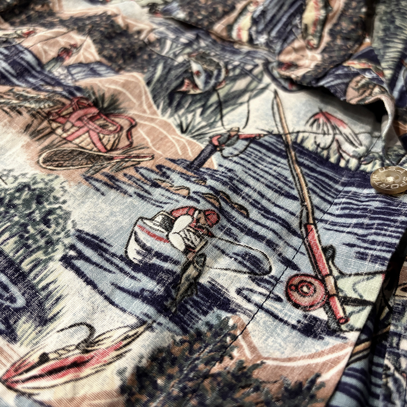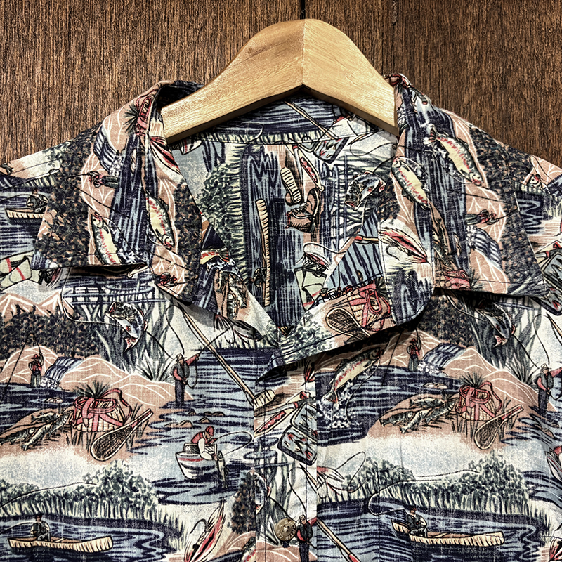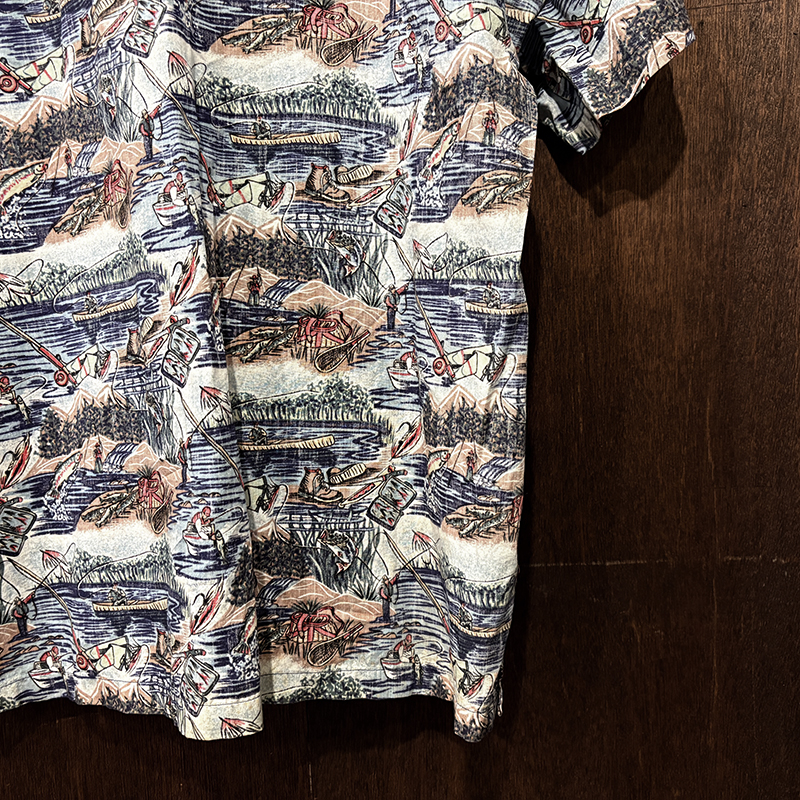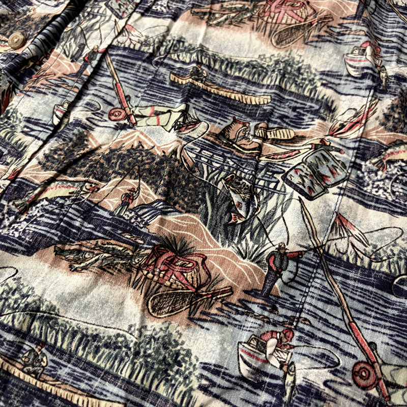 オールドクラシックなフィッシングシーンが賑やかにプリントされたオールドコットンプリントシャツ、素朴なタッチのイラストやバッククロス仕様でアロハのような雰囲気で軽快に羽織れる一着です、状態もミントな米国製のビッグサイズ、アウトドアシーン及びタウン、バカンスにもおすすめです、是非ご検討ください。