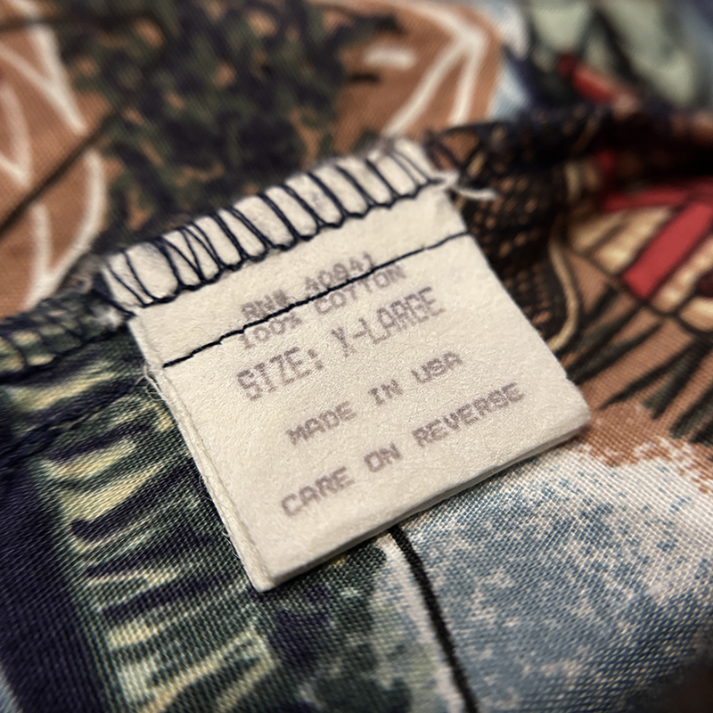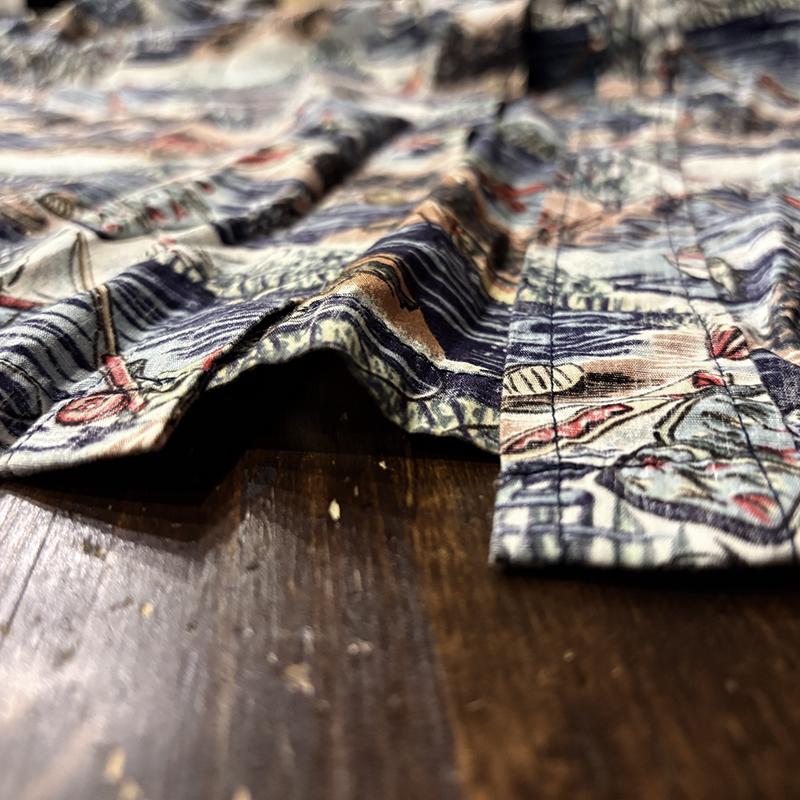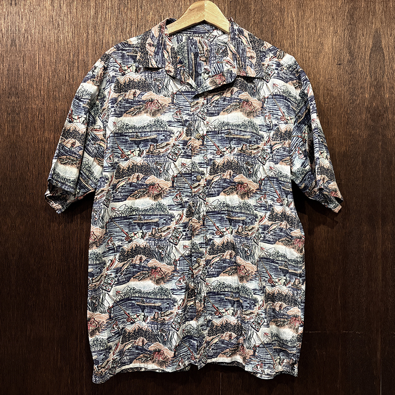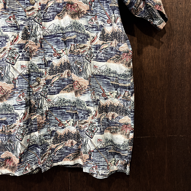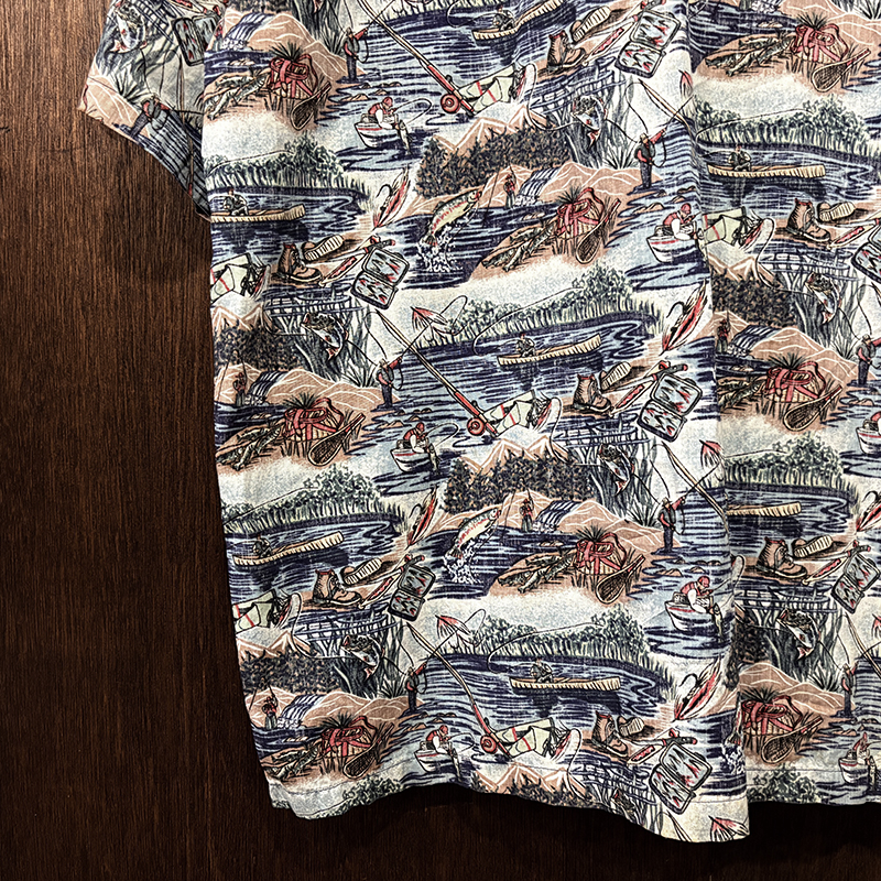 オールドクラシックなフィッシングシーンが賑やかにプリントされたオールドコットンプリントシャツ、素朴なタッチのイラストやバッククロス仕様でアロハのような雰囲気で軽快に羽織れる一着です、状態もミントな米国製のビッグサイズ、アウトドアシーン及びタウン、バカンスにもおすすめです、是非ご検討ください。
