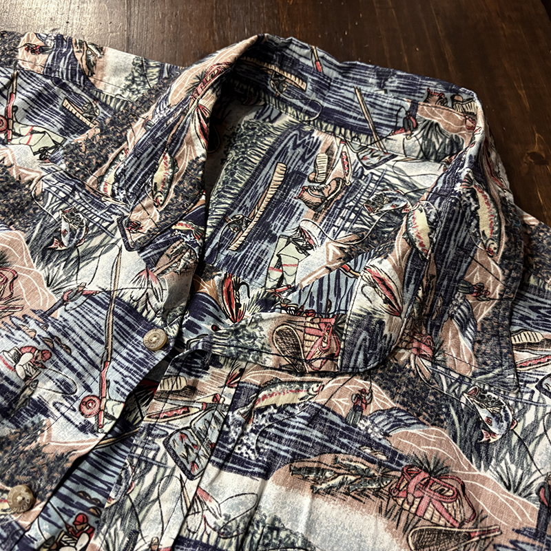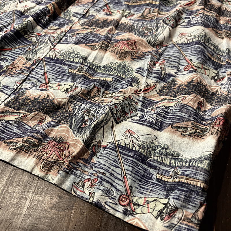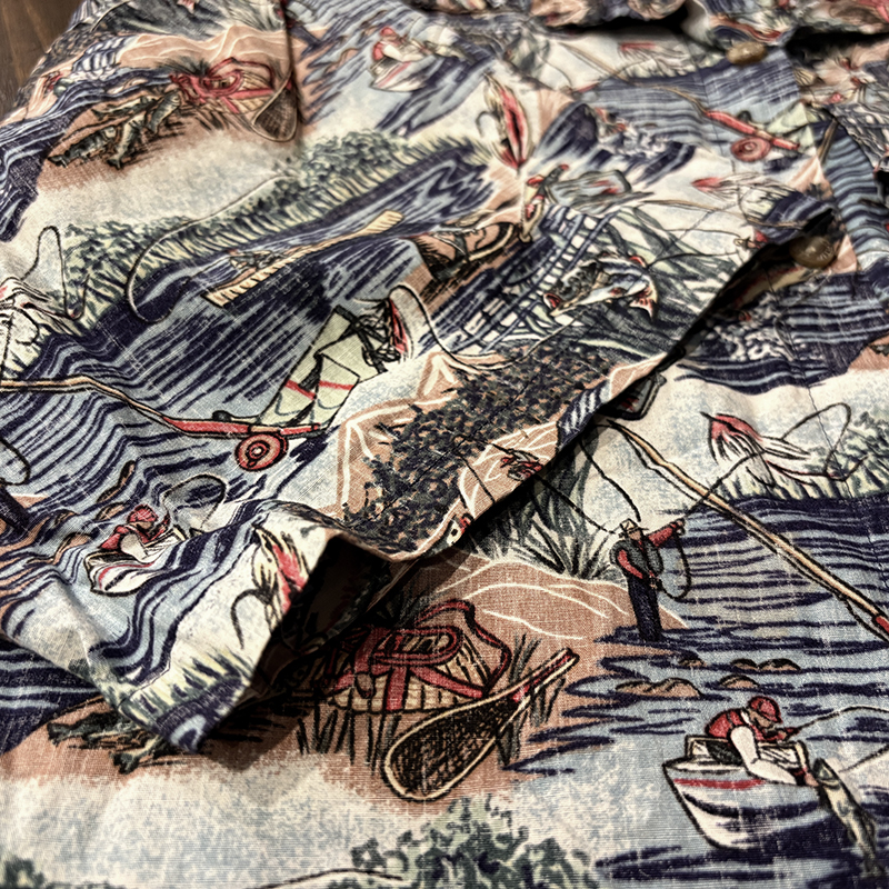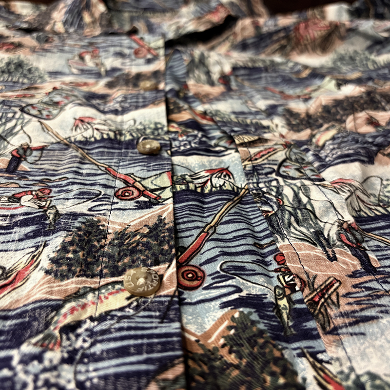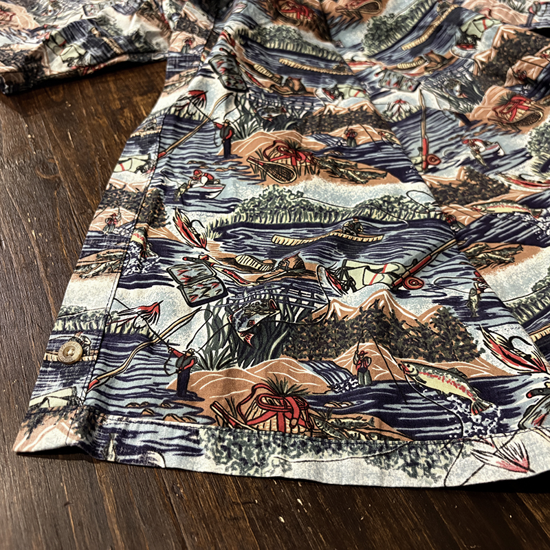 本品は主に当時らしいクラシカルなフィッシングシーンがさまざまなシーンで描かれたのオールドプリントコットンシャツ、生地はコットン100%のブロードクロス、ボートフィッシングはじめランディングシーン、キャストシーンやクリールやロッド、ジャンピングバスなどのカットイラストが大変良い雰囲気のパターンプリントの一着です。