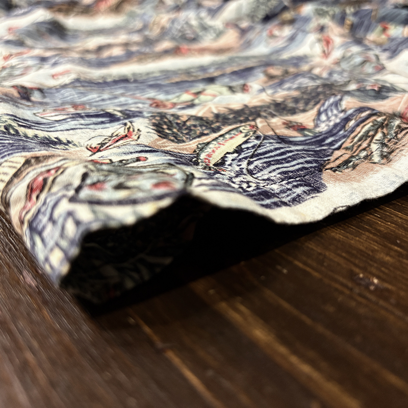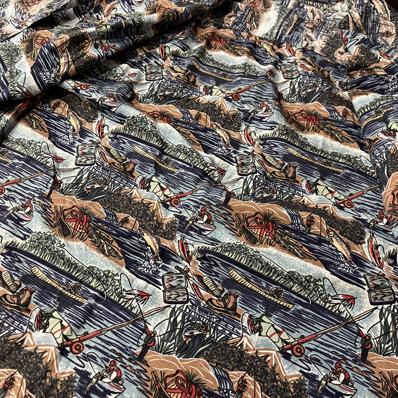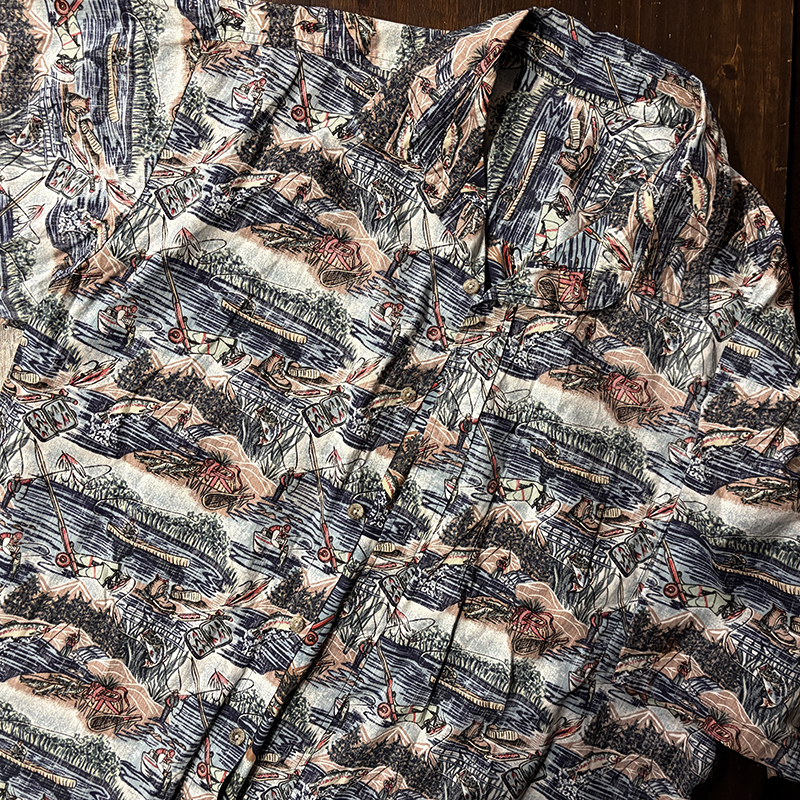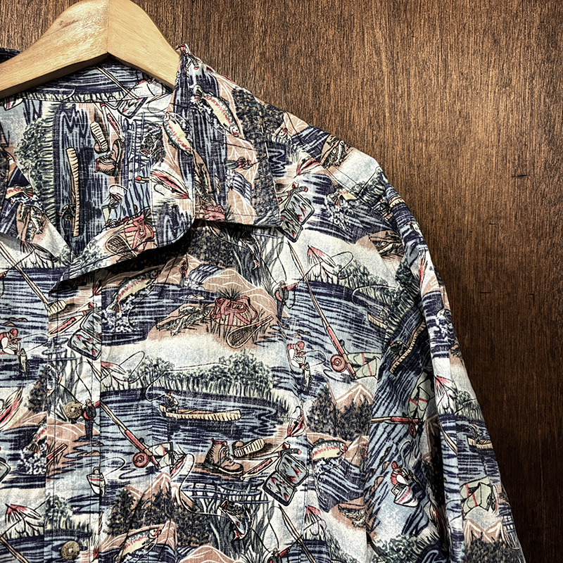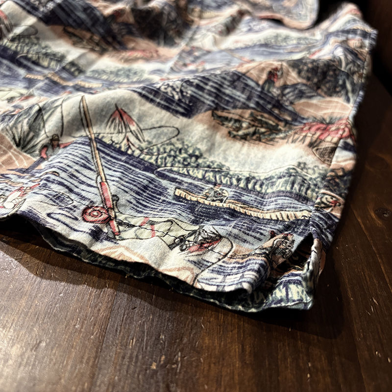 本品は主に当時らしいクラシカルなフィッシングシーンがさまざまなシーンで描かれたのオールドプリントコットンシャツ、生地はコットン100%のブロードクロス、ボートフィッシングはじめランディングシーン、キャストシーンやクリールやロッド、ジャンピングバスなどのカットイラストが大変良い雰囲気のパターンプリントの一着です。