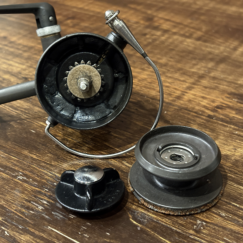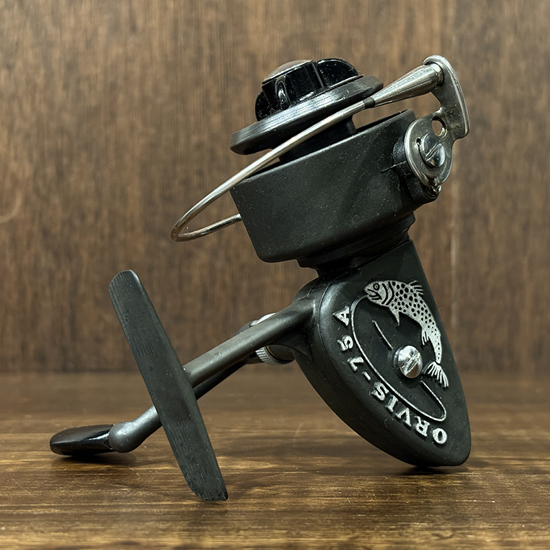本品はオービスの名作スピンリールの50Aと同じシリーズの75A、イタリアのリールメーカーの名門であるコプテス社によって製造され、50Aと比べスプールが一回り大きく、糸巻き量が多くなっている非常に稀少なモデルです。