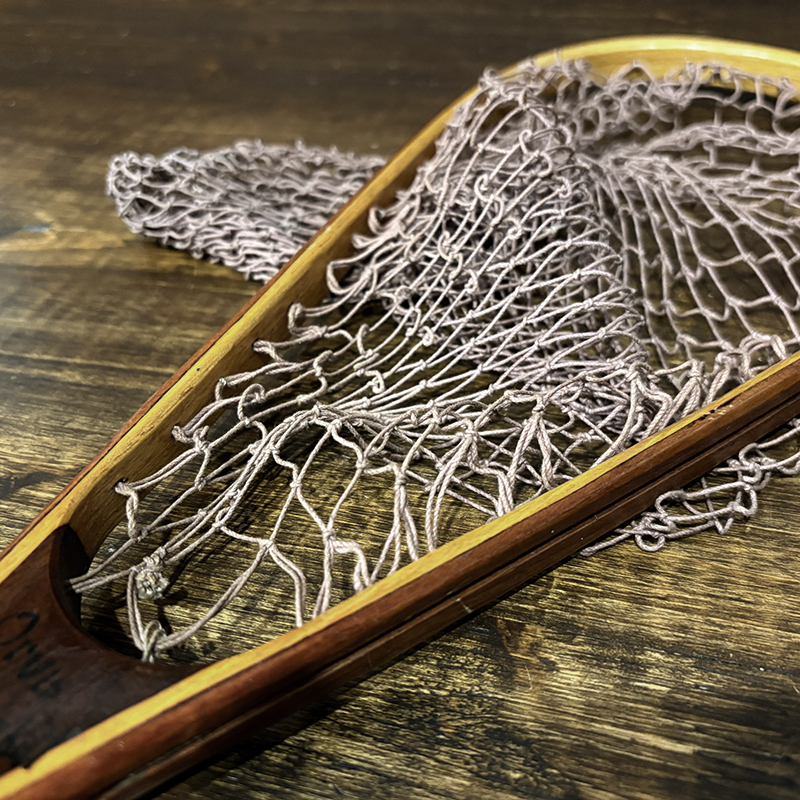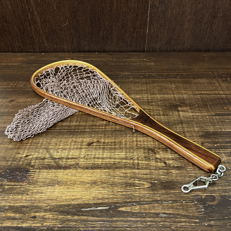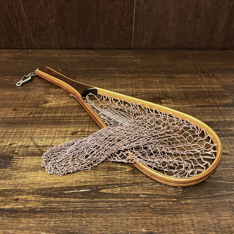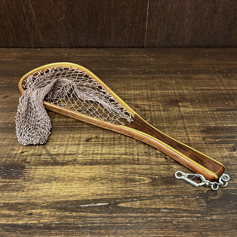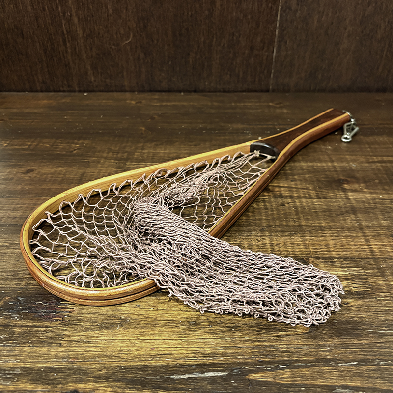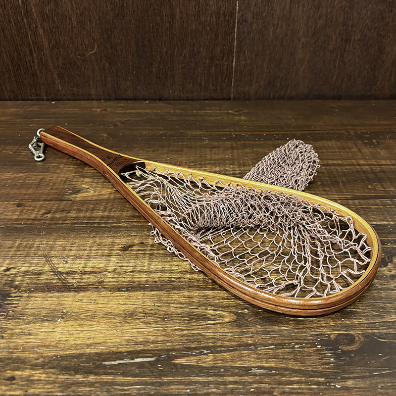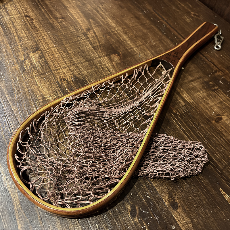 本品はオービスオリジナルのバテンキル名が与えられたウッドフレームランディングネット、同社らしい当時の木目が美しい良質の材によるビンテージネットらしいフレームシルエットがなんともクラシカルなオールドネット、サイズもスモールサイズで渓流でのイワナやヤマメなどにも使いやすい18インチ仕様のトラウトサイズネット、素朴で堅牢なコットン編みの当時のままの太糸仕様で、非常にクラシカルなビンテージネットです。