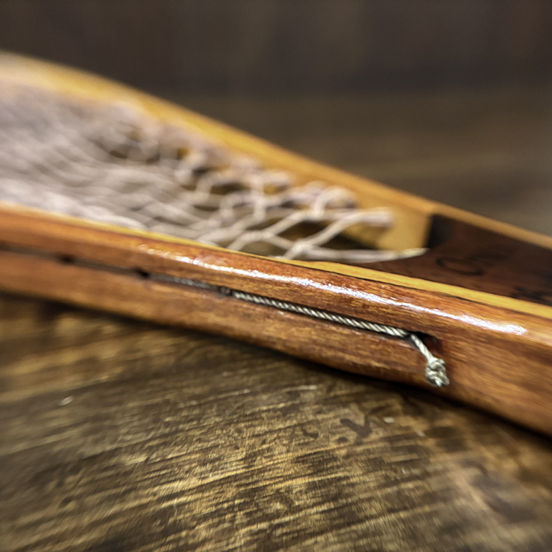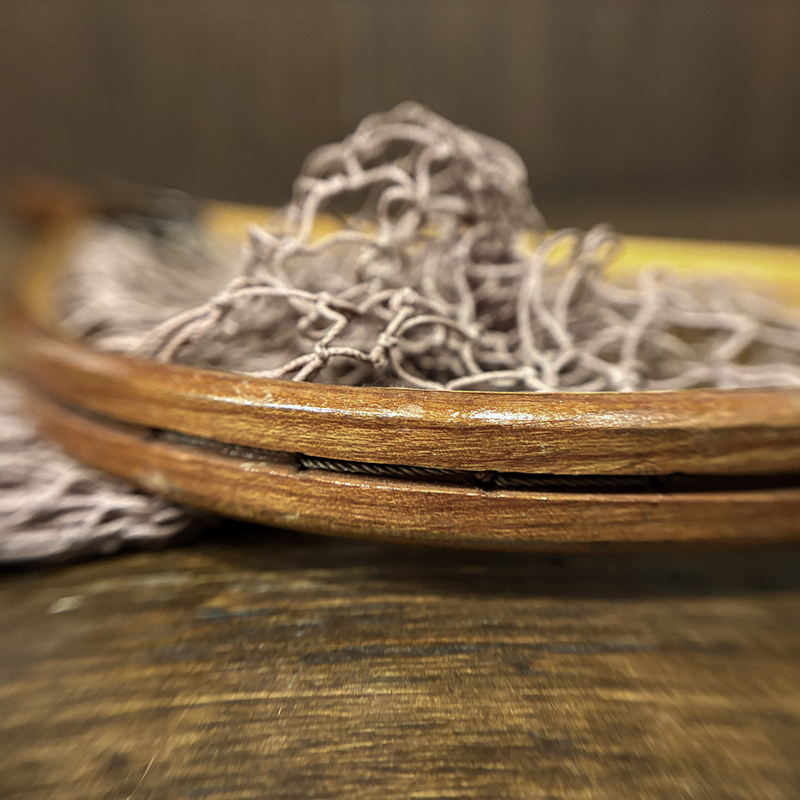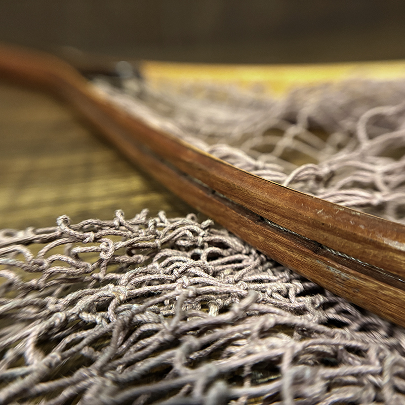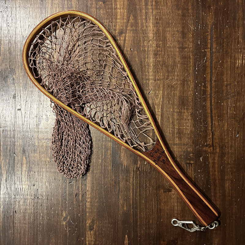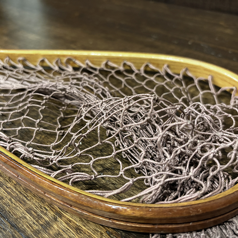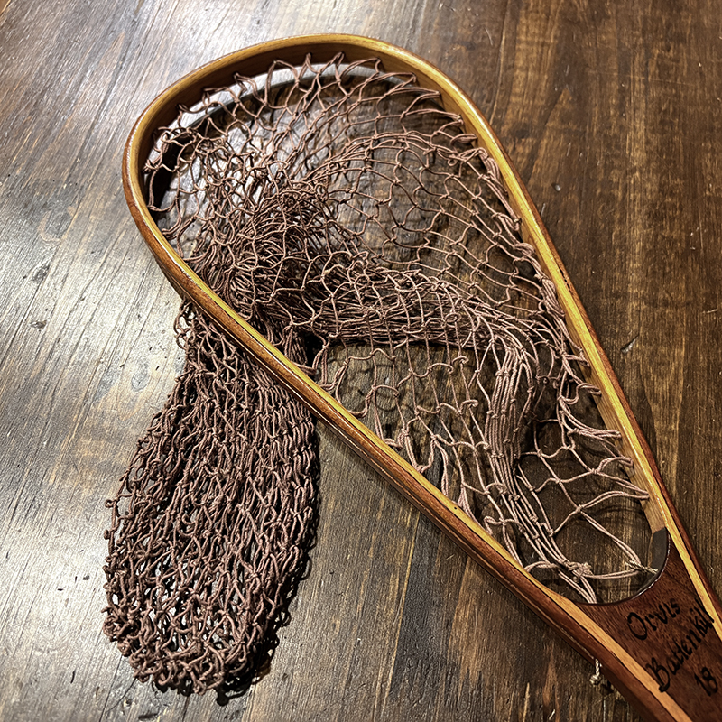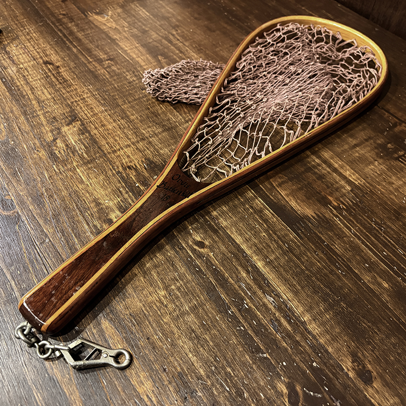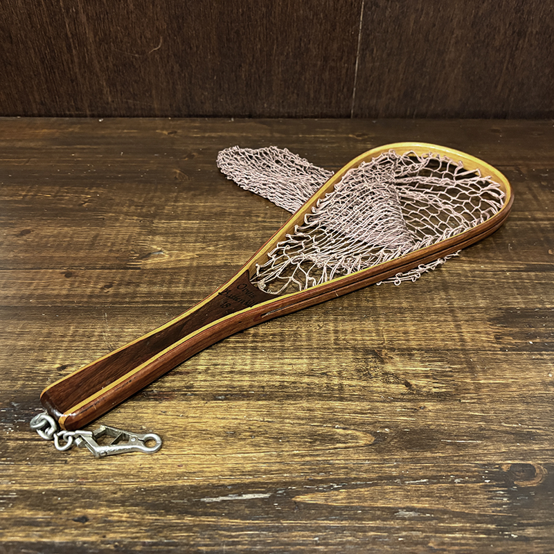 本品はオービスオリジナルのバテンキル名が与えられたウッドフレームランディングネット、同社らしい当時の木目が美しい良質の材によるビンテージネットらしいフレームシルエットがなんともクラシカルなオールドネット、サイズもスモールサイズで渓流でのイワナやヤマメなどにも使いやすい18インチ仕様のトラウトサイズネット、素朴で堅牢なコットン編みの当時のままの太糸仕様で、非常にクラシカルなビンテージネットです。