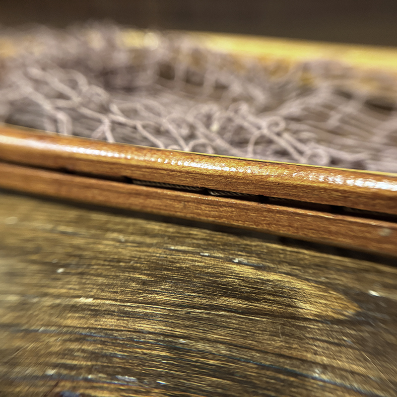 フレーム材は赤みが強く材の木目が荒々しいメイン材が使用されており、Orvis Battenkill 18の銘が印字されており、フレーム枠にかけては多層に張り合わせた当時らしい材の表情のディテールが大変良く、エンド部には当時特有のパンタグラフオールドバイスリリーサーが付属、ビンテージネットならではの各部のディテールが大変雰囲気の良いつくりとなっています。