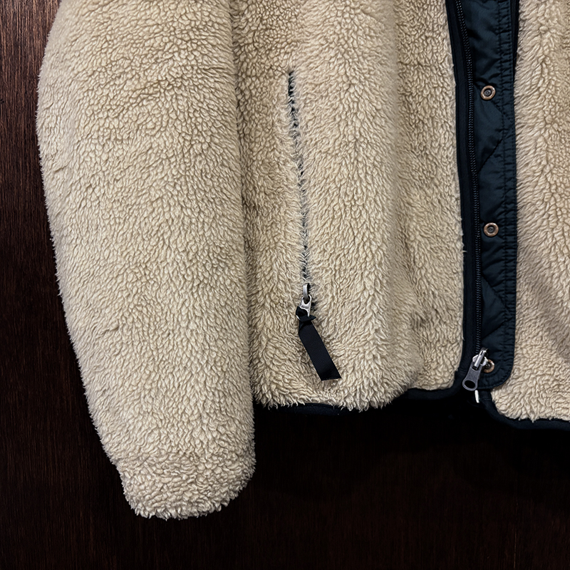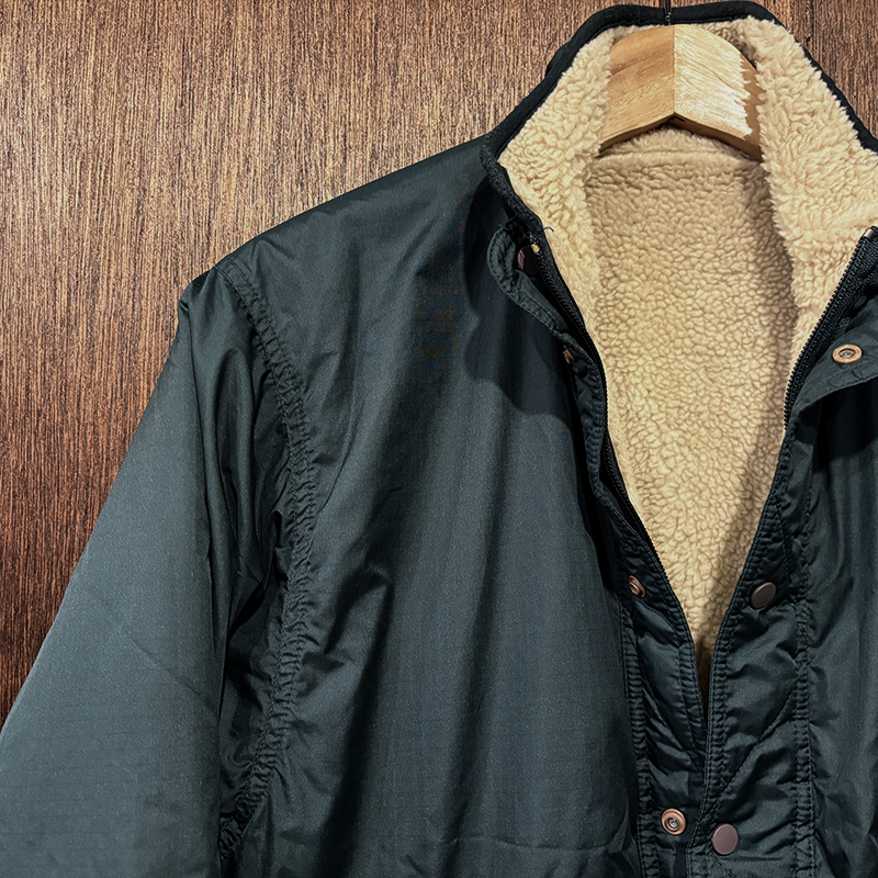 本品はリップストップナイロンシェルとパイルフリースのリバーシブル仕様のアルペンなどのスキーでの滑ることを意味する「グリセード」と名付けられた名作ジャケット、当時らしいハンターグリーンシェルとクラシックなナチュラルカラーのハイパイルによるコンビネーションが雰囲気の良い一着です。