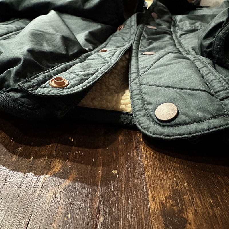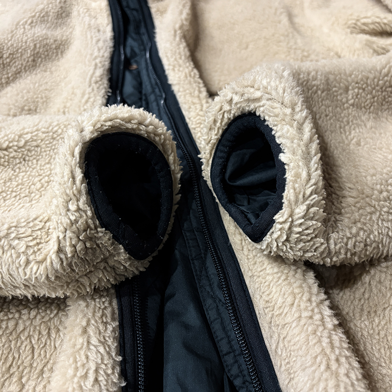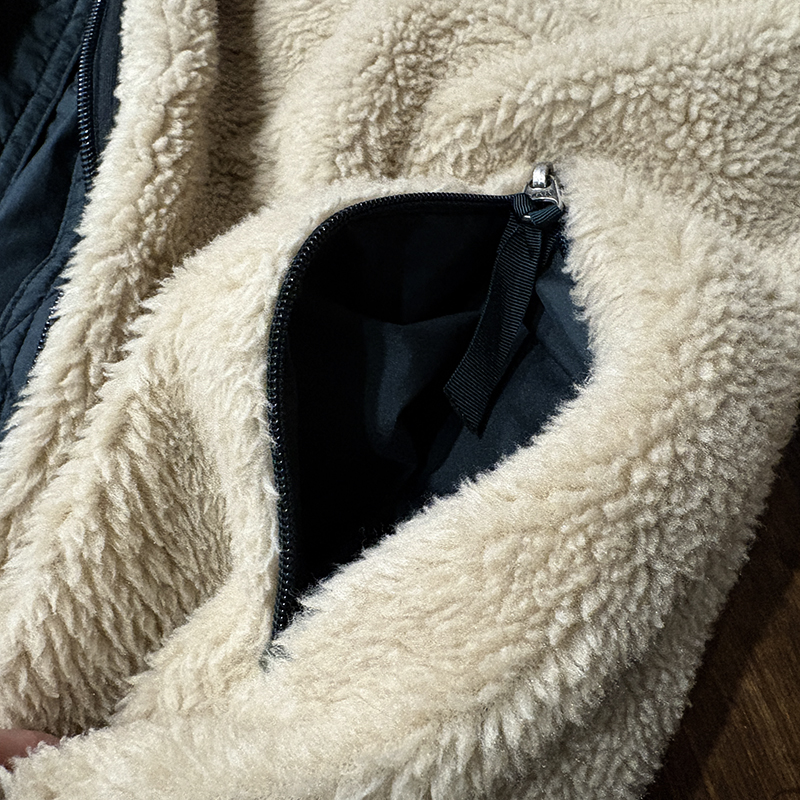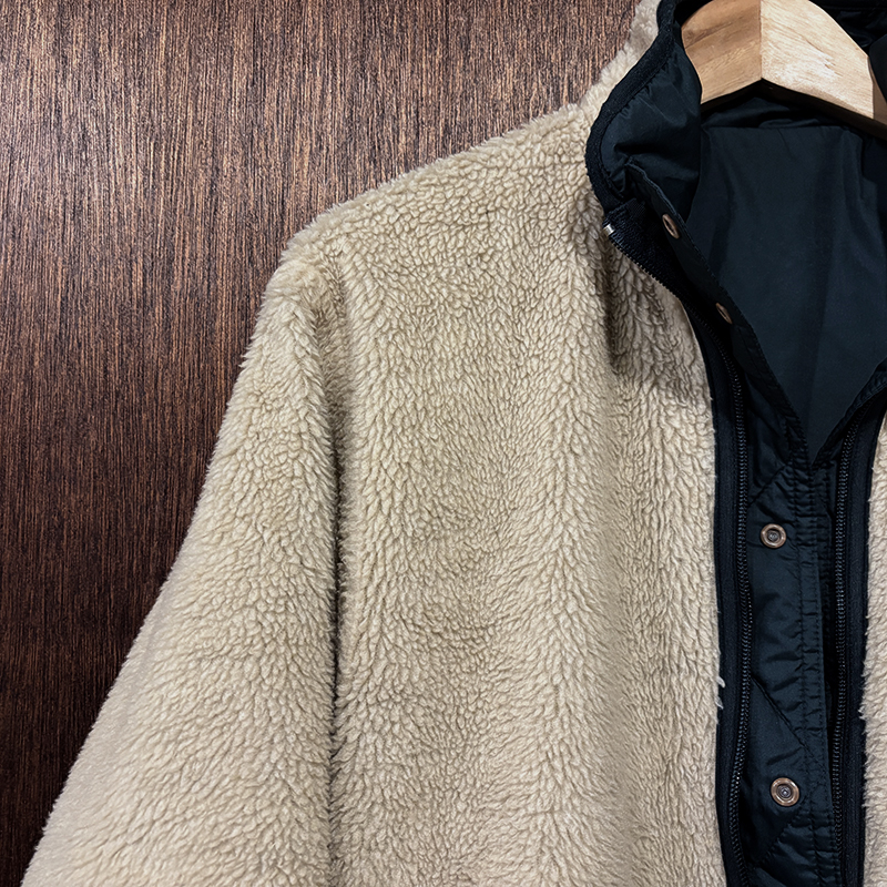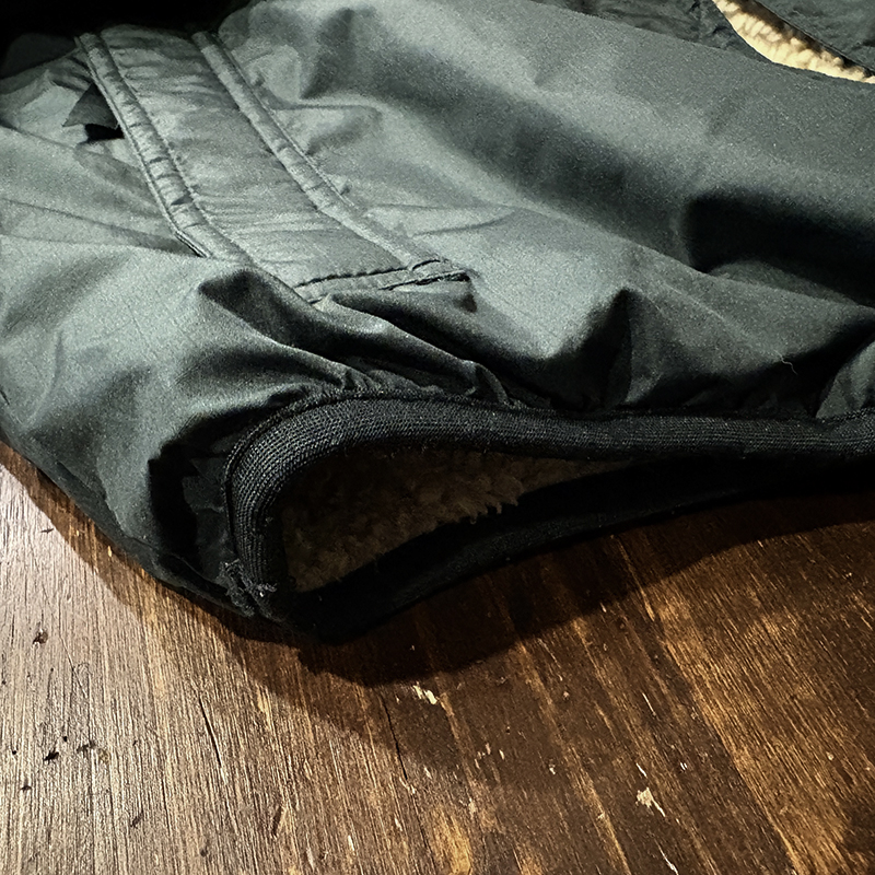 パイルフリースは同社でも定番的なマテリアルでサスティナビリティなペットボトル等資源再生により生み出されており、その毛足の長さから空気を含むことで保温が効き、シェルのリップストップナイロンは破れ等が広がりにくい格子状の補強織が入った軽快なもので且つ防寒性にも長けたスペックとなっています。