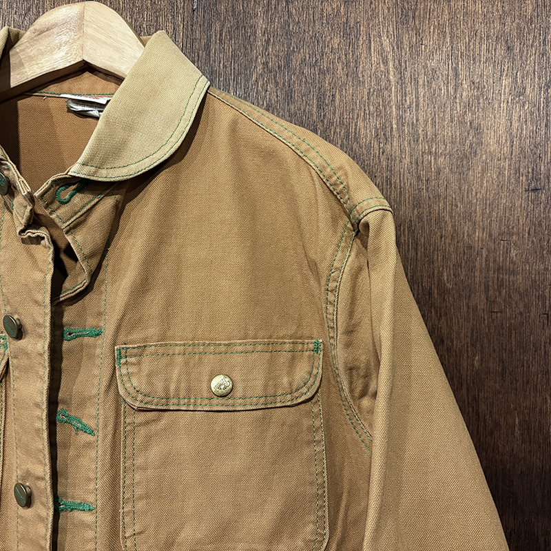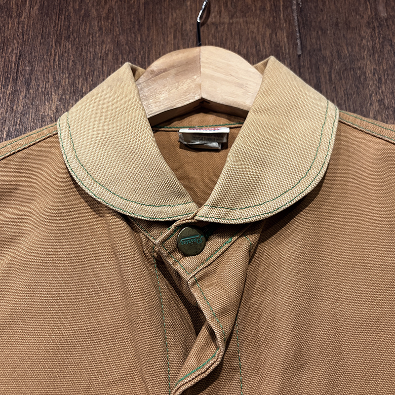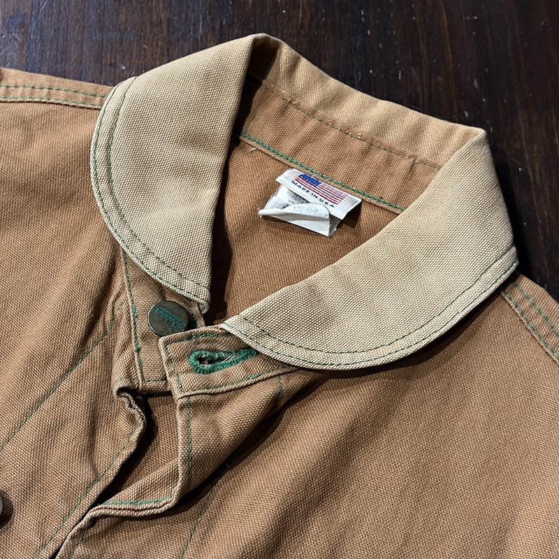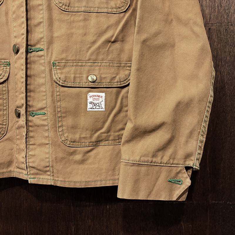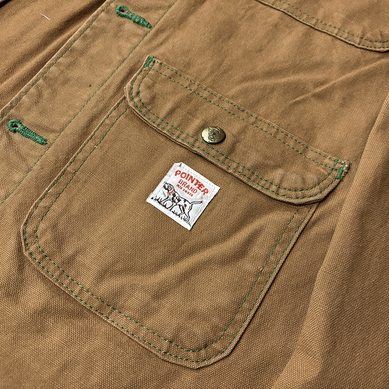 ポインターブランドの希少なショールカラー仕様のダックキャンバスカバーオールチョアジャケット、ステッチもグリーンで統一されており良いアクセントとなっている珍しい一着です、ブラウンダック生地は着込むほどに馴染んでエイジングが楽しめる一着です、アウトドアキャンプやタウンユースにも、是非ご検討ください。