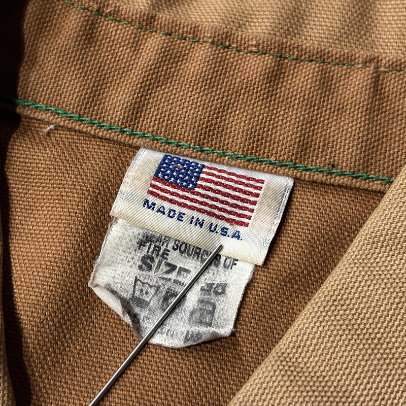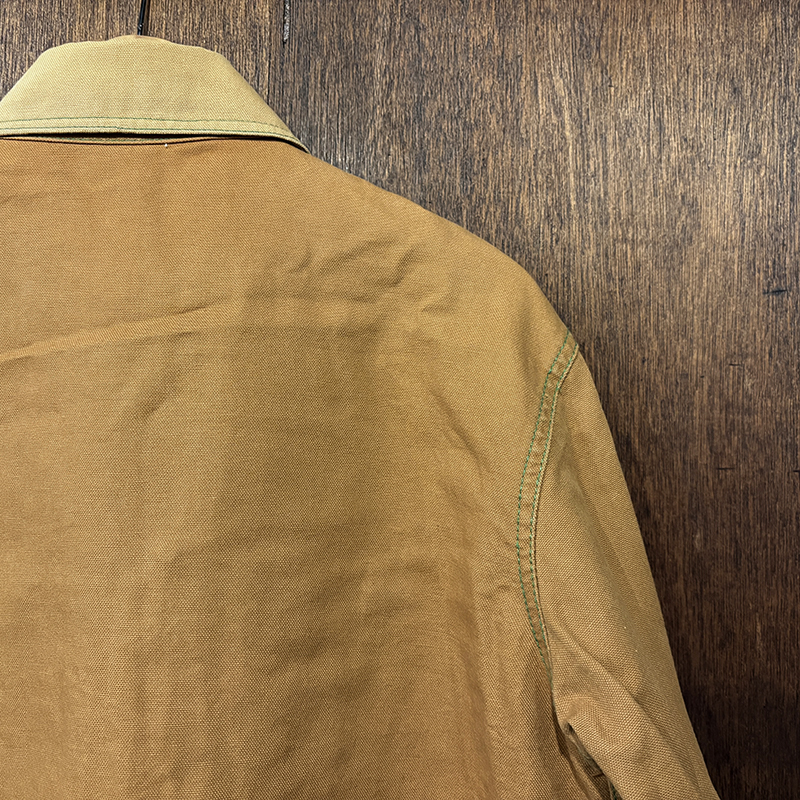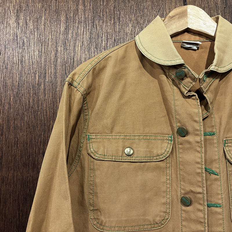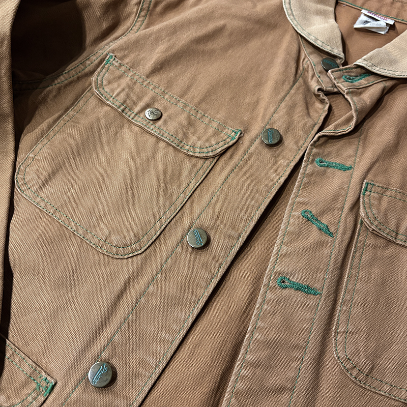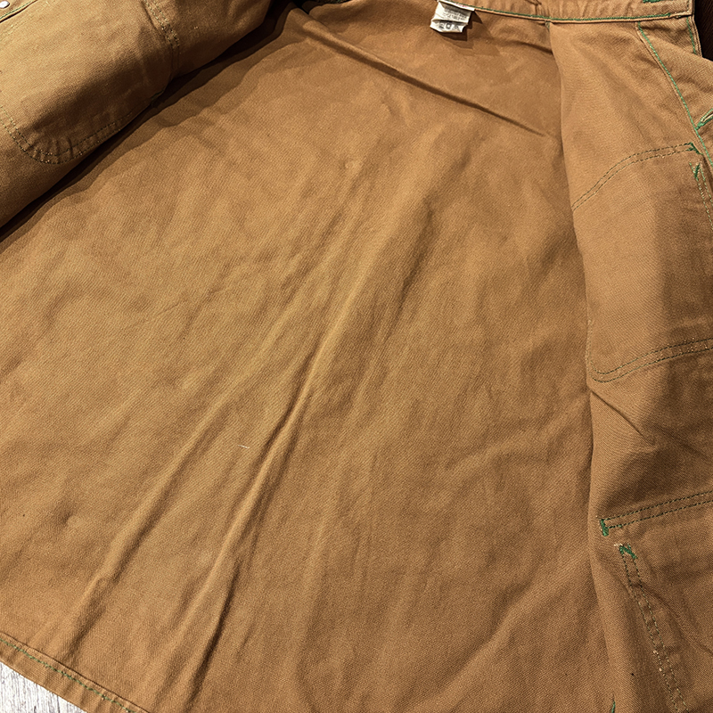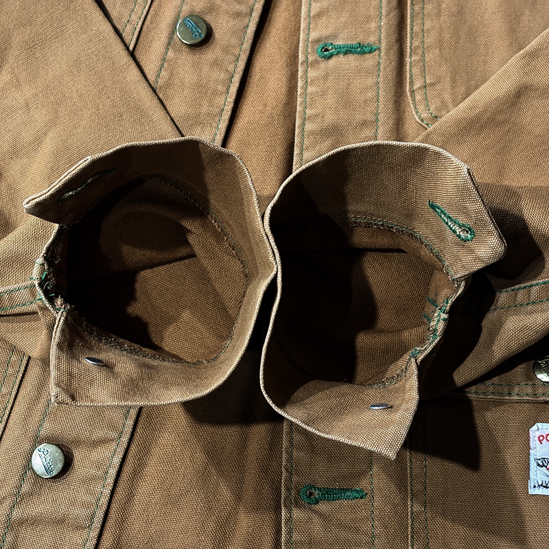 ポインターブランドの希少なショールカラー仕様のダックキャンバスカバーオールチョアジャケット、ステッチもグリーンで統一されており良いアクセントとなっている珍しい一着です、ブラウンダック生地は着込むほどに馴染んでエイジングが楽しめる一着です、アウトドアキャンプやタウンユースにも、是非ご検討ください。