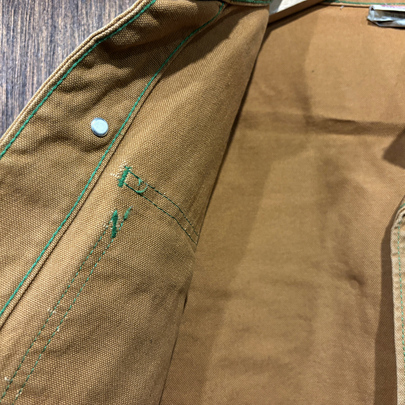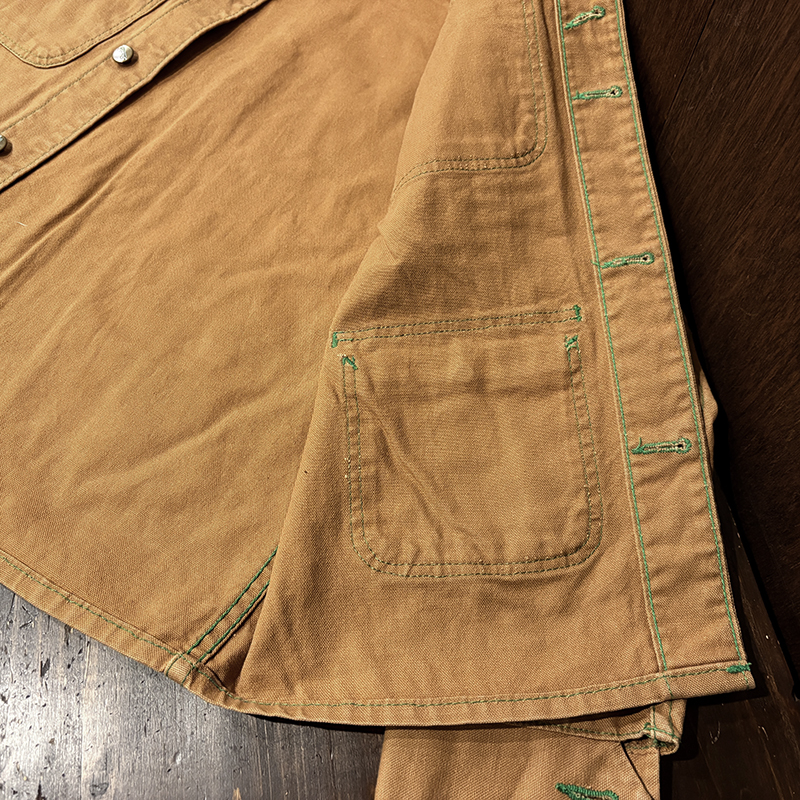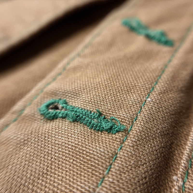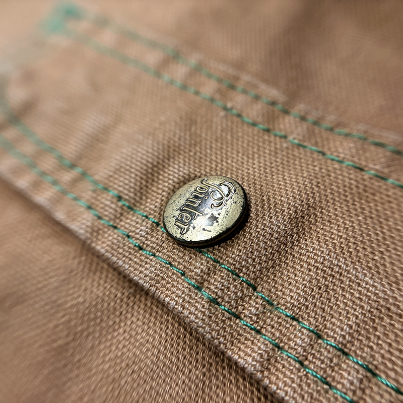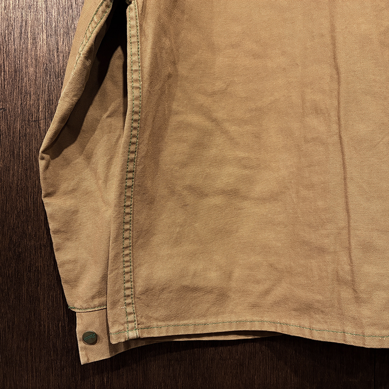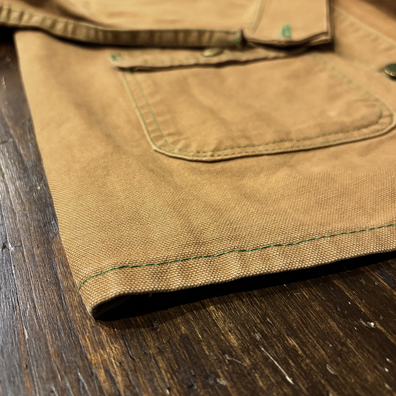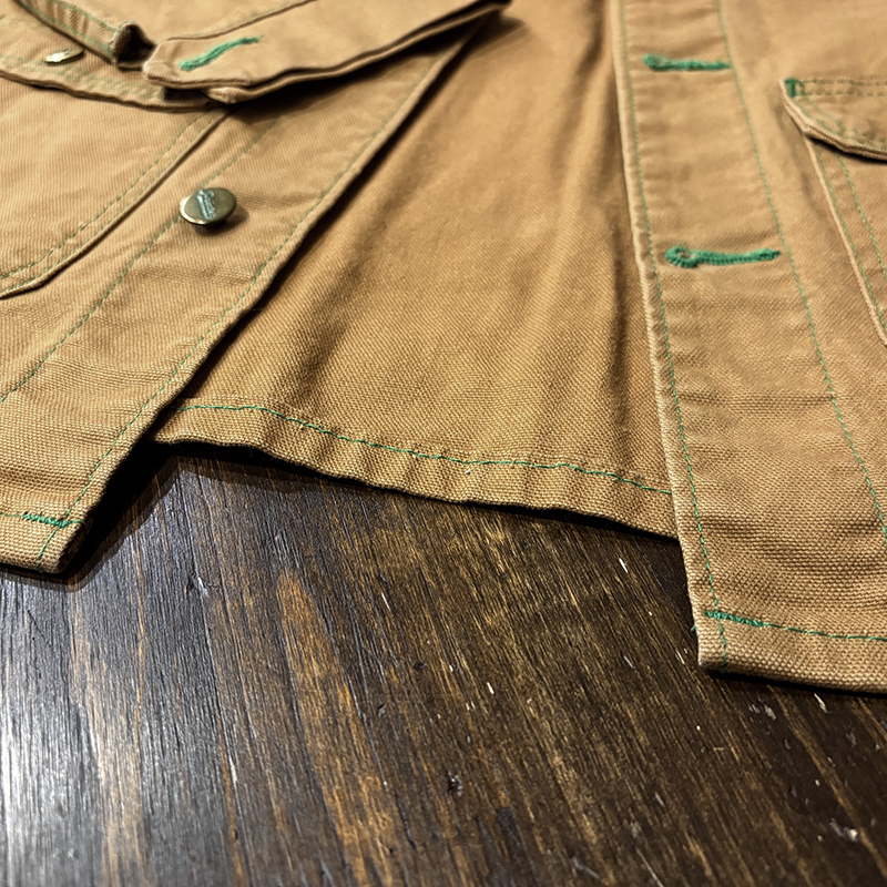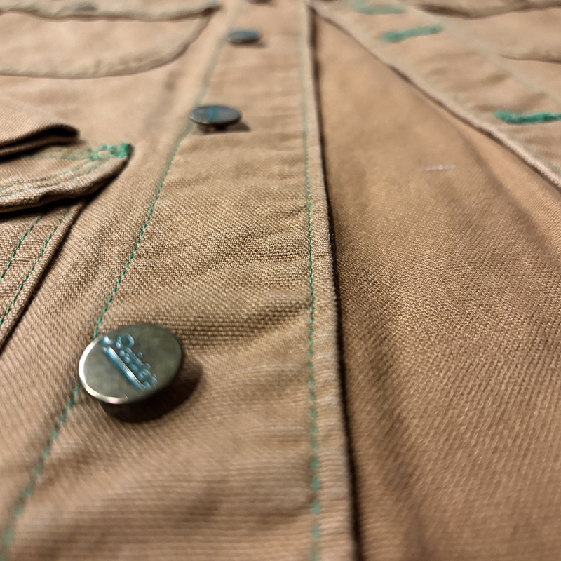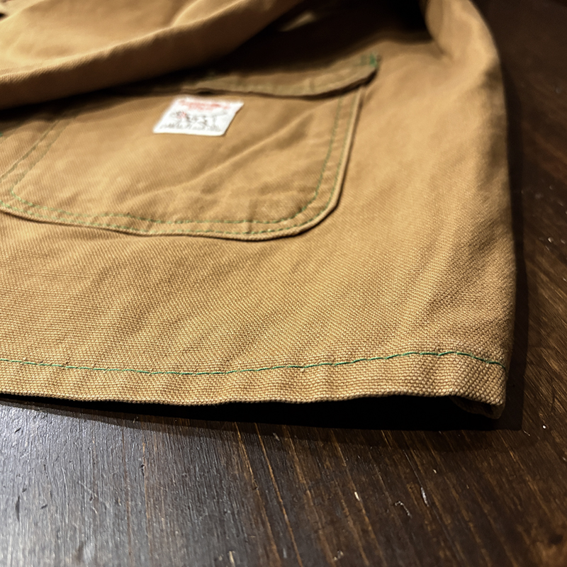 コットンダック生地はしっかりと肉厚で堅牢な質感となっており、ステッチングはじめバータックやボタンホールも全体にグリーンステッチで処理されており、このディテールも大変良いアクセントとなっています。