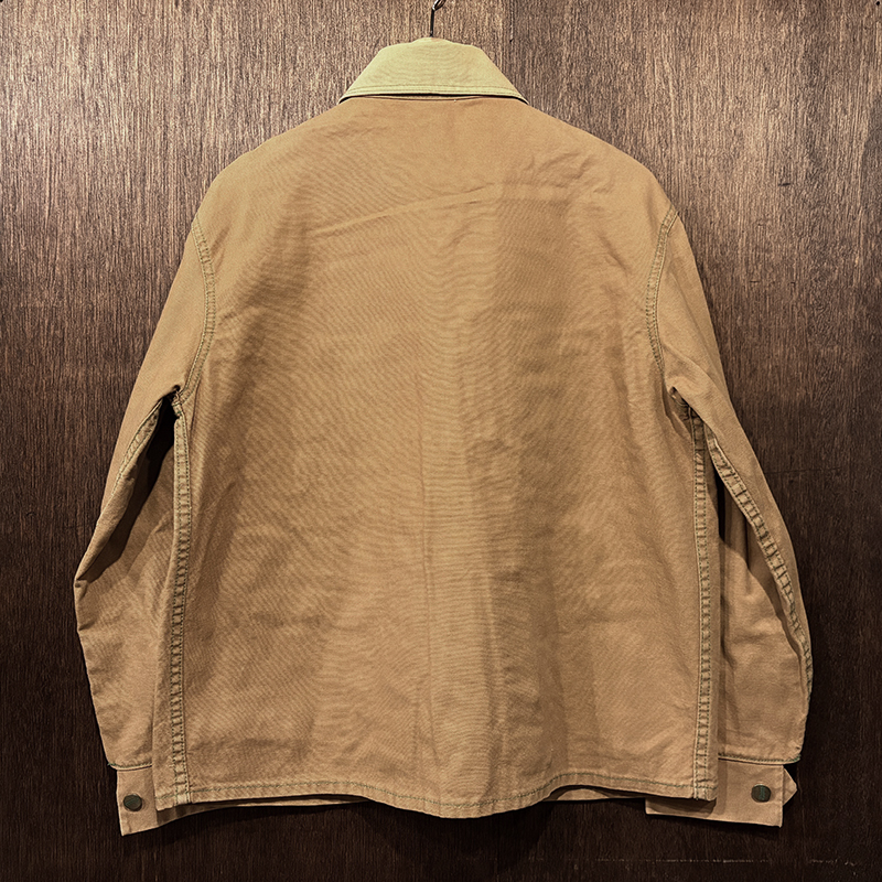 本品はブラウンコットンダック生地によるカバーオール チョアジャケット、そして特徴としてはショールカラー仕様のデザインが採用された独特の雰囲気を持った希少なモデル、ショールカラー部分はタンカラーのコーデュロイで切り返されており、小ぶりのヘチマ襟なのできた際の首周りがすっきりっとした良い雰囲気の一着となっています。