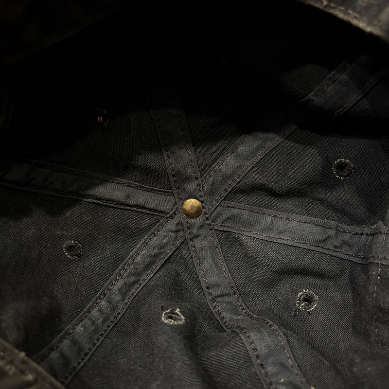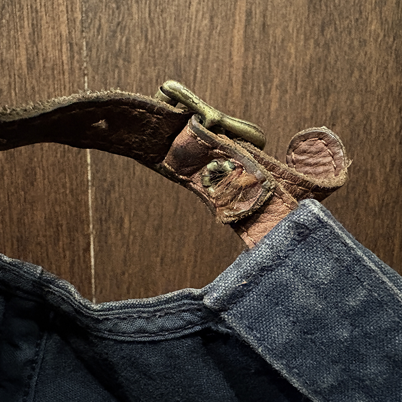素材は落ち着いたネイビーカラーの丈夫なダックキャンバスコットンで生地の堅牢性があり、使い込むうちにアタリが出やすい素材となっています。