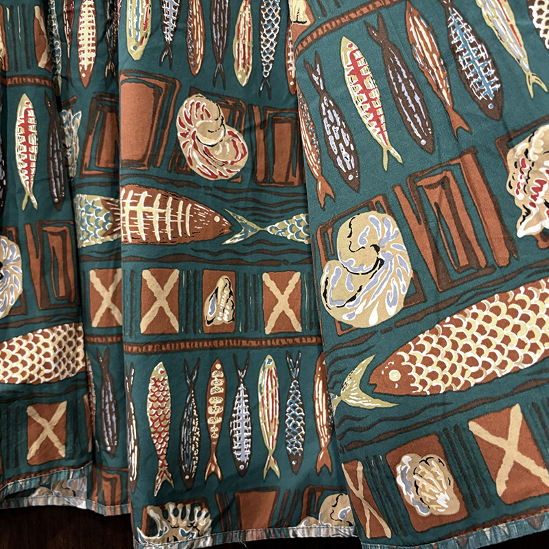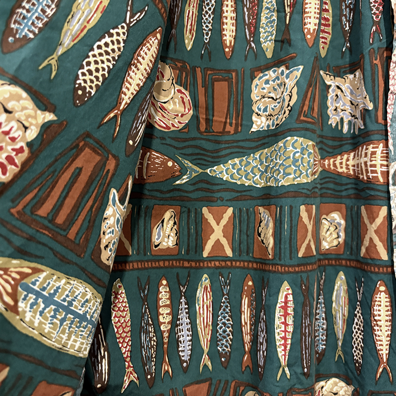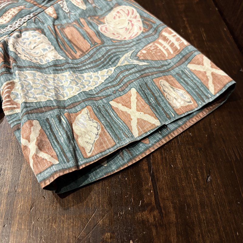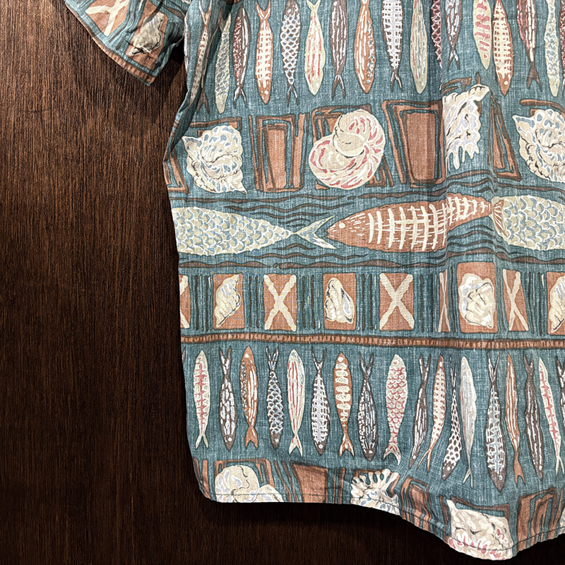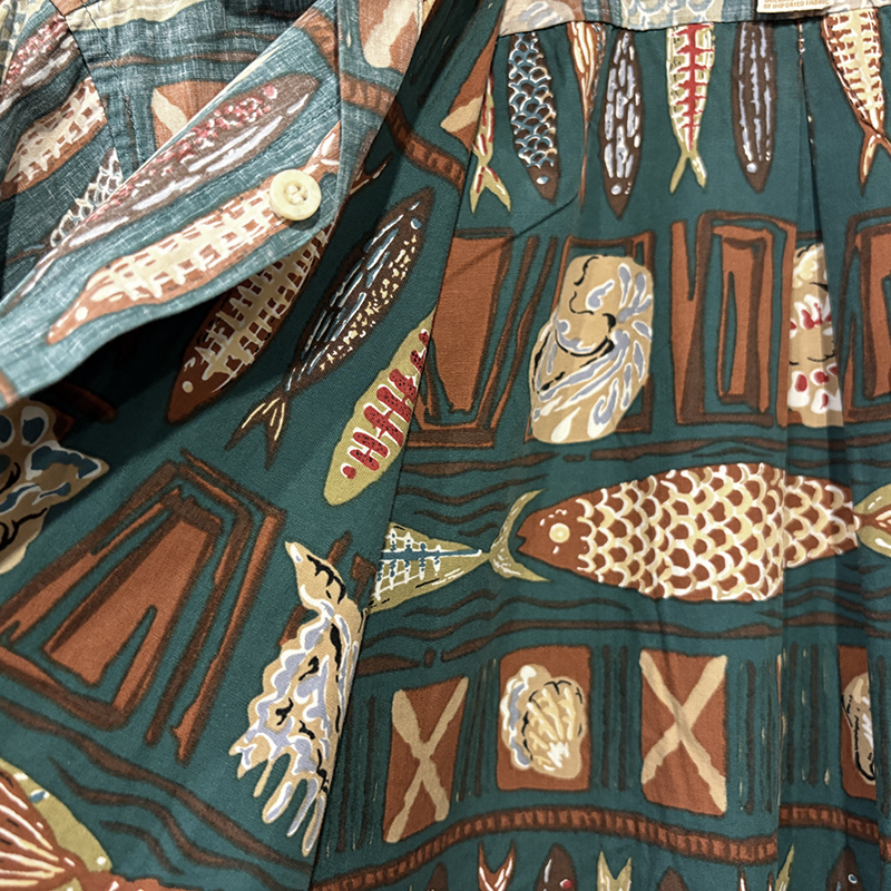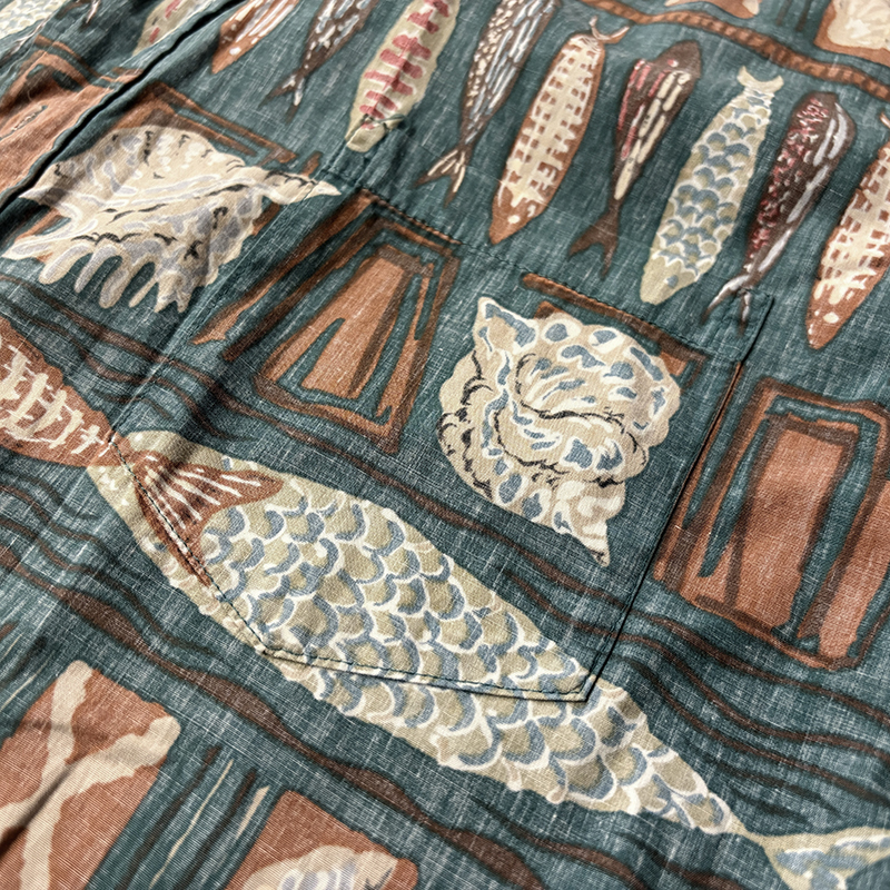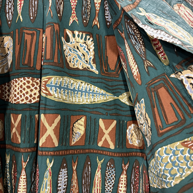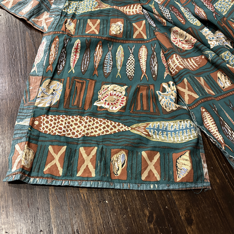 生地柄は大小の魚や貝などがフレーミングでレイアウトされた素朴なタッチのデザインパターンとなっており、グリーンベースにブラウントーンのコンビカラーで大変クラシカルな幅広い年齢で合わせやすい印象の一着です。