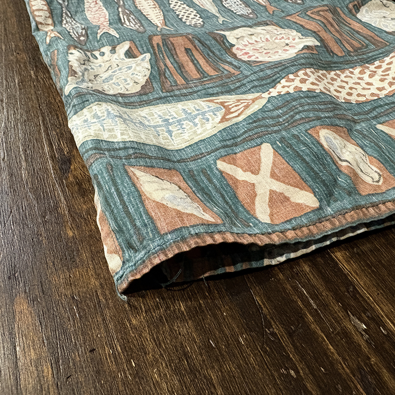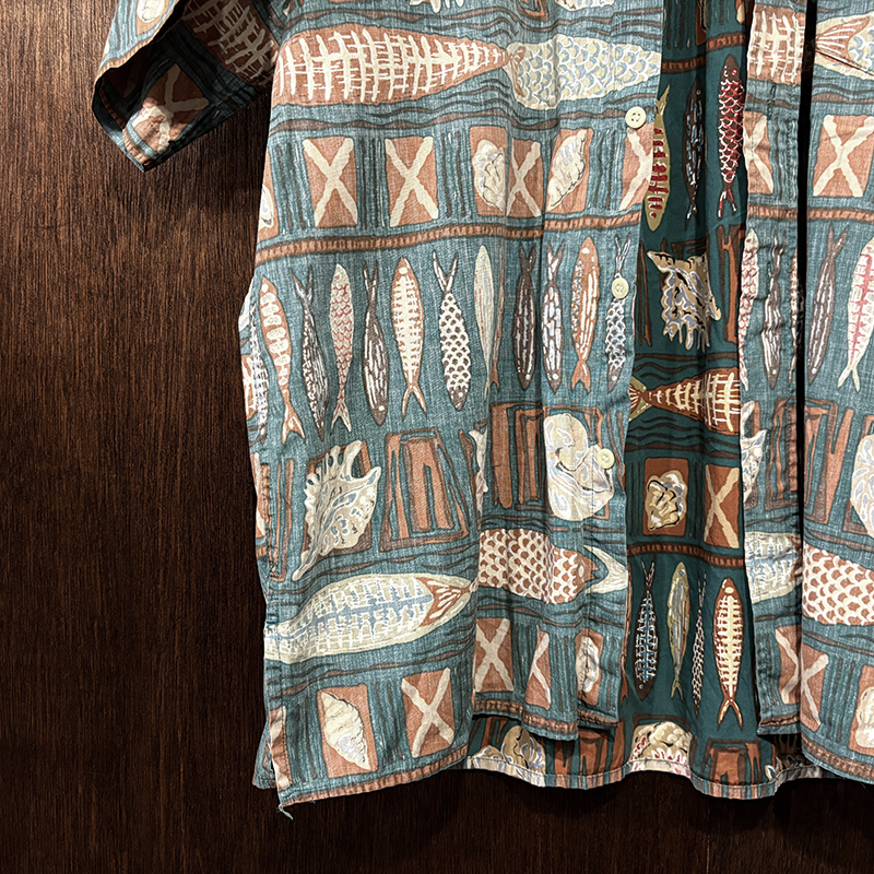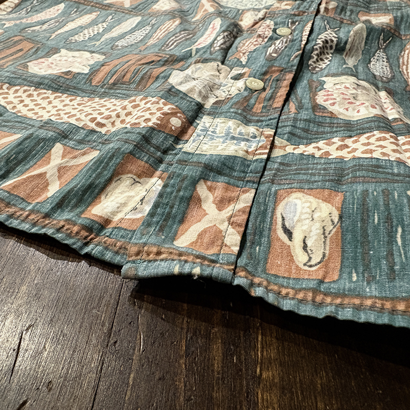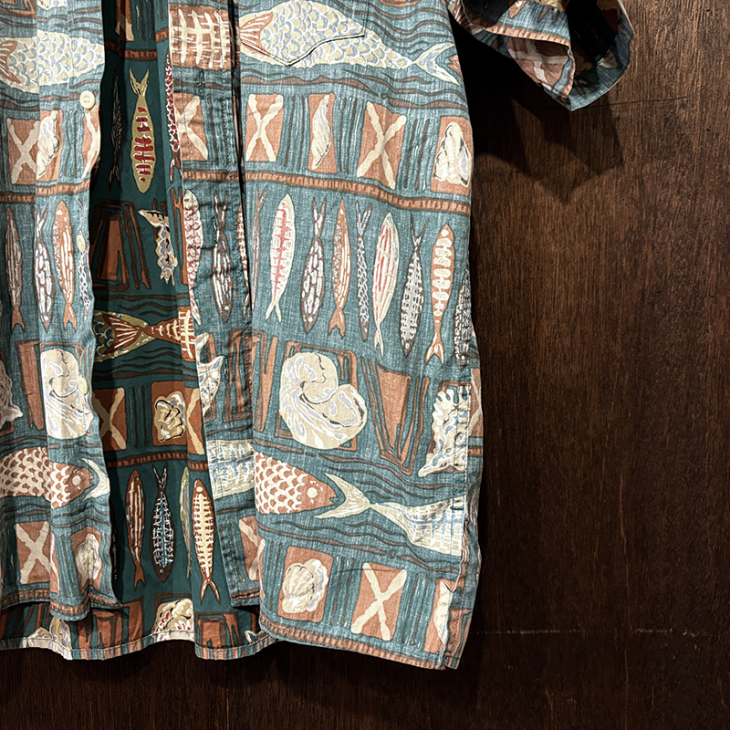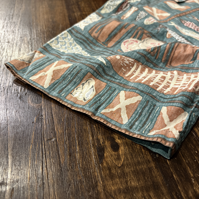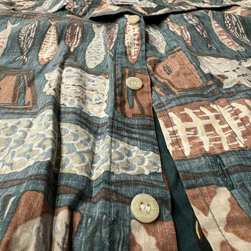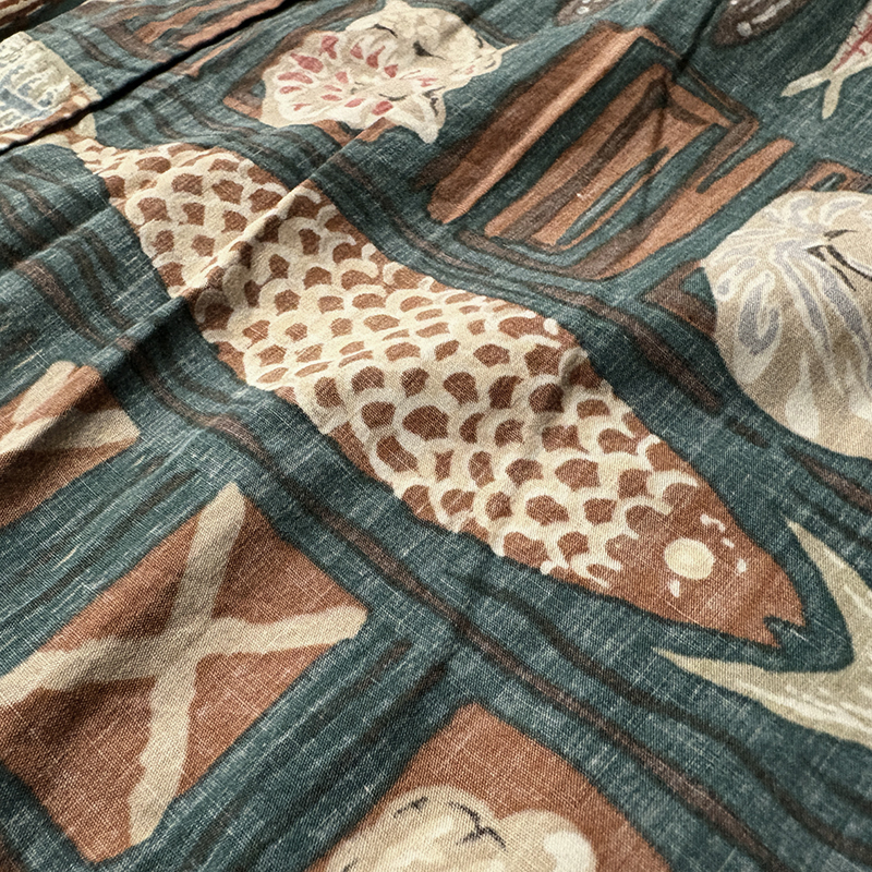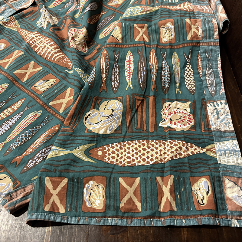 生地柄は大小の魚や貝などがフレーミングでレイアウトされた素朴なタッチのデザインパターンとなっており、グリーンベースにブラウントーンのコンビカラーで大変クラシカルな幅広い年齢で合わせやすい印象の一着です。
