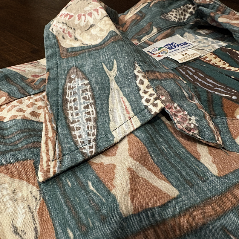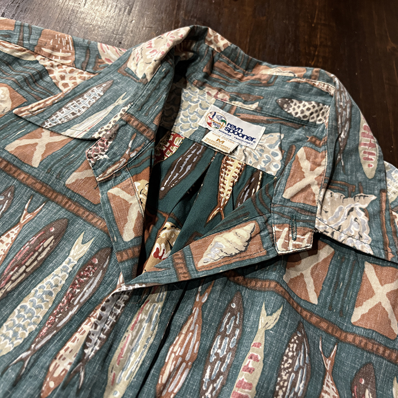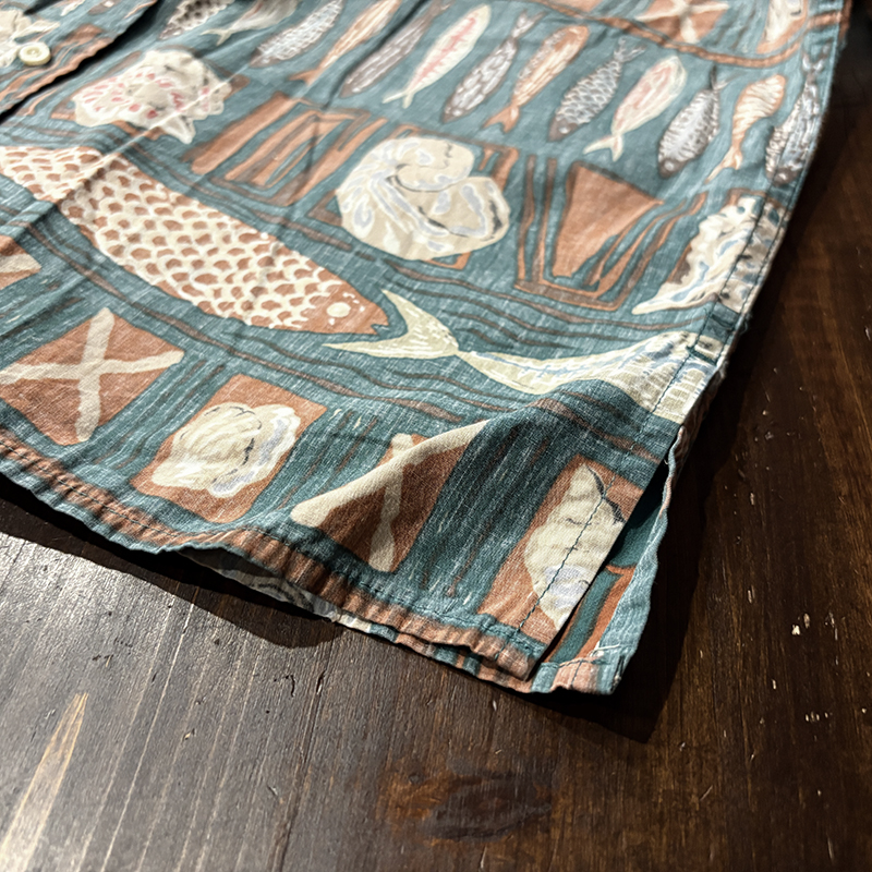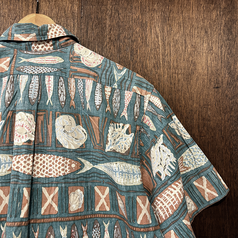 Reyn Spoonerらしいスープナーバッククロス仕様で魚や貝が印象的なフレーミングで区切られた良いデザインのコットンアロハ、数多あるパターンの中でも良いデザインの一着、アウトドアシーンはじめタウンユースにもおすすめです、是非ご検討ください。