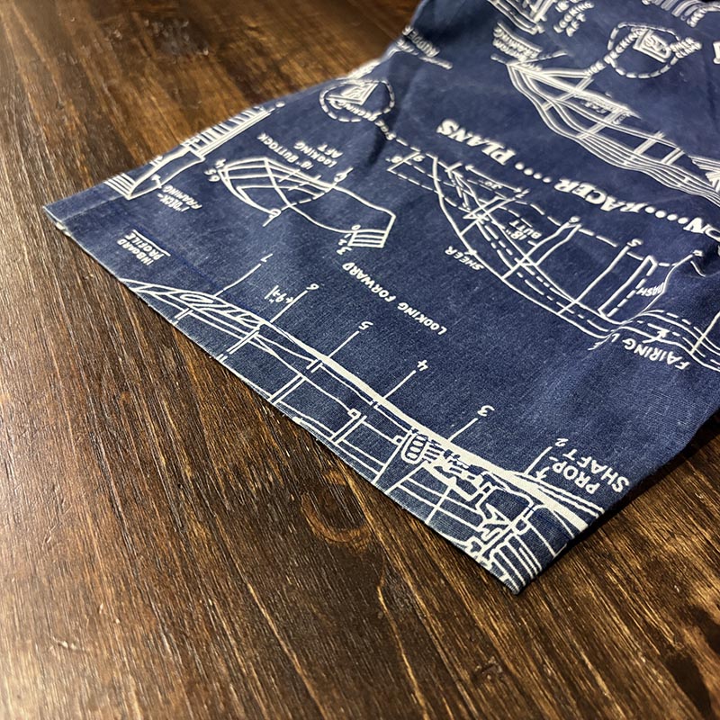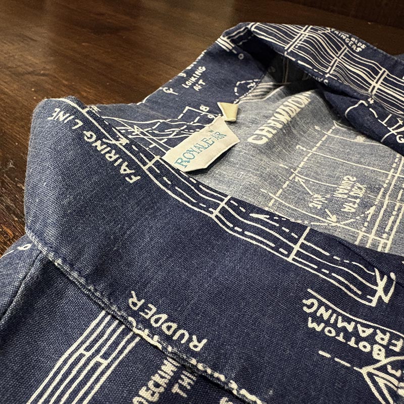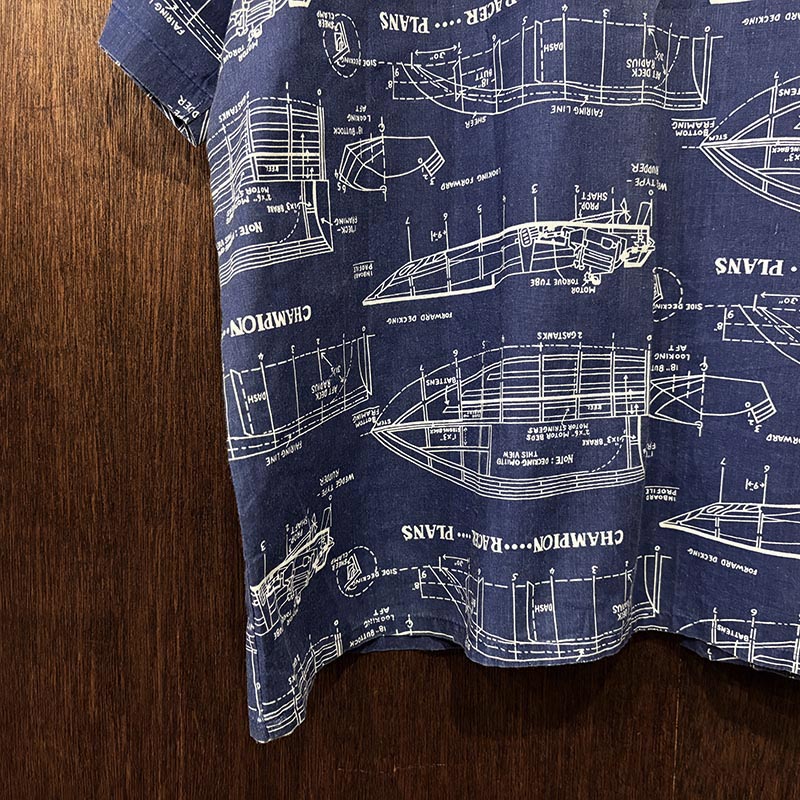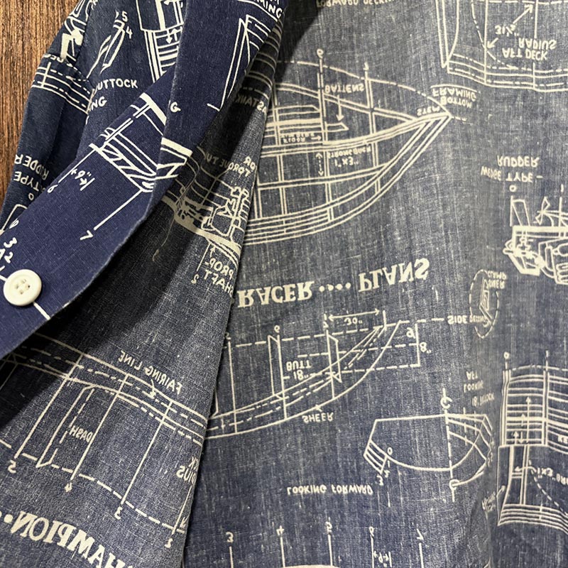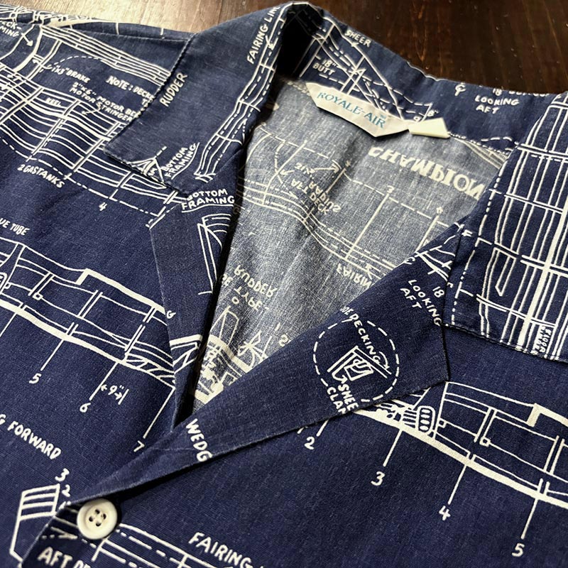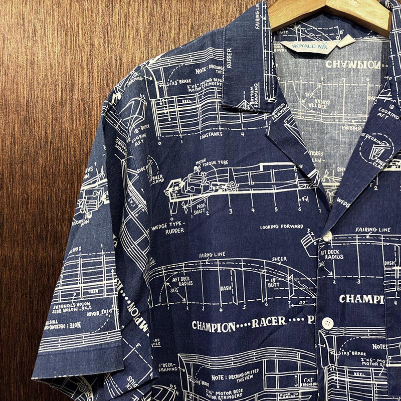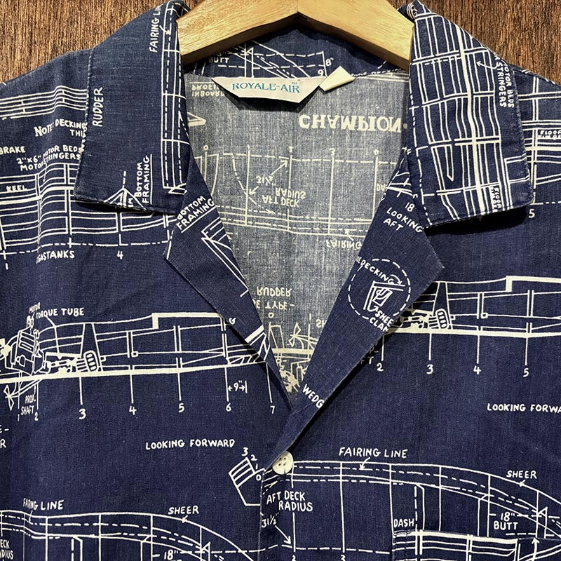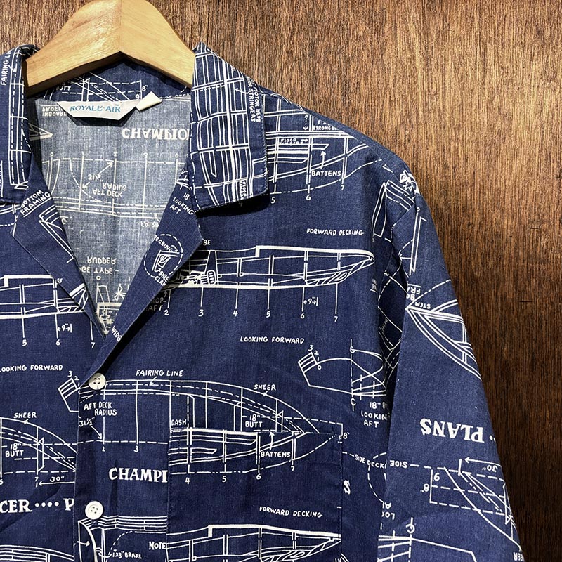 本品は三角タグ刺繍のおおよそ70sあたりのUSA製と推測されるRoyale-Airのコットンの生地感の良いプリントアロハシャツ、襟元はオープンカラー仕様で、全体のつくりも着丈が短めのボックスシルエット、生地のパターンはネイビーベースにホワイトで船舶の設計図がプリントされた大変シック且つ可愛らしいデザインが魅力の一着です。