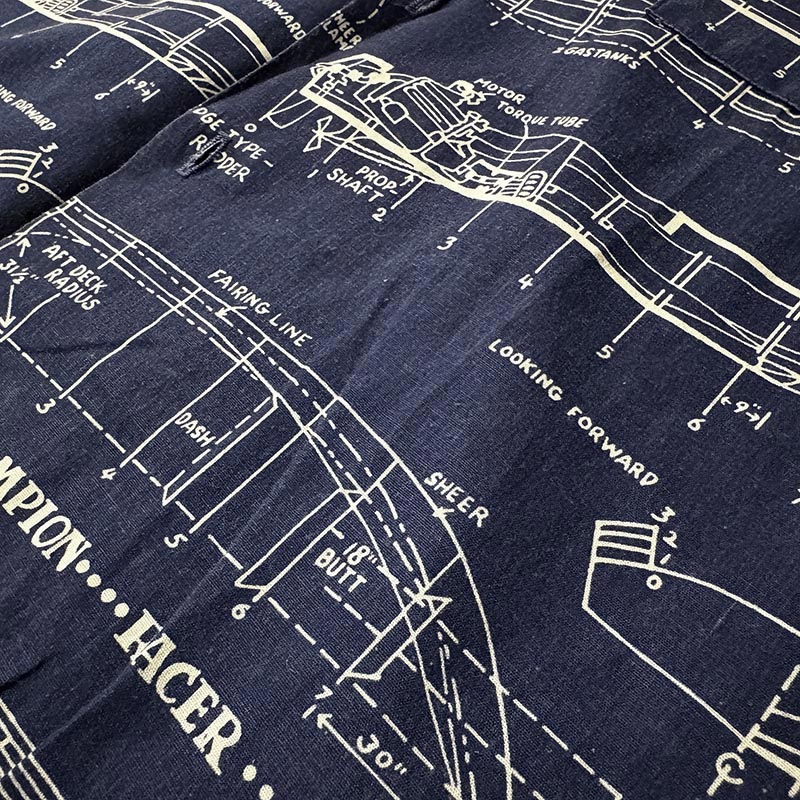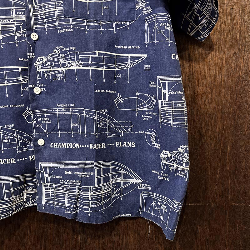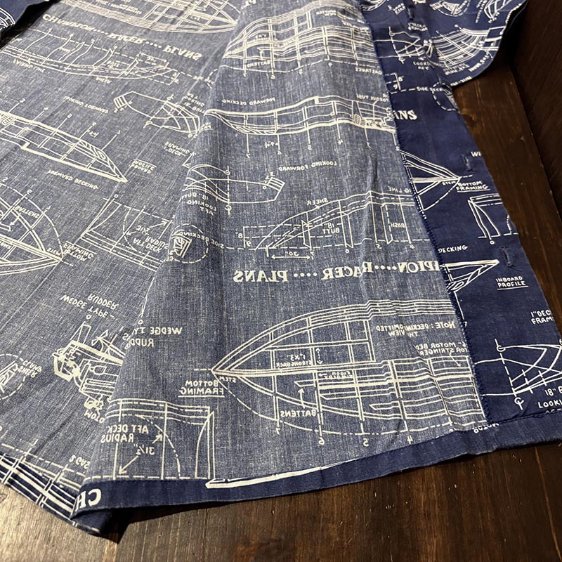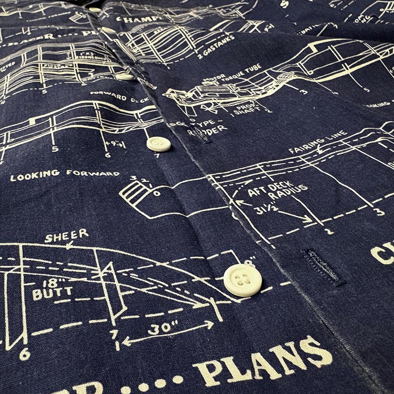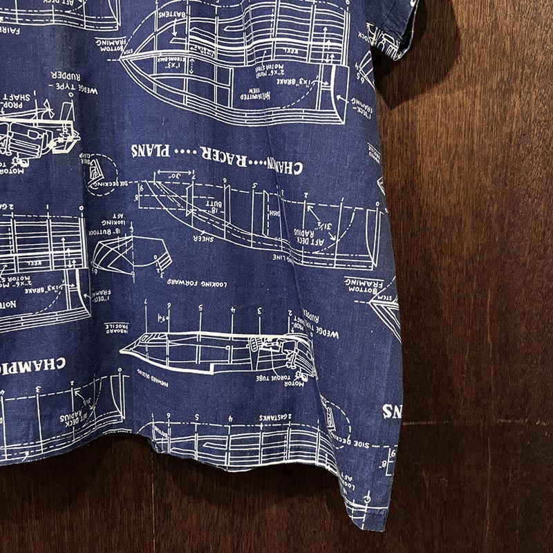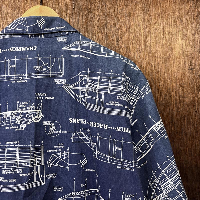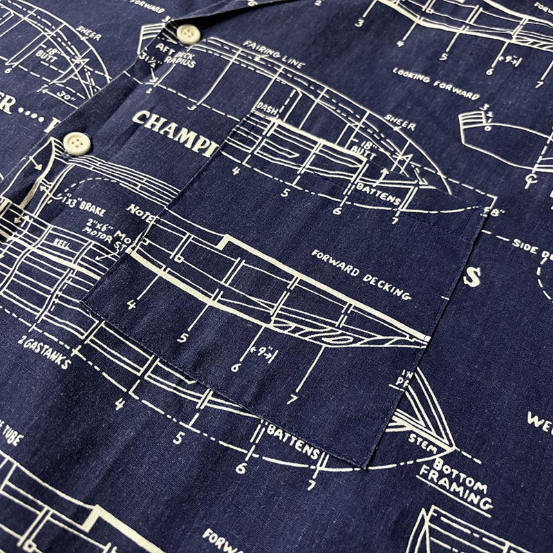 船舶設計図の全面デザインが希少且つ印象的なプリントのオープンカラーアロハシャツ、サイズ感も大きく幅広い方にゆったりと合わせていただける一着です、夏のフィッシングシーンはもちろんアウトドアシーン及びタウンやバカンスにも、是非ご検討ください。