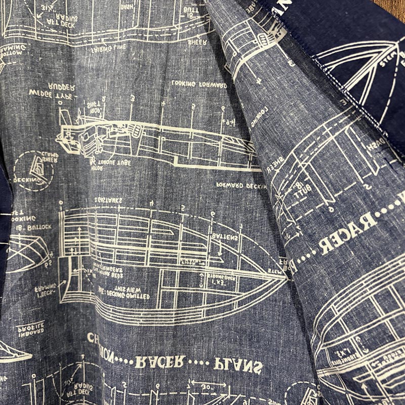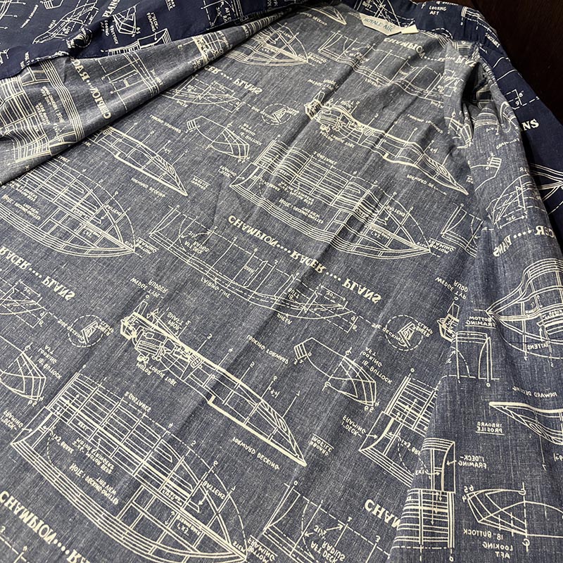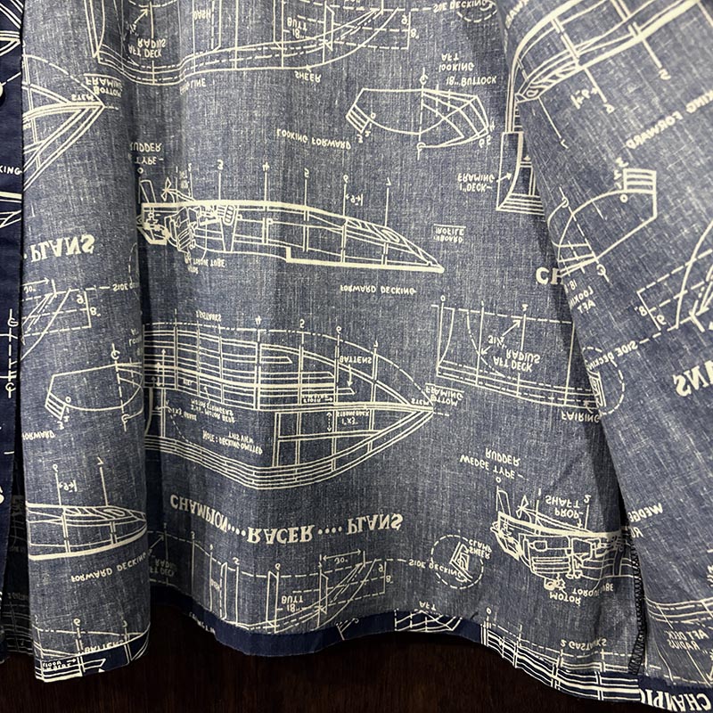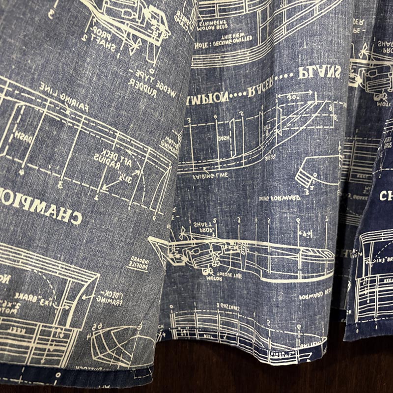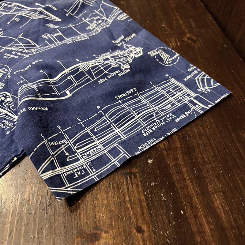 生地感も適度に張りがありしっかりとしており、プリントもしっかりと色味が綺麗に残り、設計図の図柄も線の微妙な強弱など細かなディテールのデザインがクラシックな雰囲気をシャツに与えています。