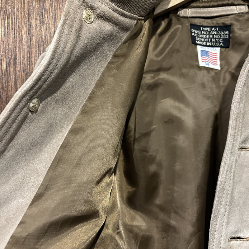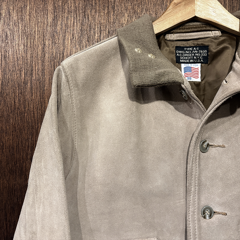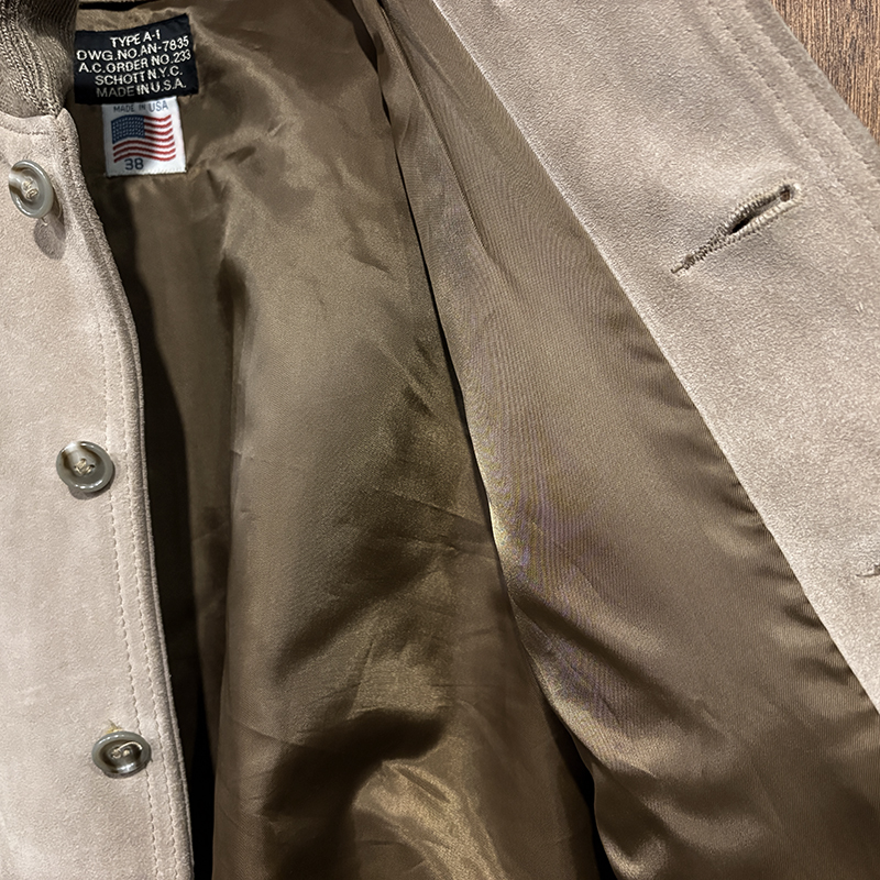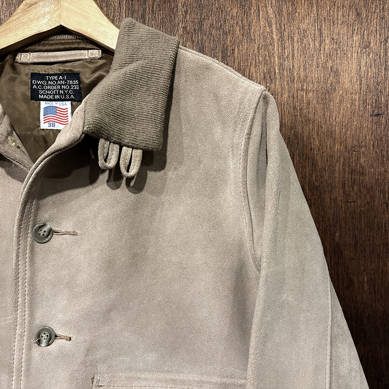 オールドのSchottモデルでも大変希少なタイプA-1のスエードレザーフライトジャケット、80sあたり特有の同社らしい非常に肉厚で堅牢なレザーが魅力の重厚な一着、まさに一生ものといえるスエードジャケットとしておすすめできるジャケットです、是非ご検討ください。