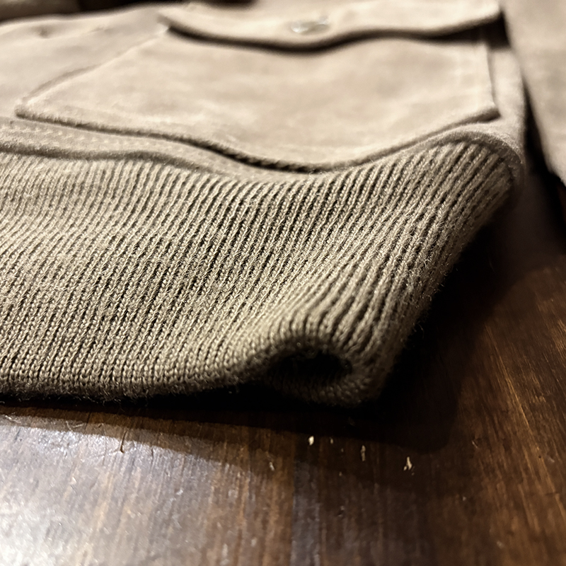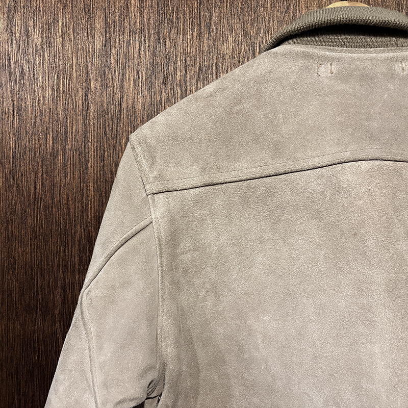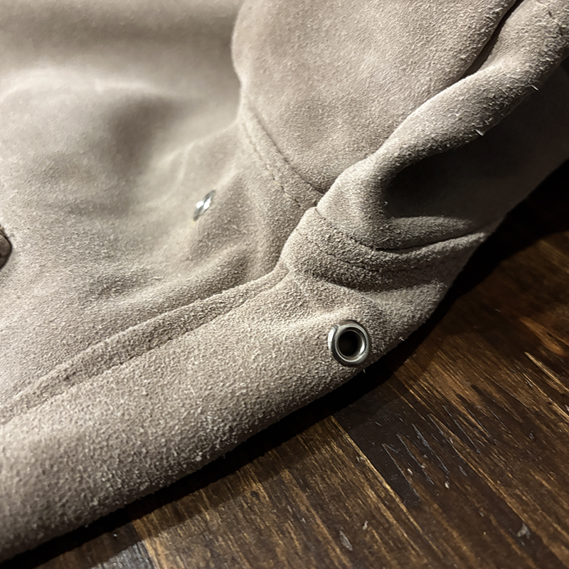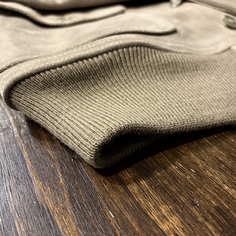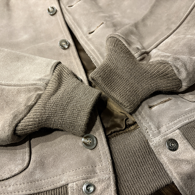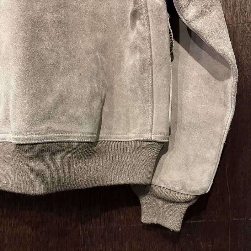 カラーは落ちついたスエード特有のサンドブラウンにリブ周りはモカブラウンのツートーン、スエードレザーは起毛などのアタリによって良い陰影のエイジングが望める独特の風合いとなっています。