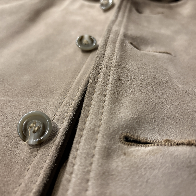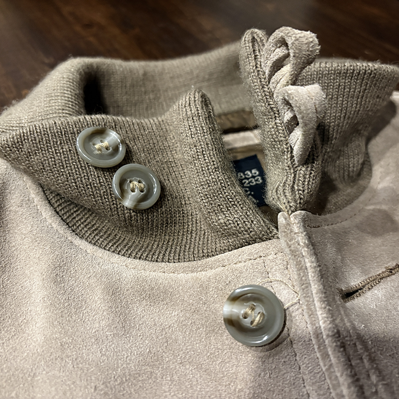 状態は、経年の使用と保管によるスエードレザー表面のわずかな擦れやくすみ、リブ周りの細かな毛羽立ちや毛玉こそ見られますが、画像からもご覧いただけるようにトータルでもスエードレザーは極めて肉厚で腰がありクリーンな状態を維持しており、ライニングはじめボタンやホックトップなどのパーツ全般も非常に良好で、これからも末長くエイジングを楽しんでいただける非常に使用感の浅いミントコンディション相当の一着となっています。
