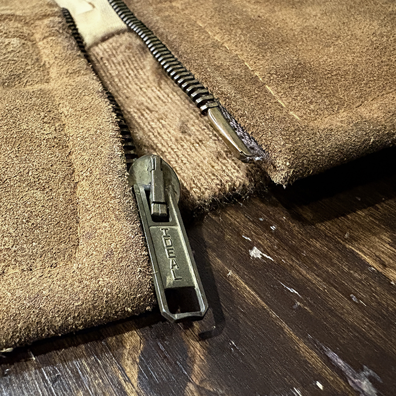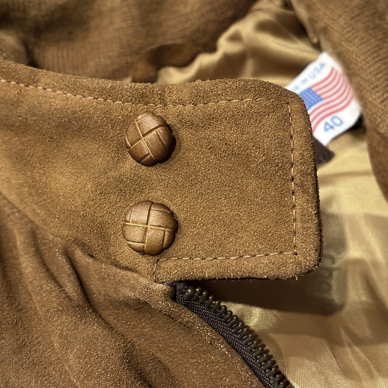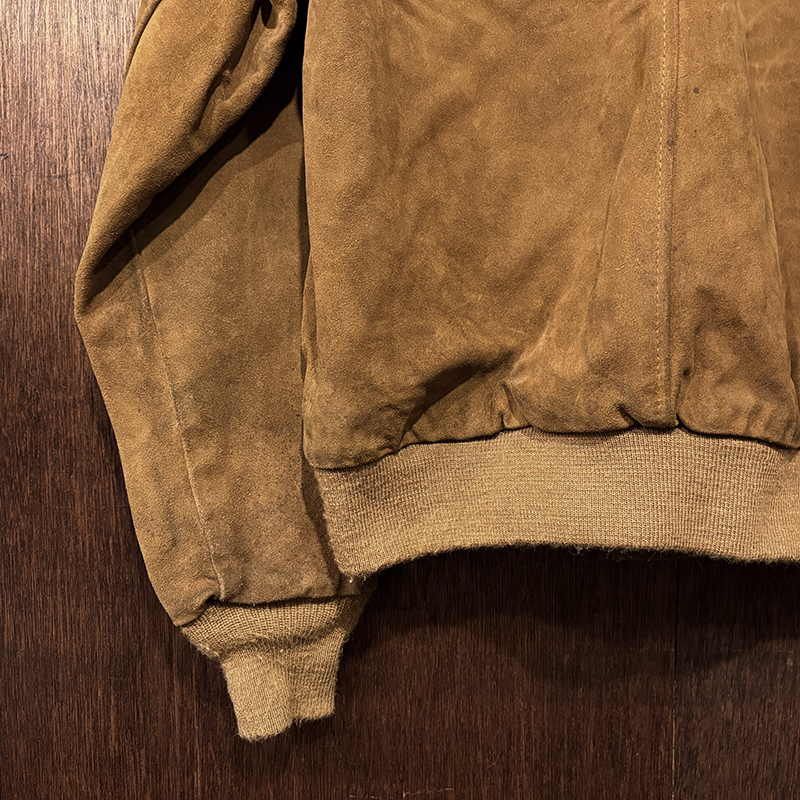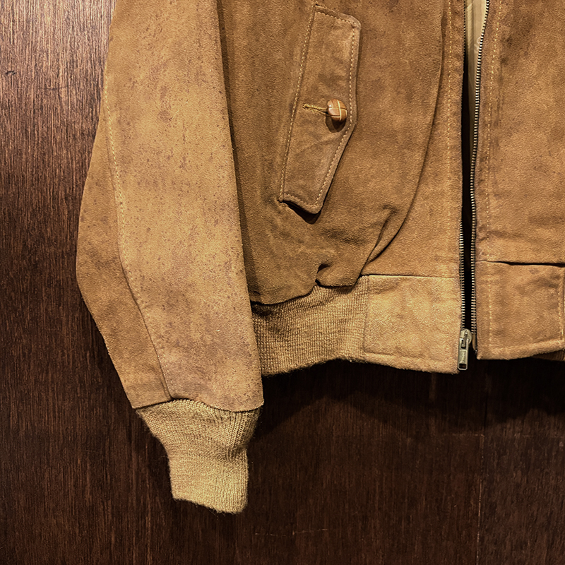 状態は、経年の使用と保管によるスエードレザーの表面的なシミや汚れ、そしてエッジの擦れやくすみ、リブ起毛の毛玉などの繊維フケこそみられますが、スエードレザーもしっかりと堅牢な状態を維持しており、各部の傷みやすい襟周りやポケット、裾周りも良好で、ライニングも大変良好な状態、オールドのIDEALジッパーも開閉はスムーズ、まだまだ末長くご愛用いただける堅牢な一着となっています。