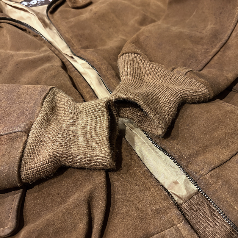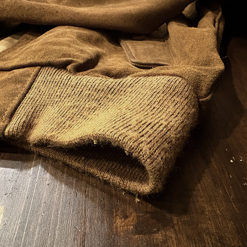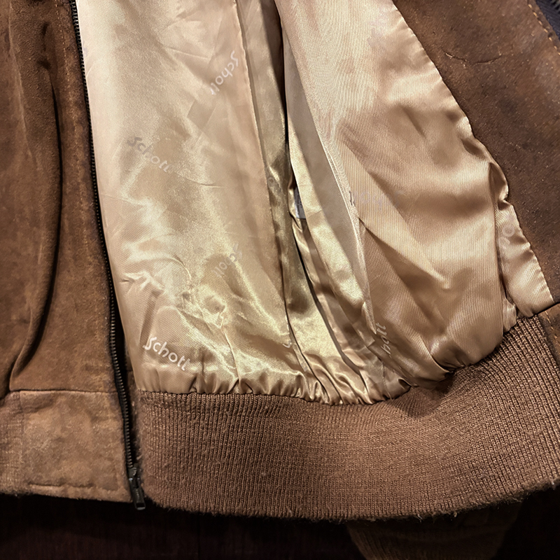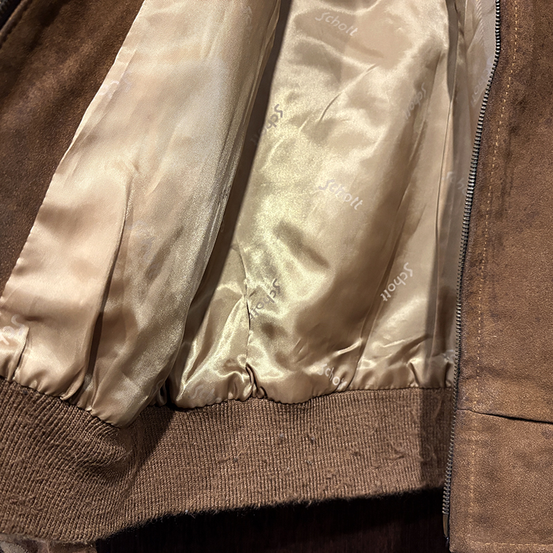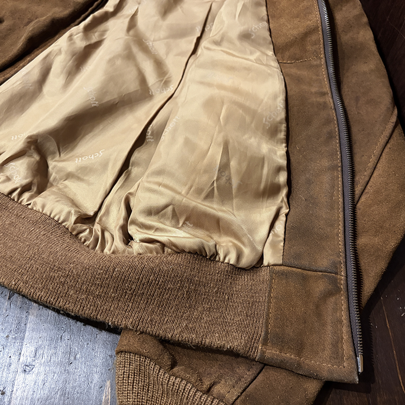 スエードレザーはショットらしい肉厚なブラウンスエードとなっており、一般的にこの手のスエードブルゾンはレザーが薄いものが多い印象ですが、ショットならではのしっかりとしたヘビースエードといえるリアルレザー使いで、経年変化が着込むうちに期待できる一着です。